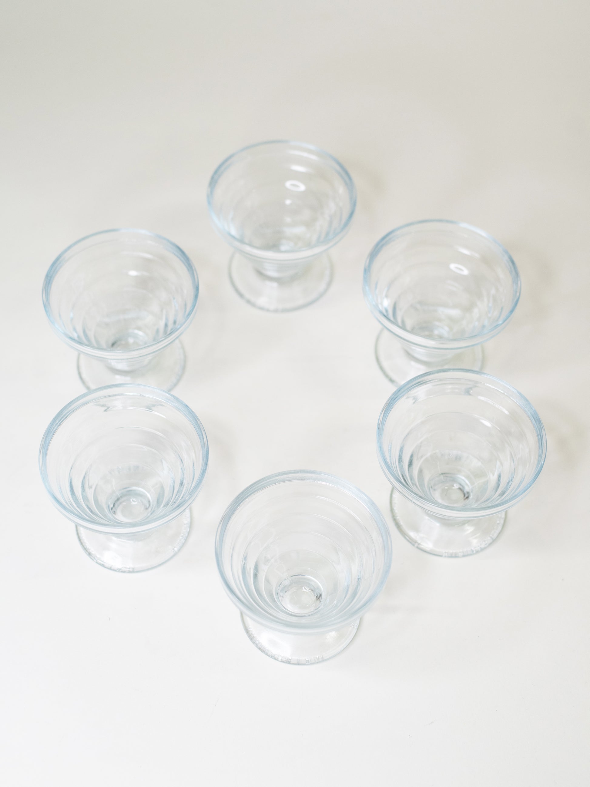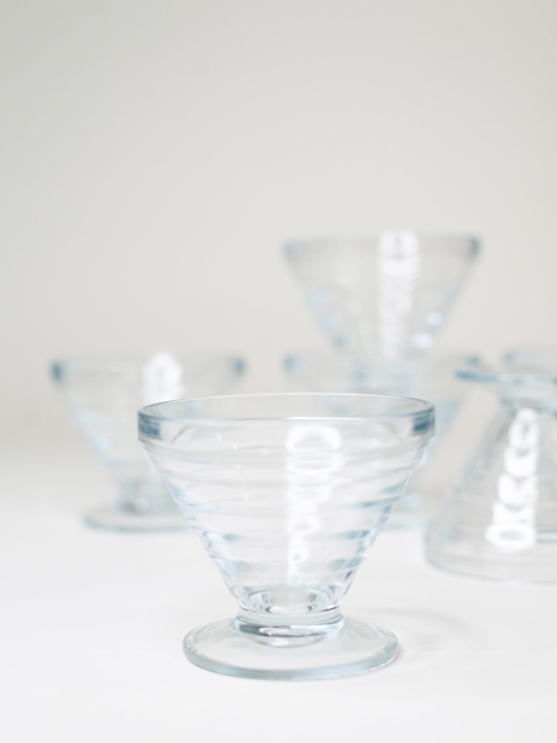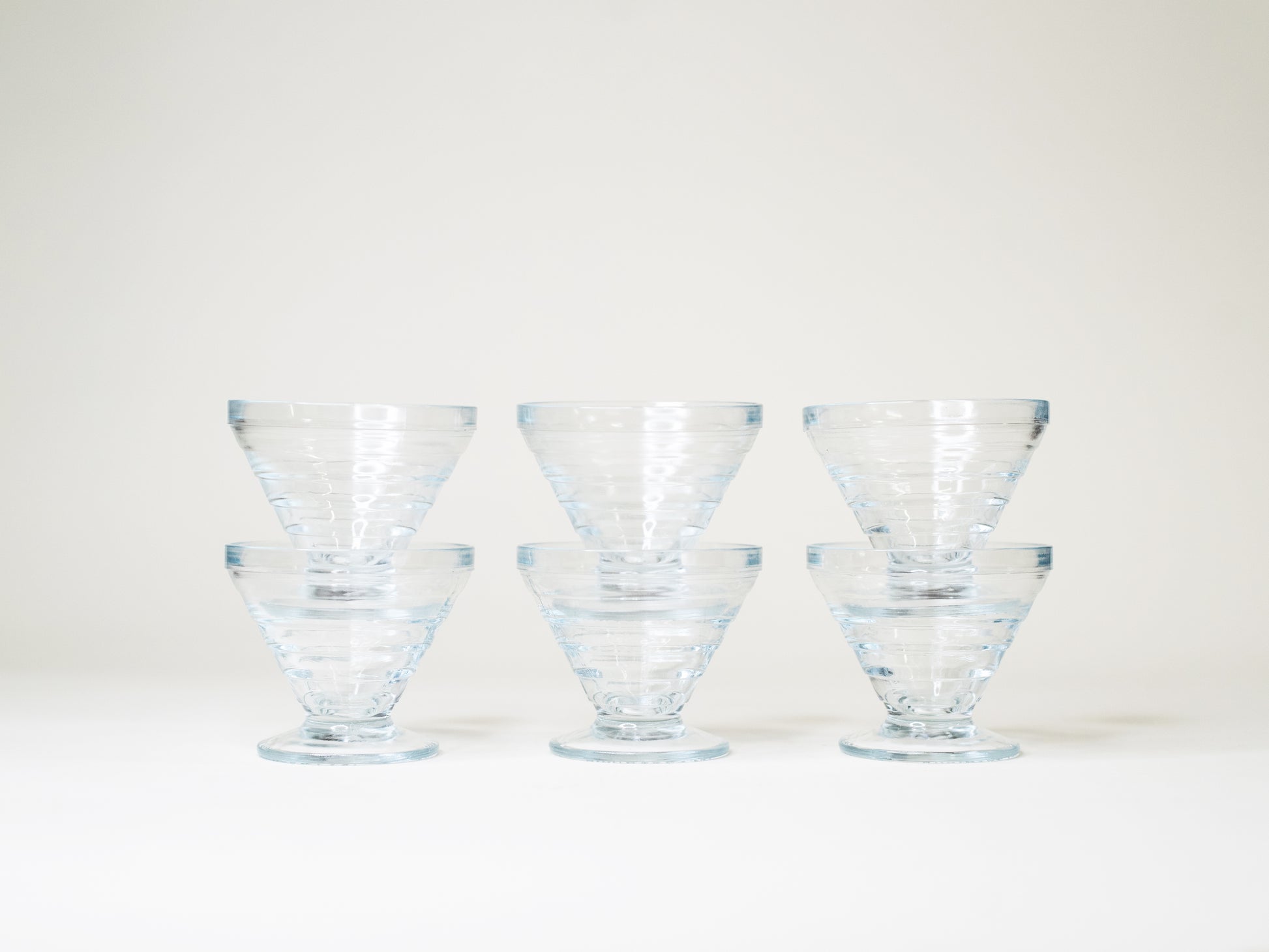 A complete set of six pressed-glass dessert cups designed by Aino Aalto for Riihimäen Lasi. Clear glass that shifts subtly towards blue in certain light, with ridged, conical forms that feel as fresh now as when they were first designed.