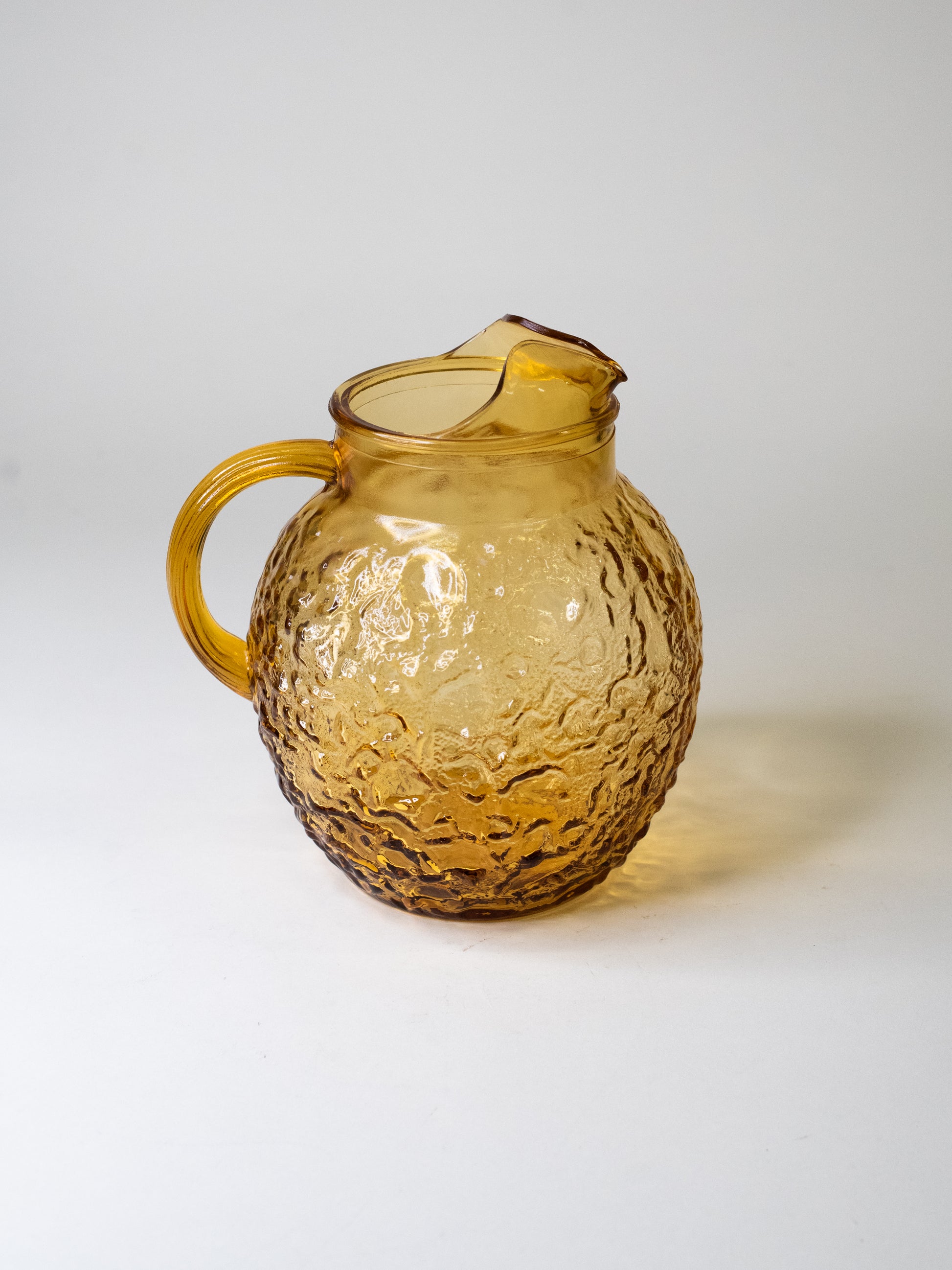 Bold, bubbly, and built to last, this large vintage pitcher is made from textured pressed glass in rich amber, with a satisfying crinkle surface that plays beautifully with light. The round form, sturdy handle, and practical ice lip make it a standout piece for both display and everyday use.