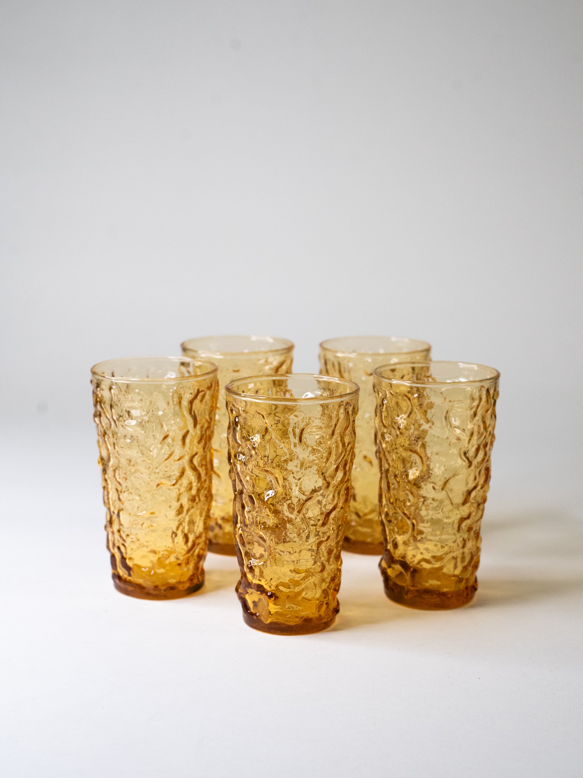 Bold, bubbly, and built to last, this set of five vintage glasses is made from textured pressed glass in rich amber, with that satisfying crinkle surface that plays beautifully with light.