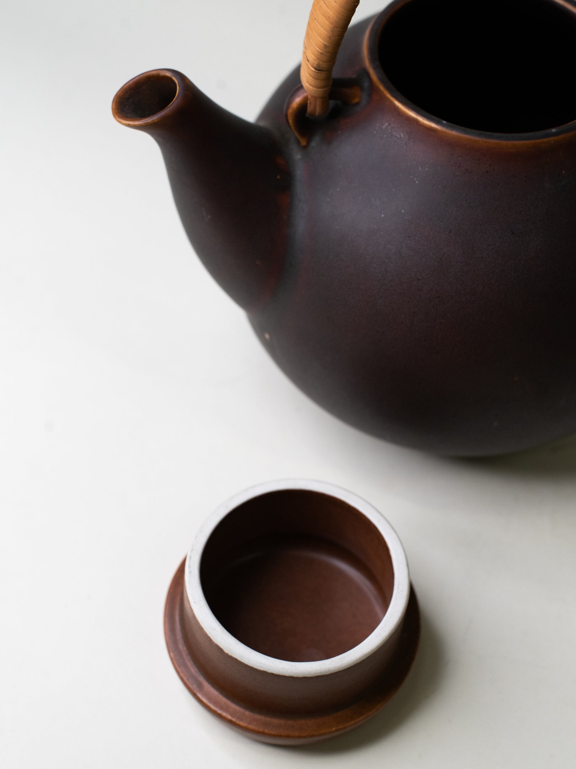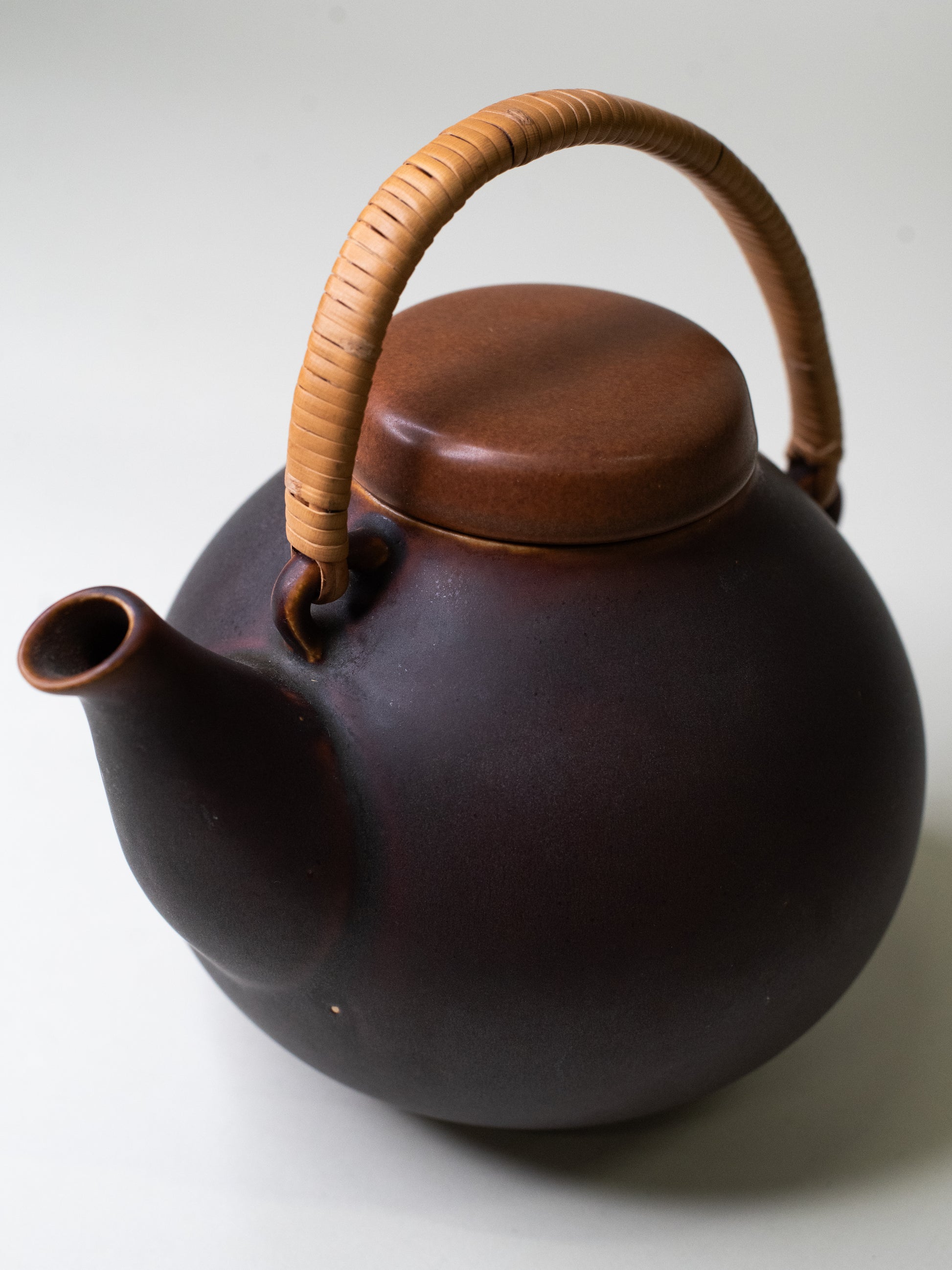 A rounded GA3 teapot by Ulla Procopé, made at Arabia from hard fajans in a deep, smoky brown. The shape is soft and calm, with a warm rattan handle and a steady, easy pour. Small glaze misses from production add to the handmade feel - typical for Arabia’s mid-century pieces.