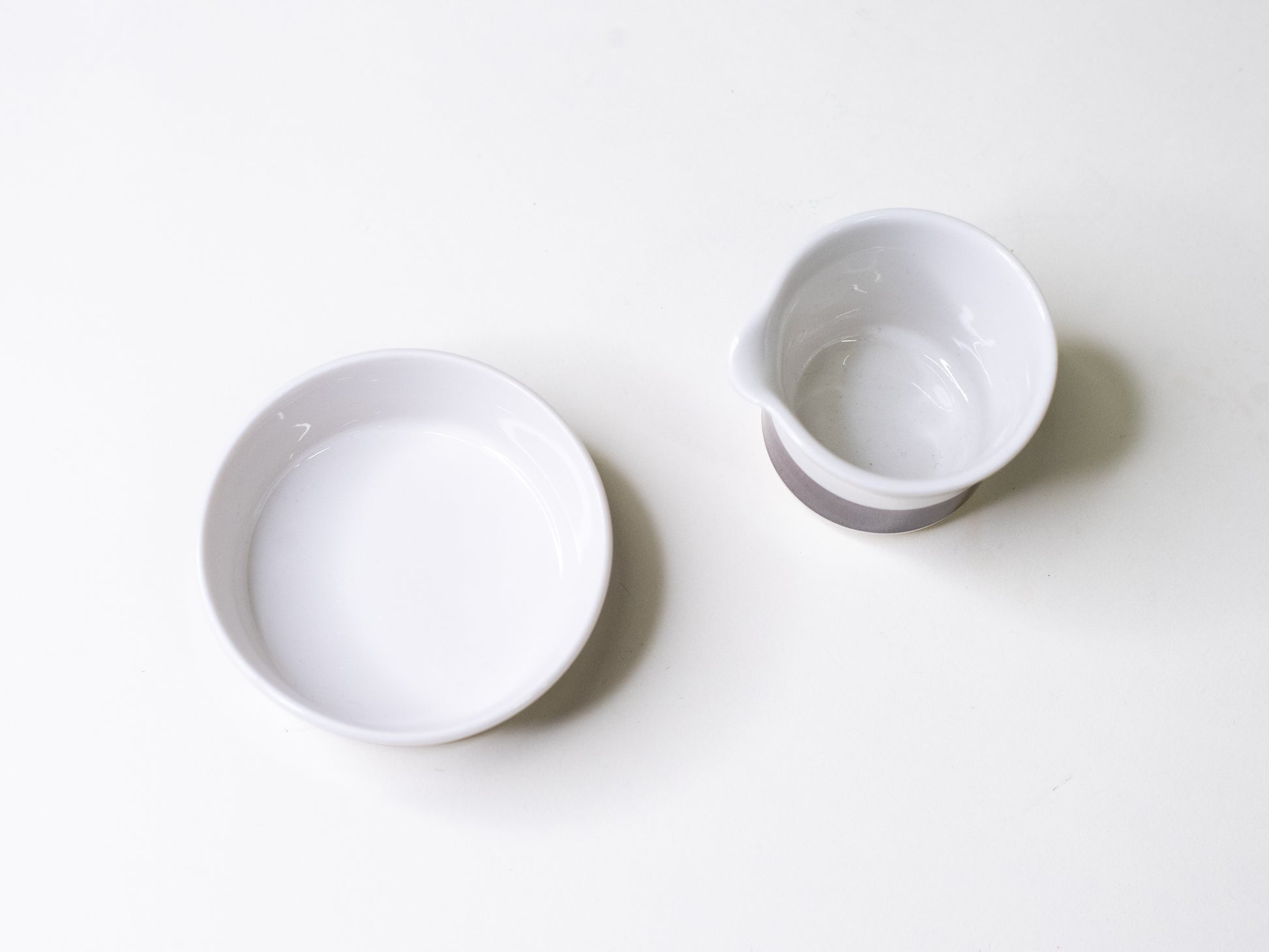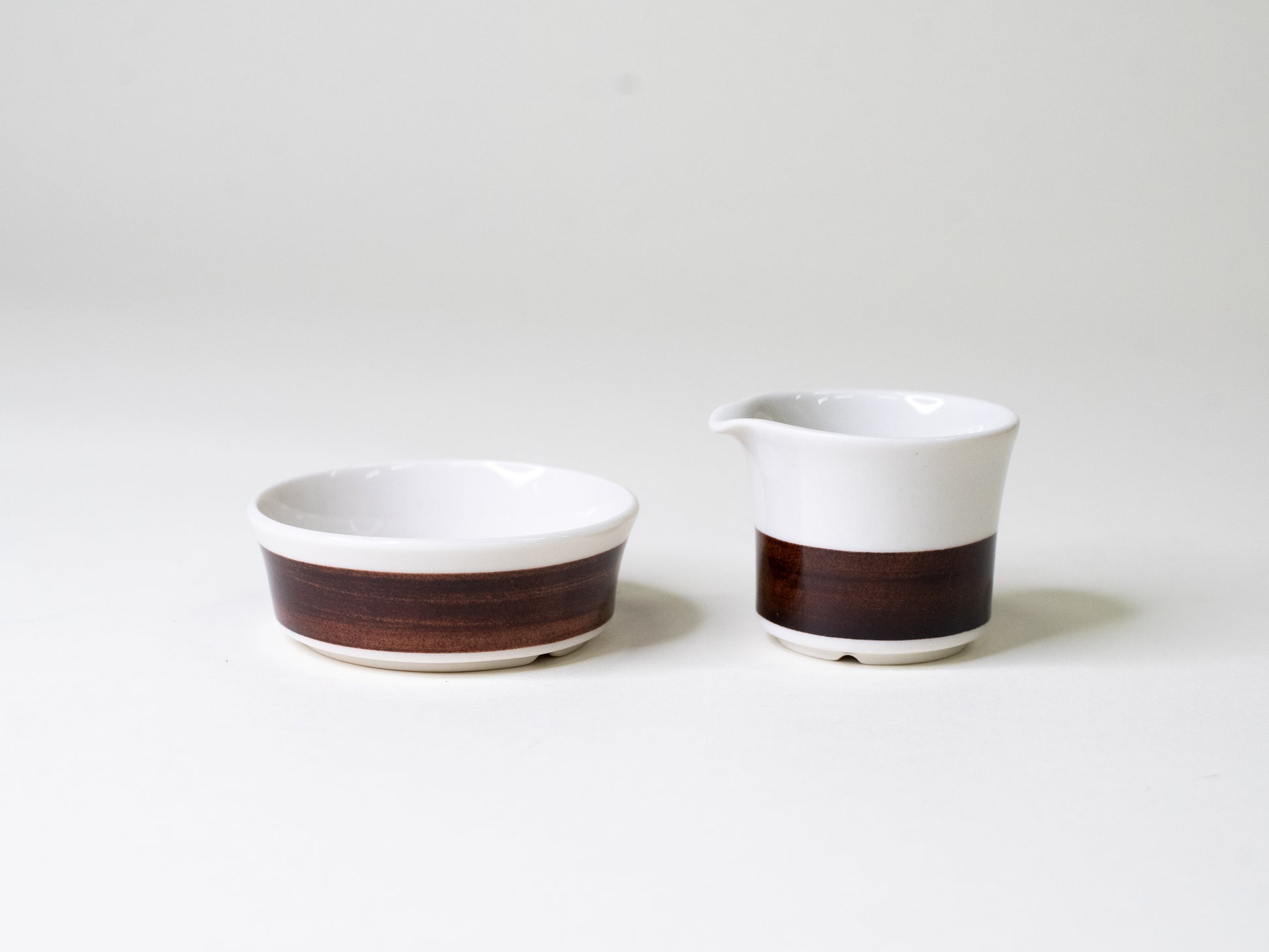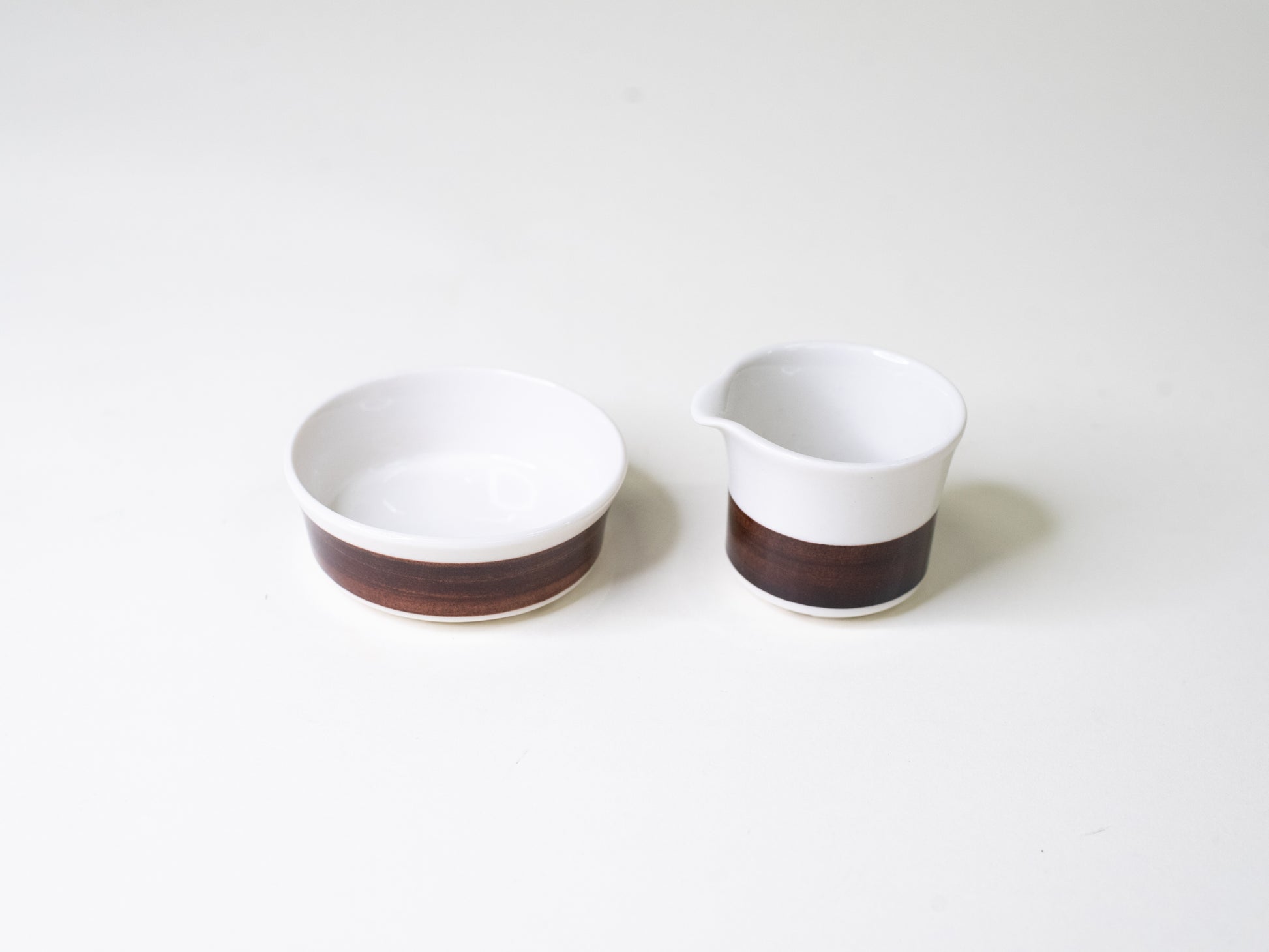 Originally part of Arabia’s 1970s coffee service, this small duo from the Inari series has a simple, timeless form that works just as well beyond its intended use. The clean white vitro porcelain and deep brown band make a calm, modern pairing that feels just right on any table.
