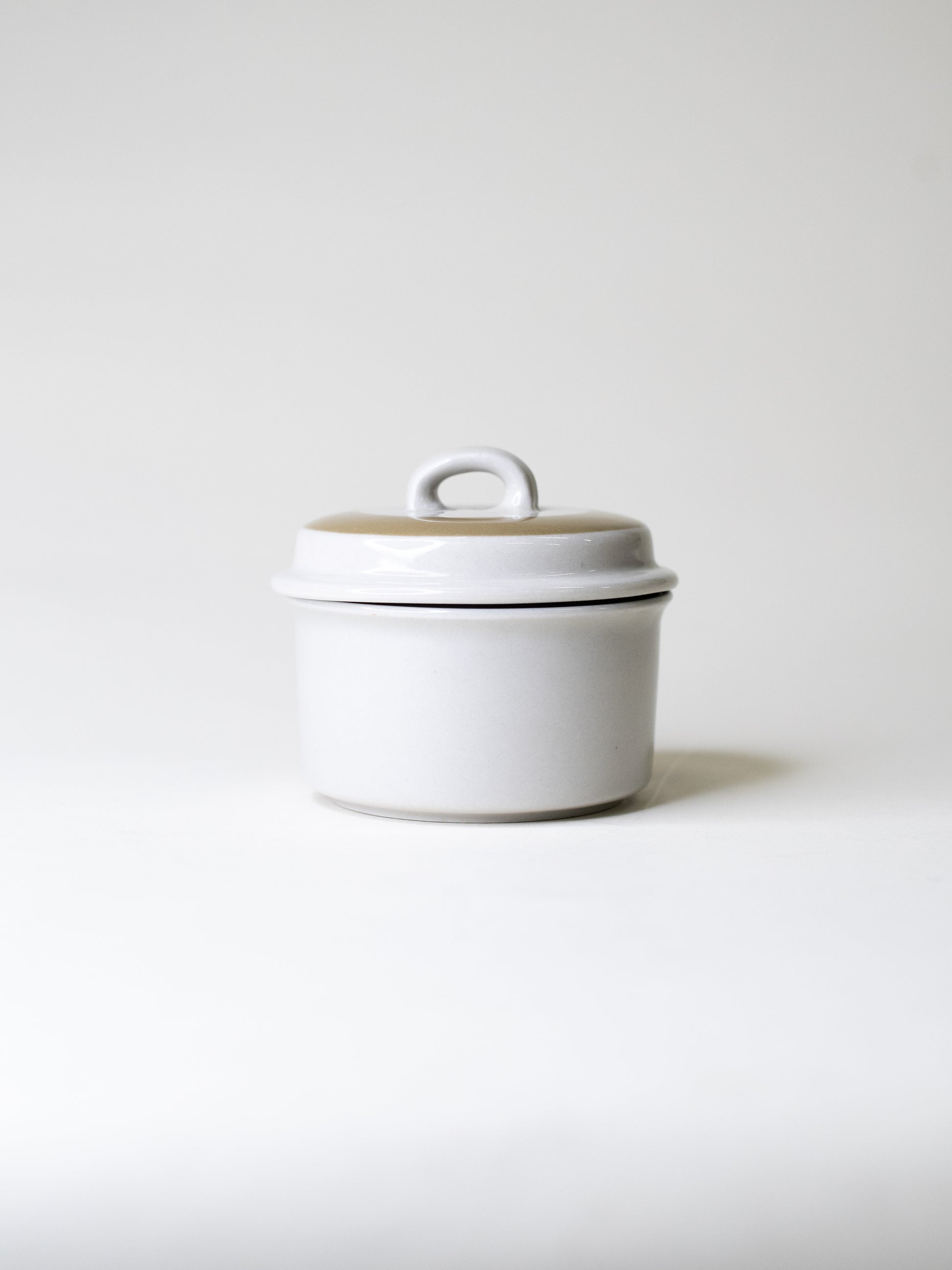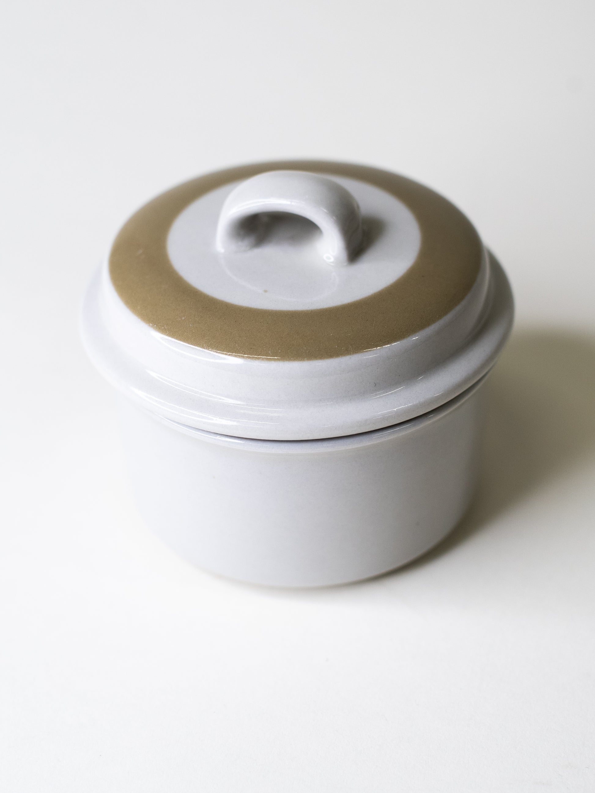 A lidded jar from Arabia’s rarely seen Oliivi series, designed by Olga Osol and produced between 1969 and 1973. The design features a single olive-green stripe around the lid - a quiet but intentional detail that gives warmth to the otherwise matte beige glaze. A perfect example of Finnish modernism at its most restrained: simple, functional, and full of character.