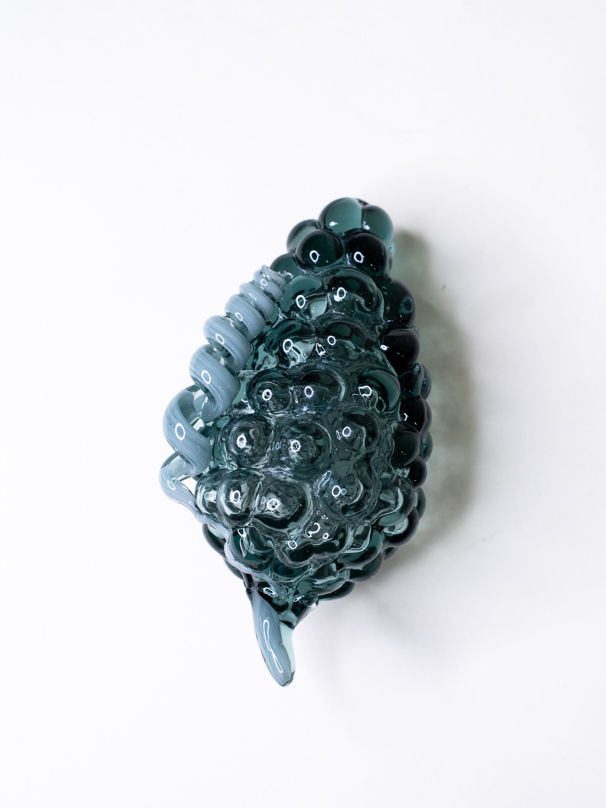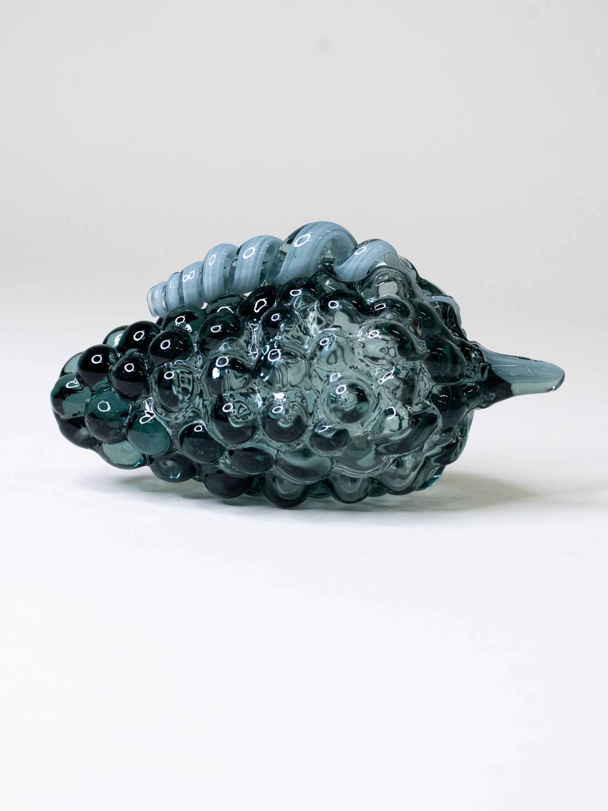 A stunning art glass sculpture in the form of a grape cluster, hand-blown in deep grey-blue glass with a playful twisted stem. The surface is covered in rounded, bubble-like forms that catch light beautifully from every angle. Solid and heavy in the hand - this is definitely one of the finest pieces of glass fruit we’ve ever seen.