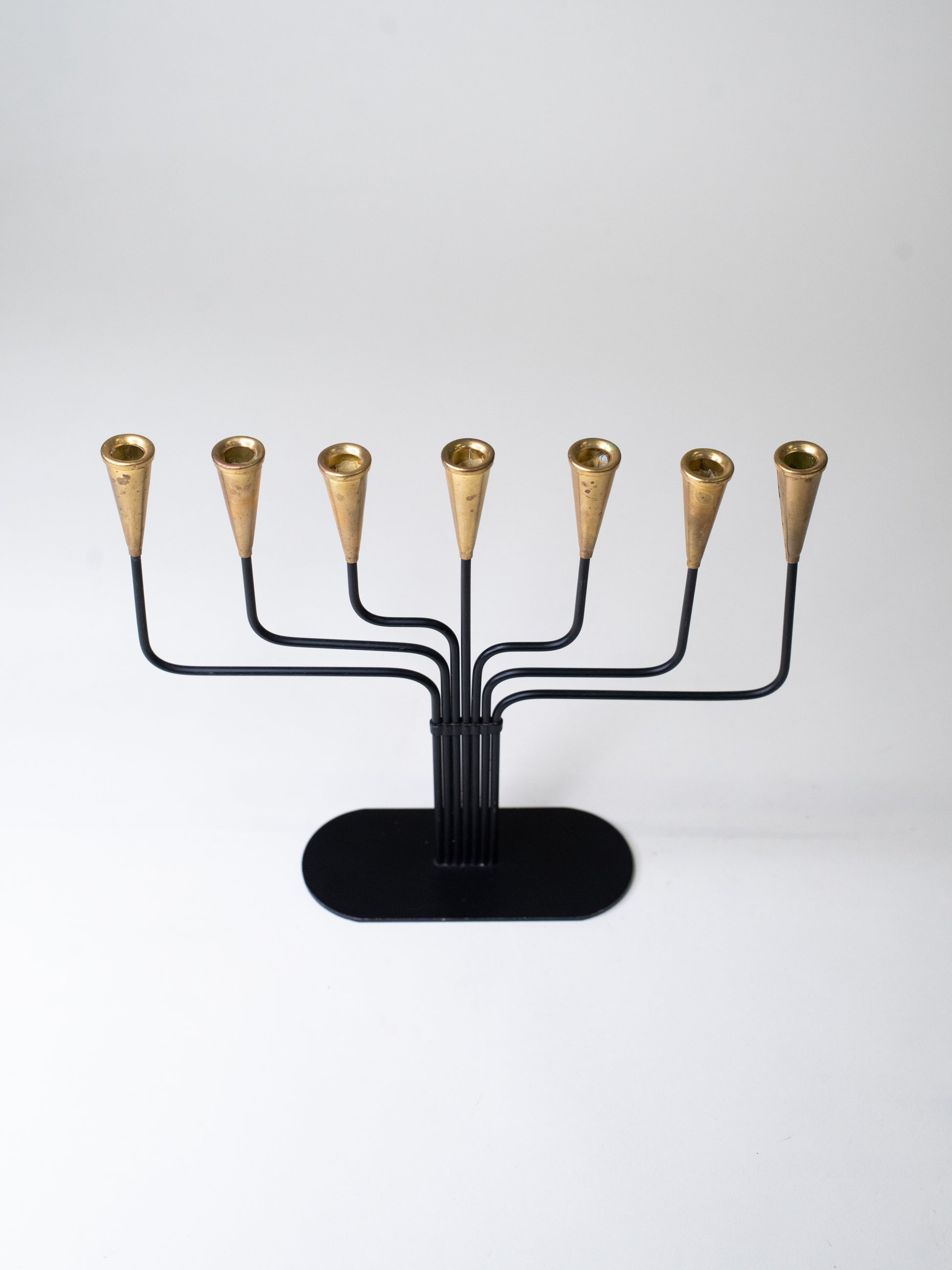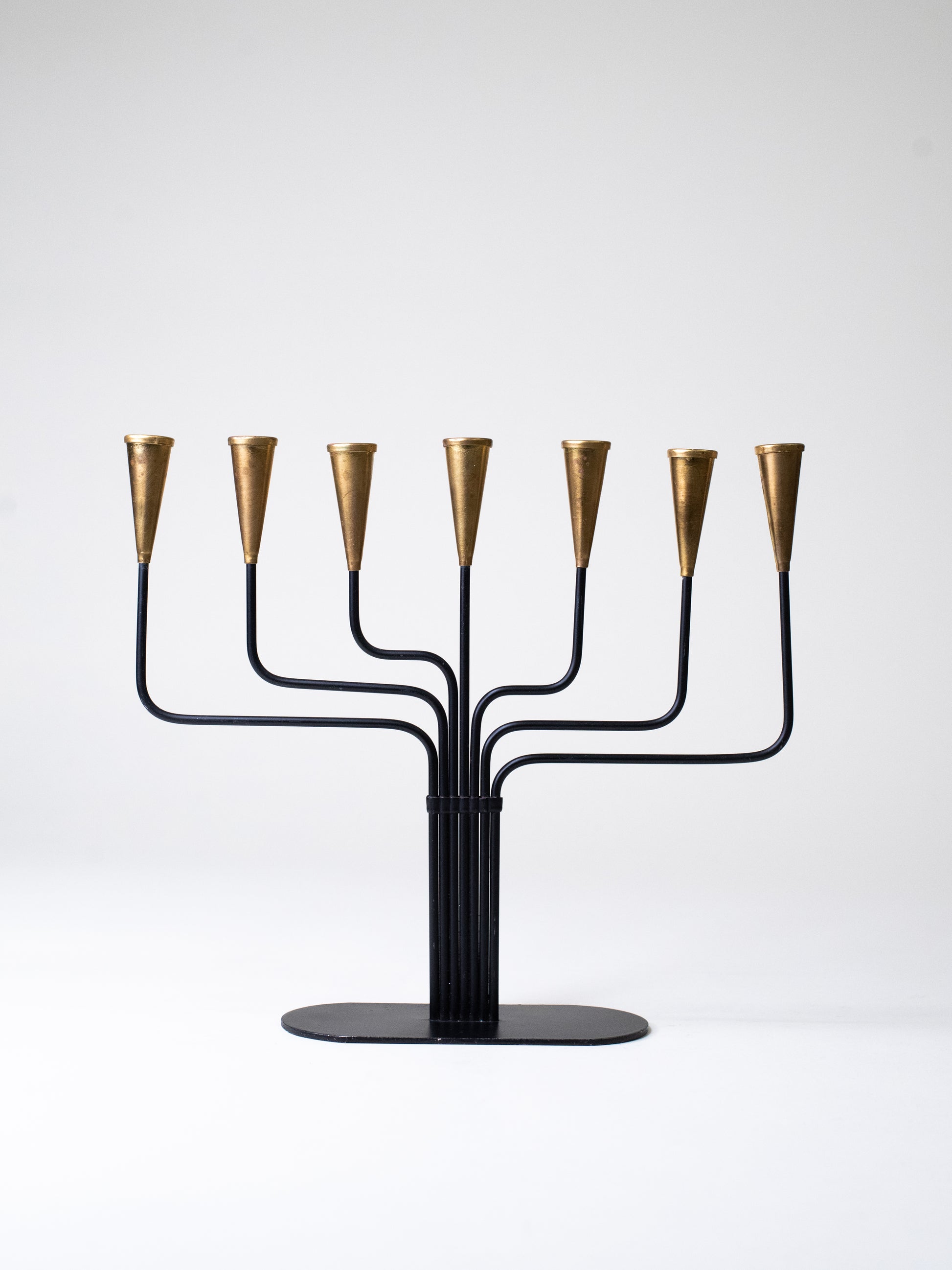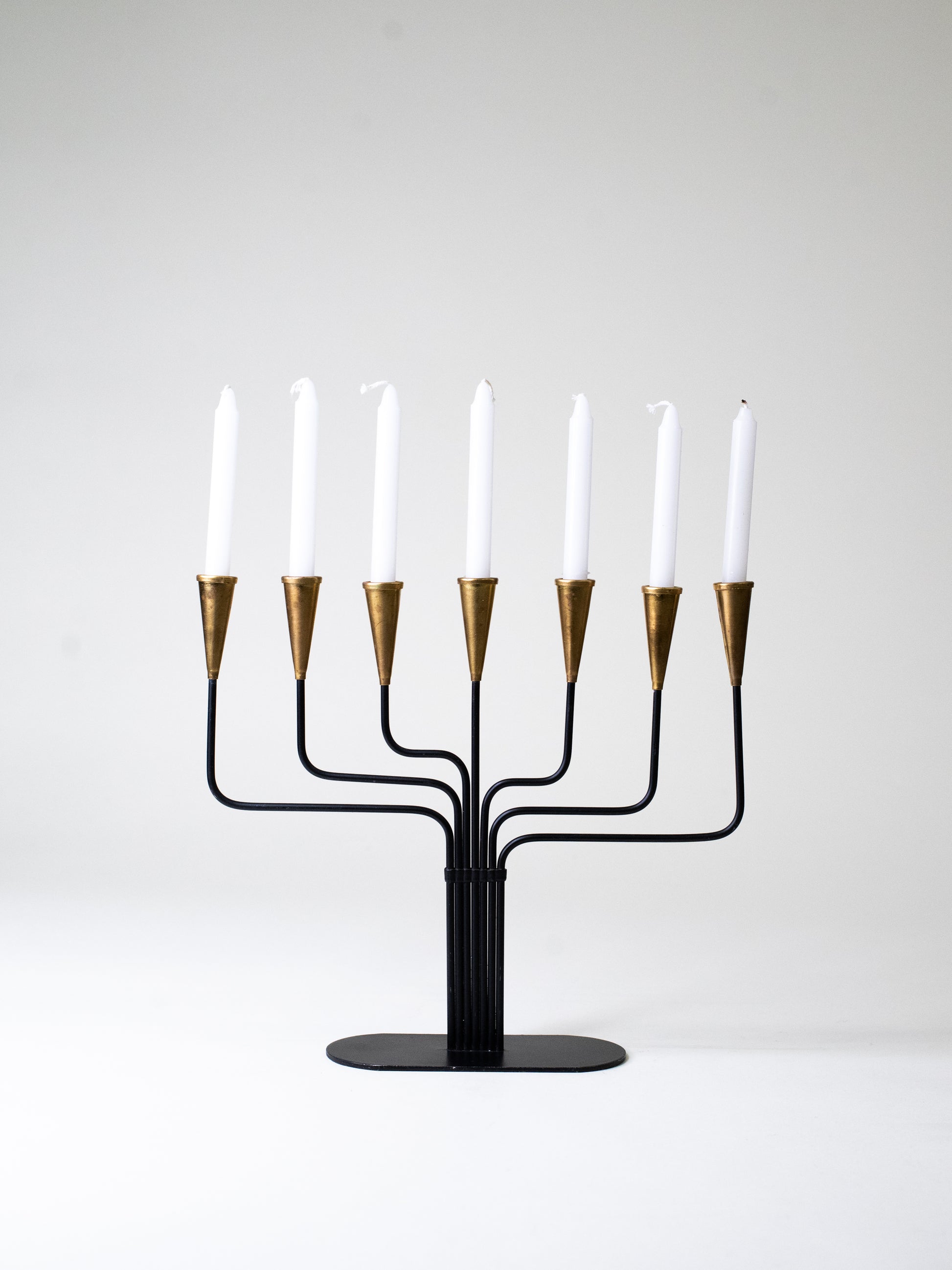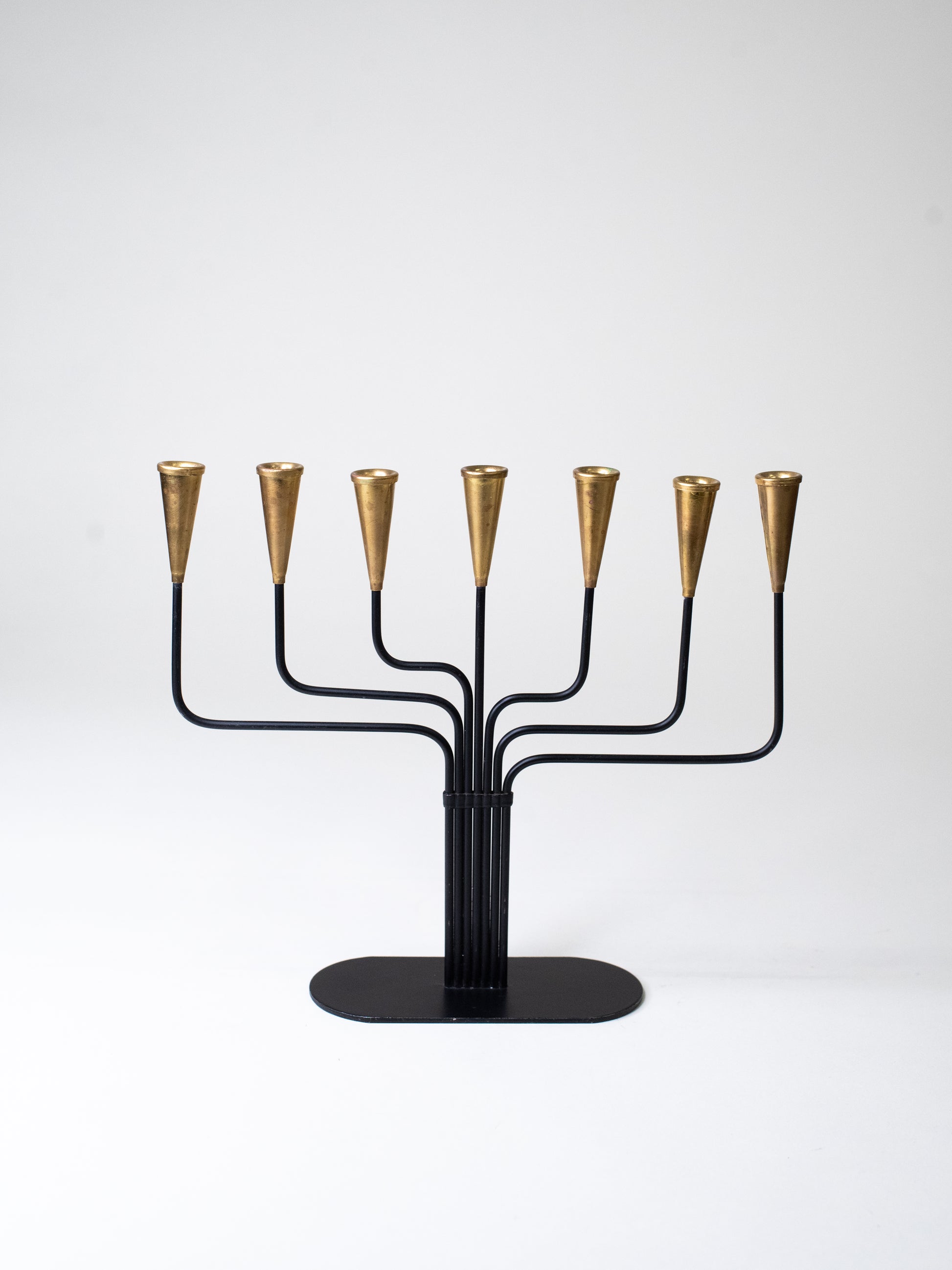 A classic seven-arm candelabra by Swedish designer Gunnar Ander, made by Ystad-Metall during the height of Scandinavian mid-century metalwork. The form is unmistakably his: slender black iron arms that curve out with an easy rhythm, topped with tapered brass candle cups that bring warmth and contrast.