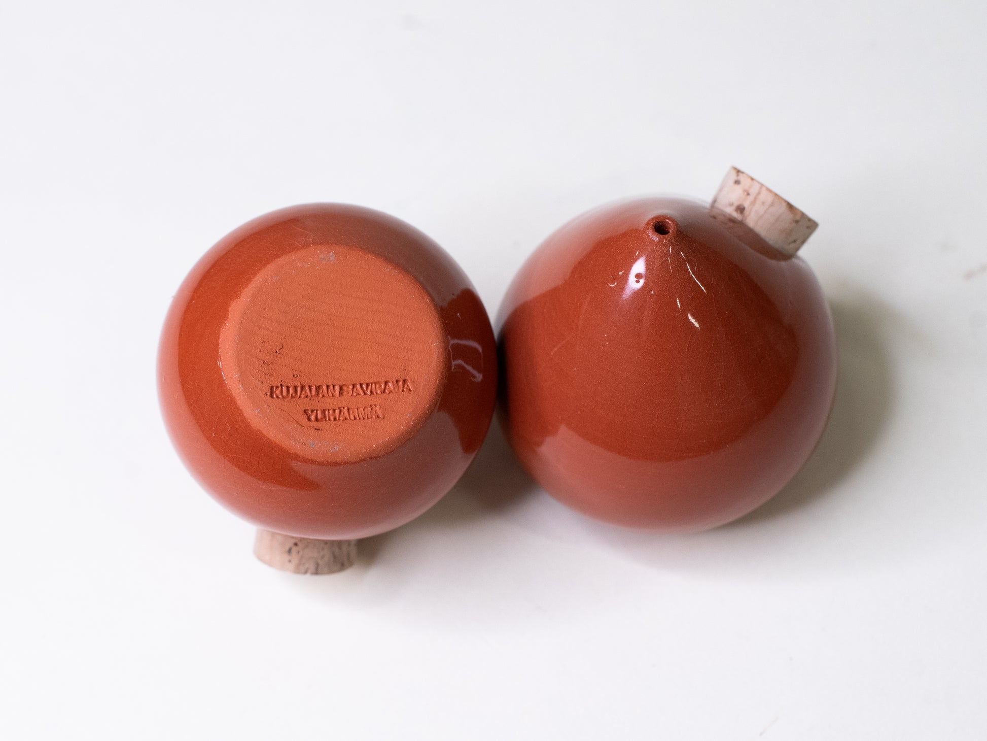 A beautiful pair of brick-red ceramic spice shakers from 1970s Finland - compact, handmade, and full of mid-century warmth. Their rounded droplet form and glossy glaze give them a sculptural presence that feels both playful and refined. Finished with natural cork stoppers, they bring a touch of Finnish craft tradition to everyday use.