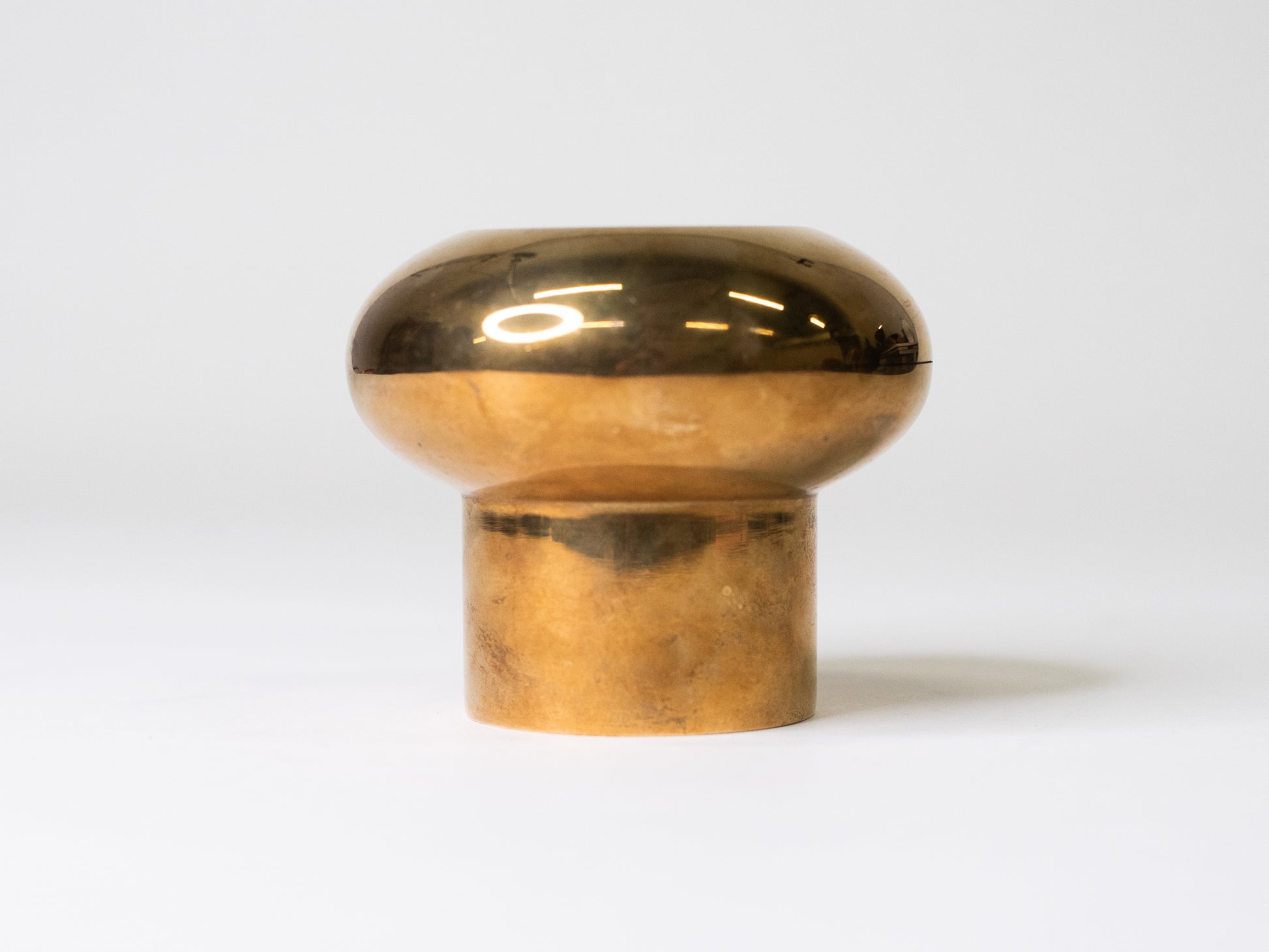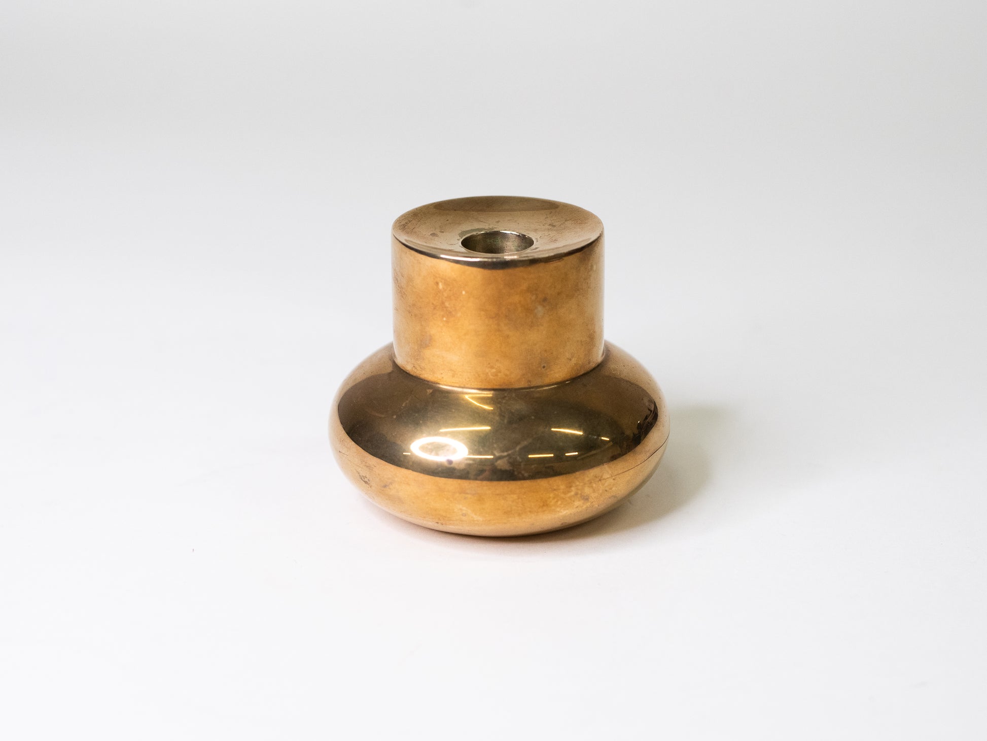 A solid brass candle holder with a clever two-way design, made in Landskrona, Sweden, in 1980. Its rounded, weighty form feels both modernist and timeless, while the reversible shape lets you use it in two positions - compact and grounded, or taller and more elevated. The surface shows a warm patina that only brass can develop, adding depth and character.
