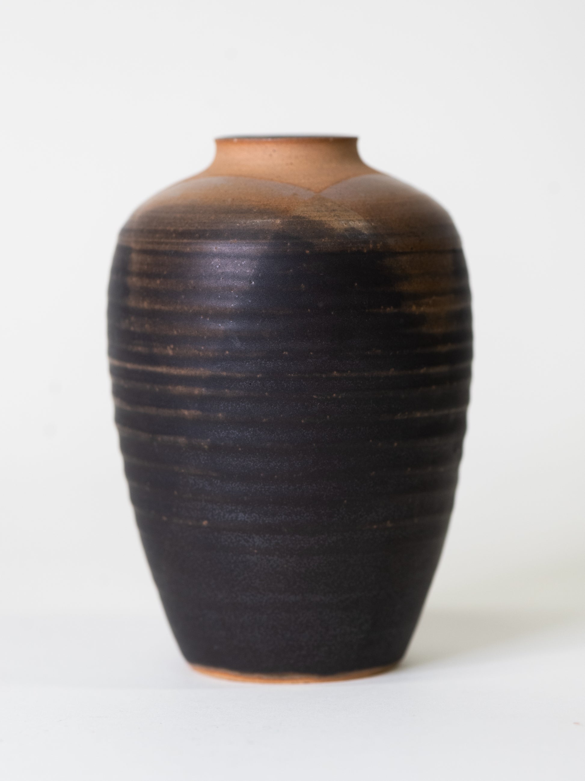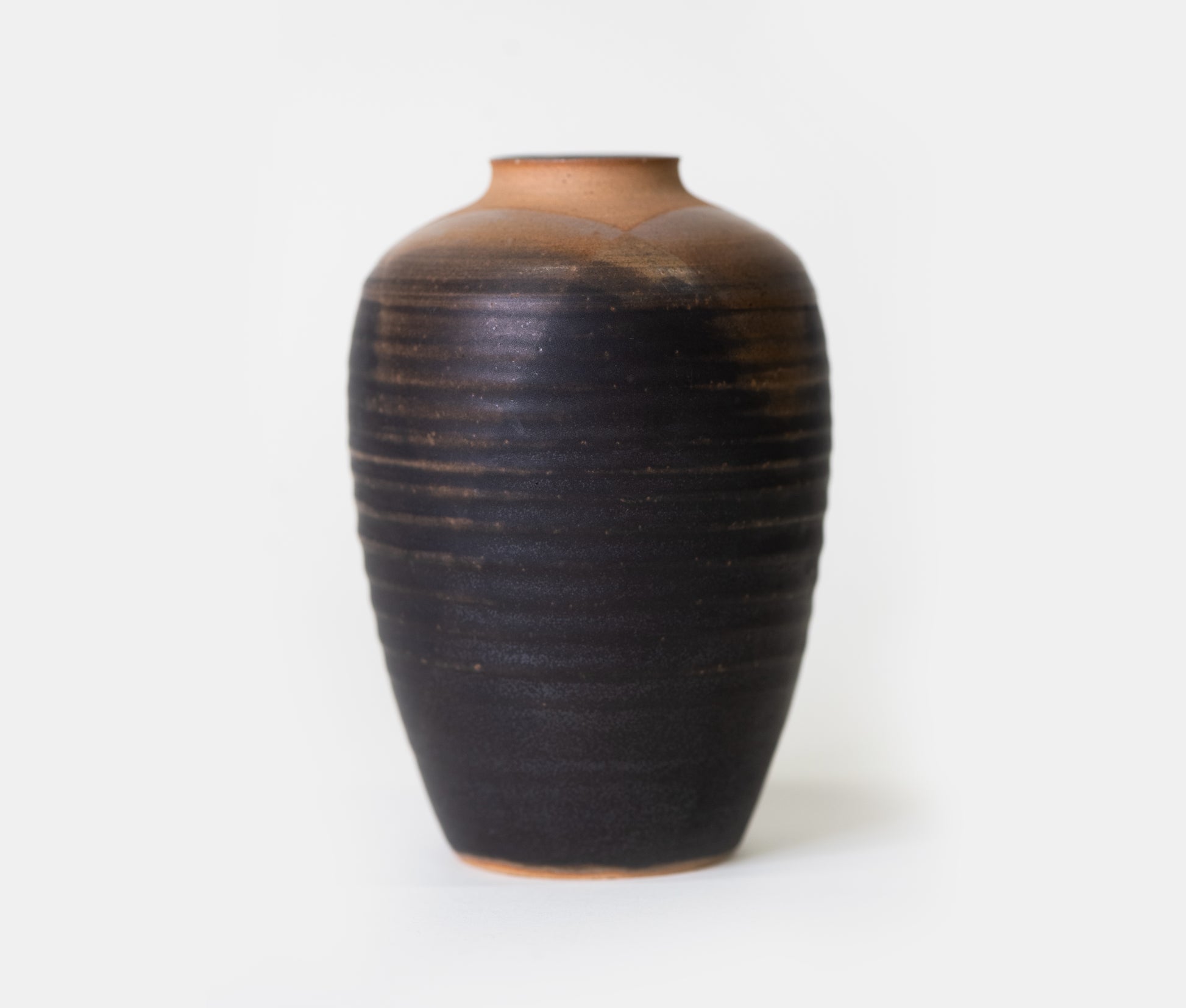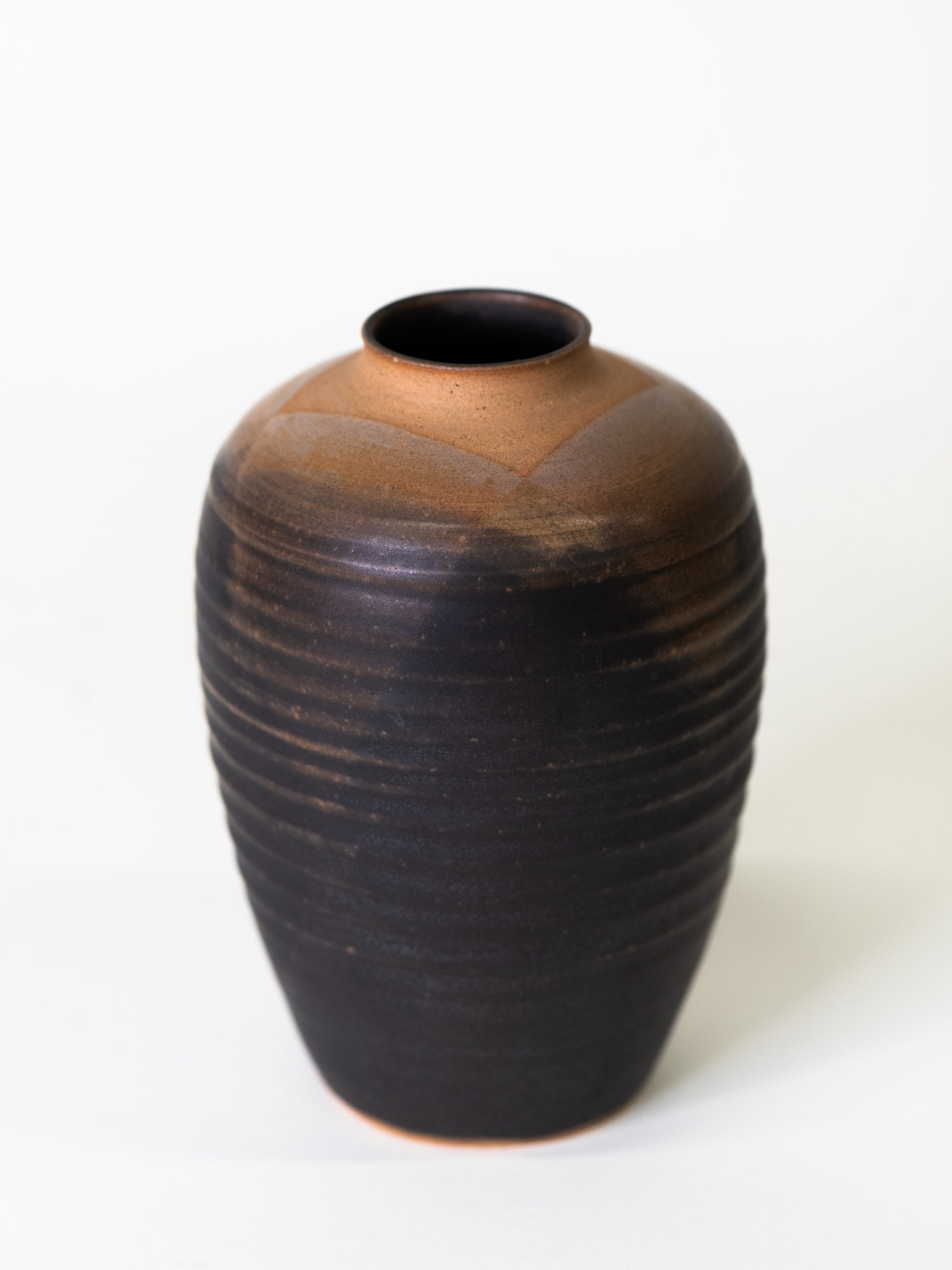 Hand-thrown Finnish studio pottery vase with a warm ochre-to-black glaze and softly ridged surface. The subtle gradient and narrow mouth give it a quiet, modernist presence - elegant on its own or holding a few simple stems.