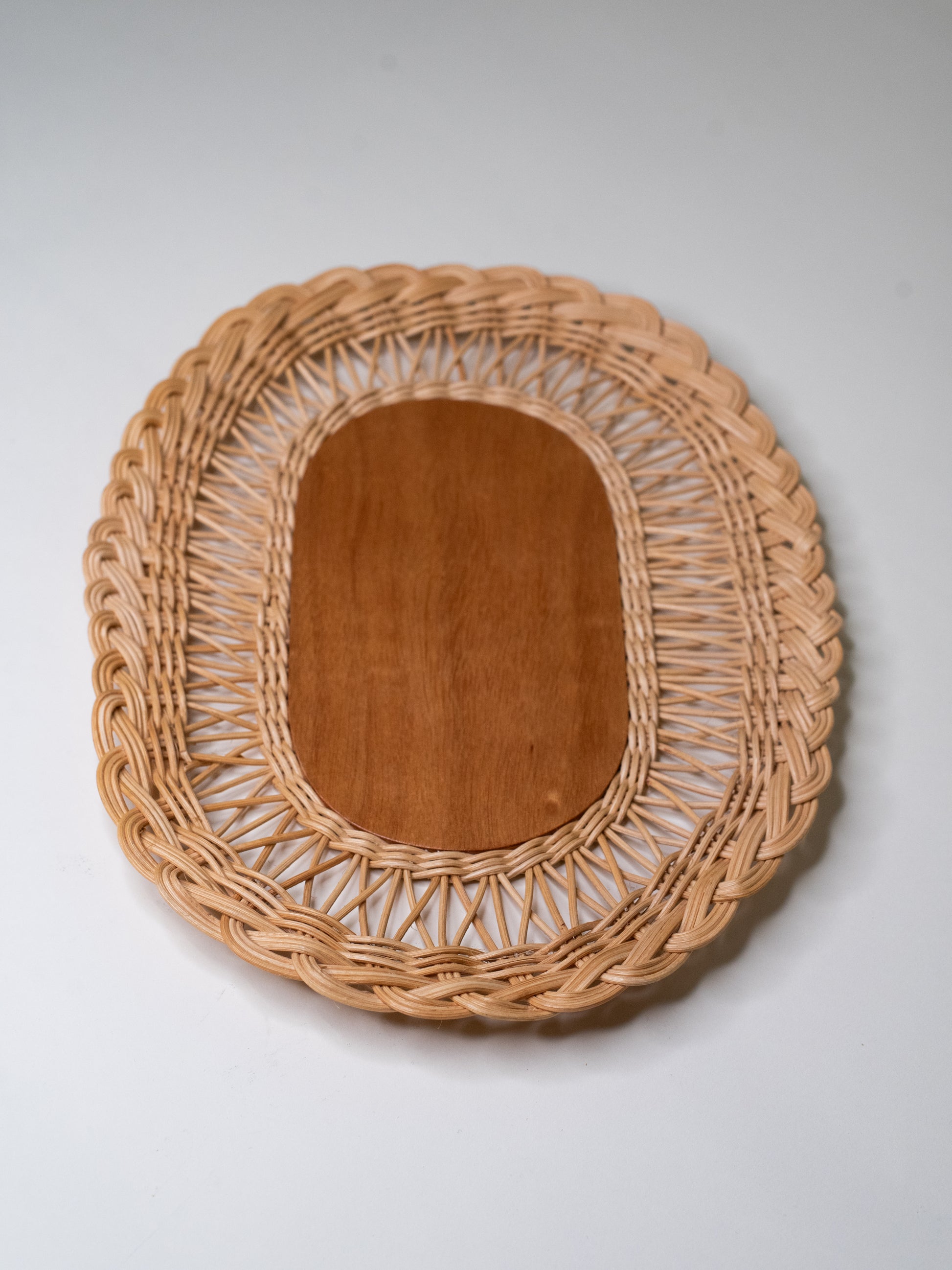 A beautifully hand-crafted Finnish rattan tray with an oval wooden base and a hand-woven rim. The contrast between the warm wood centre and the airy rattan border gives it a light, balanced feel - decorative, but sturdy. Solid in the hand and made for everyday use, with small irregularities that come from handwoven work.