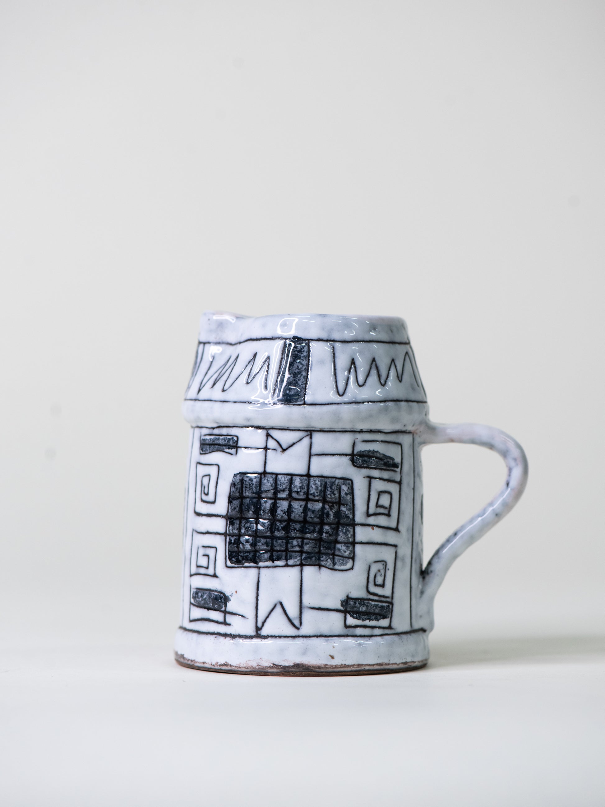Small Italian ceramic jug from Fratelli Fanciullacci, hand-decorated in black and white with geometric motifs typical of the 1960s. The bold, linear surface pattern contrasts beautifully with the softly rounded shape, giving it both a graphic and handmade feel.