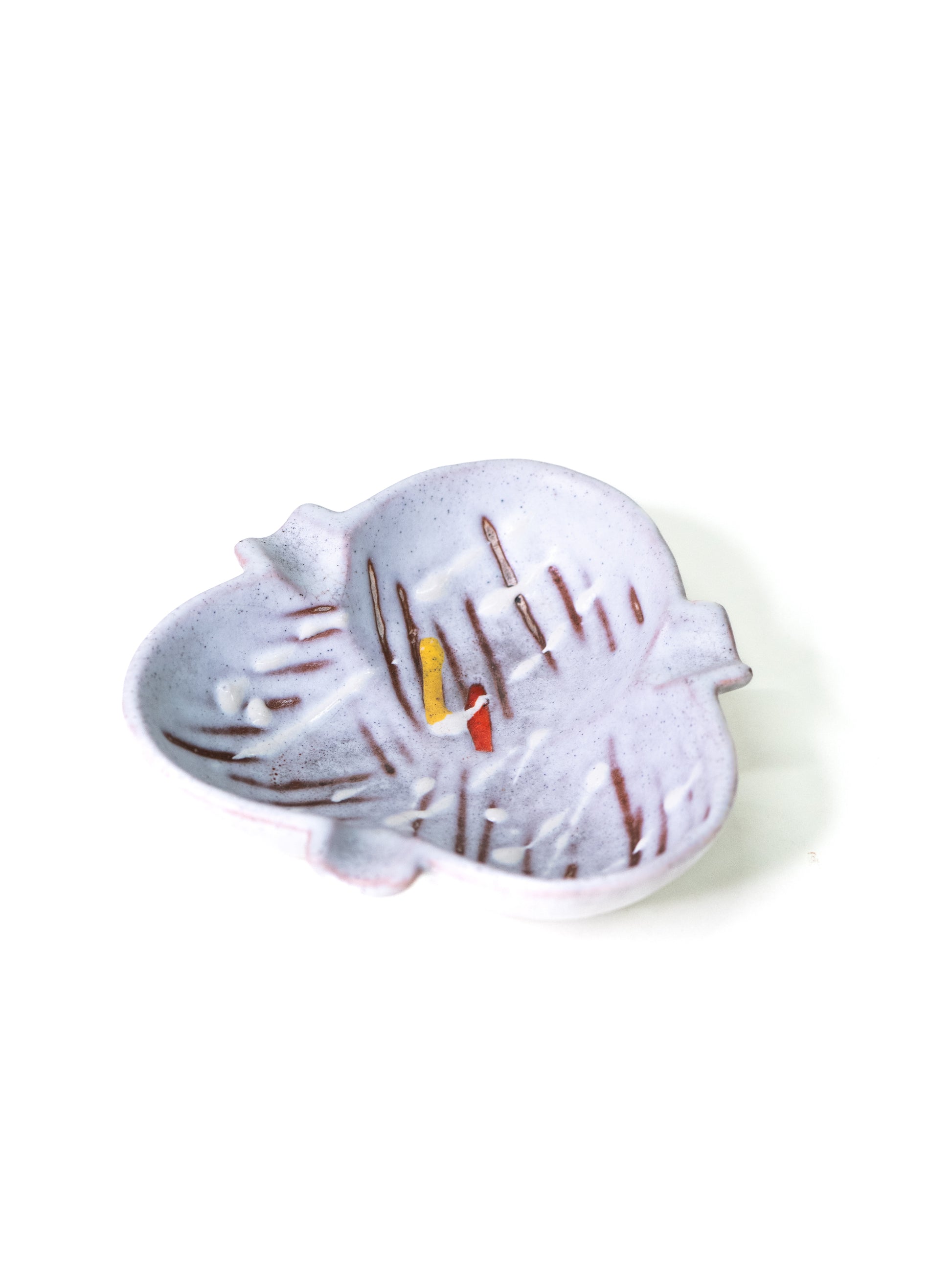 A small, characterful ceramic ashtray from Germany, finished in a pale, speckled glaze. The surface is lively and expressive: fine brown brush-like lines move across the form, punctuated by small hits of mustard yellow and brick red at the centre. It has that unmistakable mid-century looseness - playful, graphic, and a little bit odd in the best way.