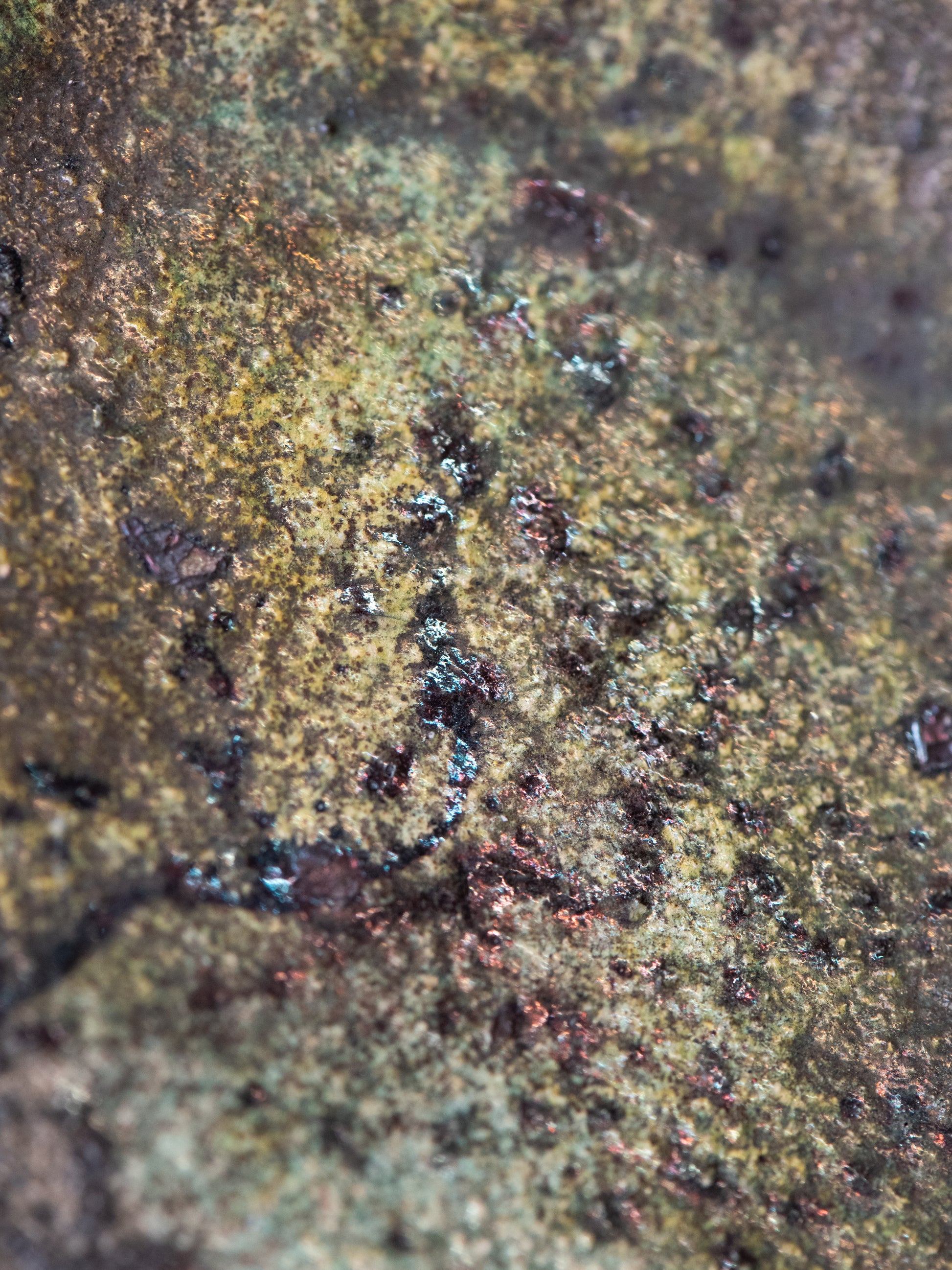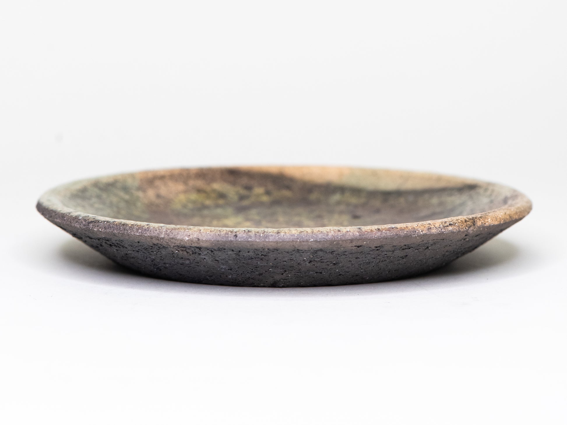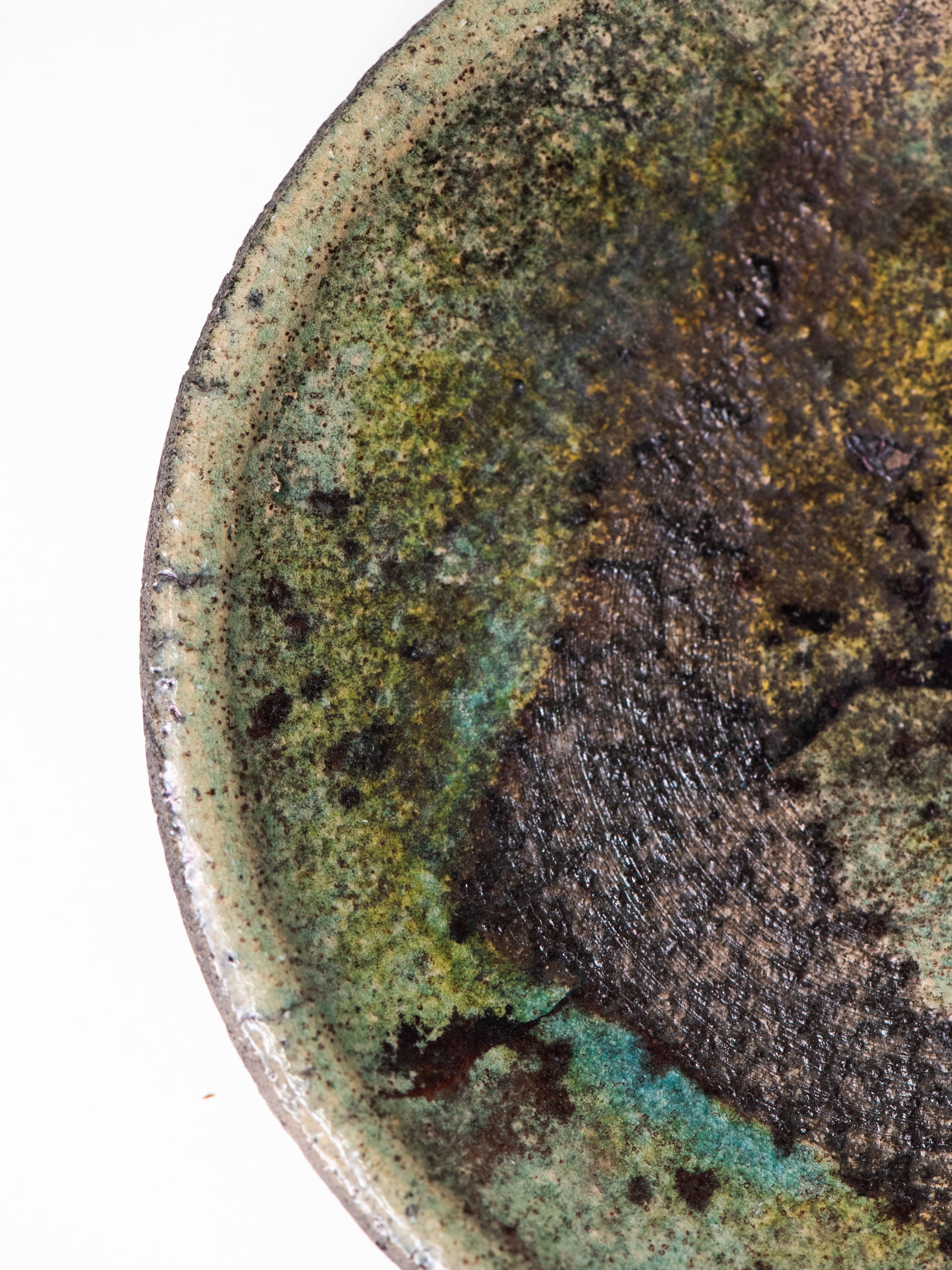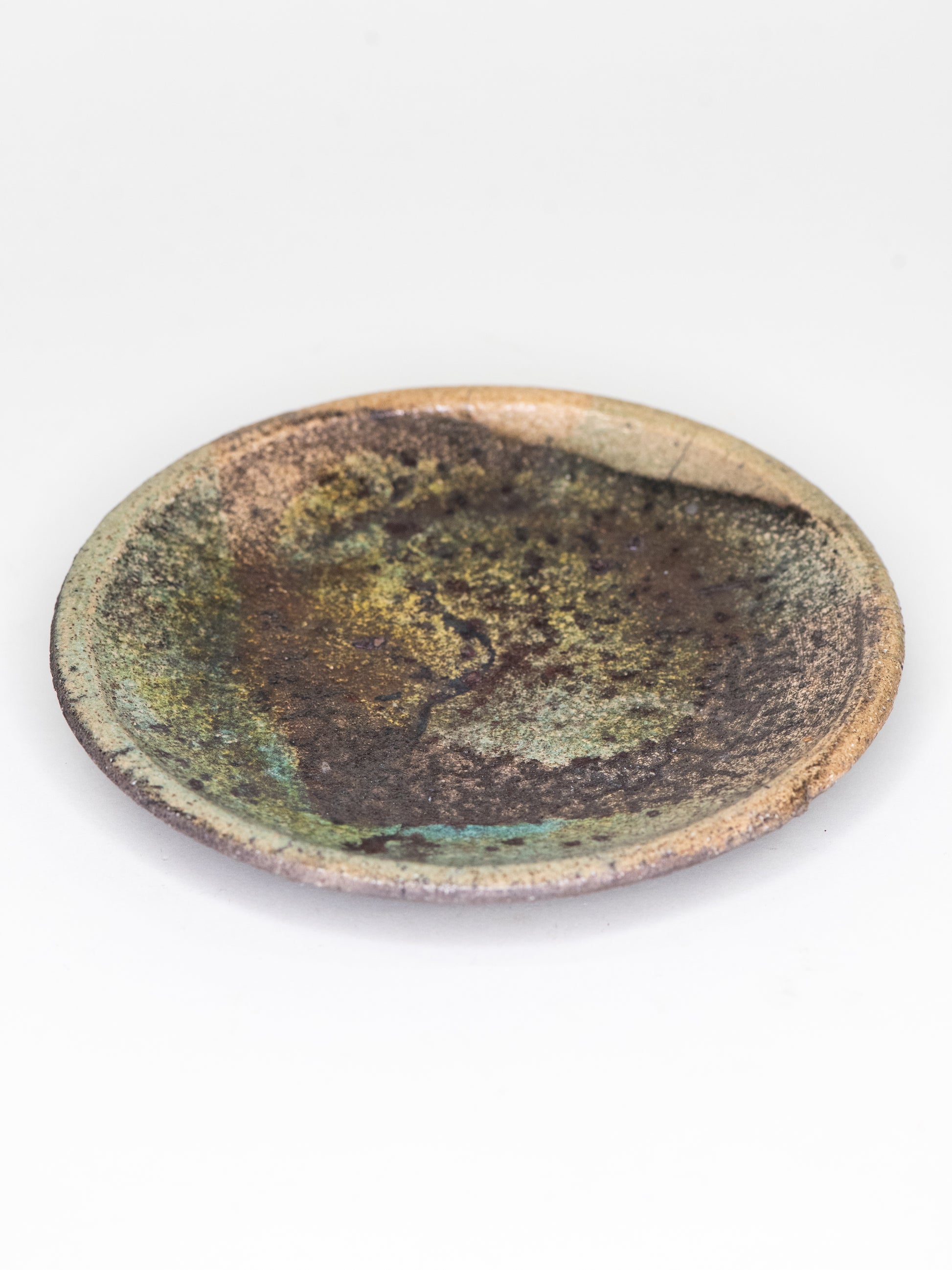 A one-of-a-kind ceramic dish with a richly layered surface and a stunning glaze that shifts between mossy green, olive, deep brown, and charcoal. The form is simple and open with a slightly rough, uneven rim and firing marks. The clay body remains visible at the edge, giving the piece an organic feel. The underside is left dark and unglazed, leaving the material visible.