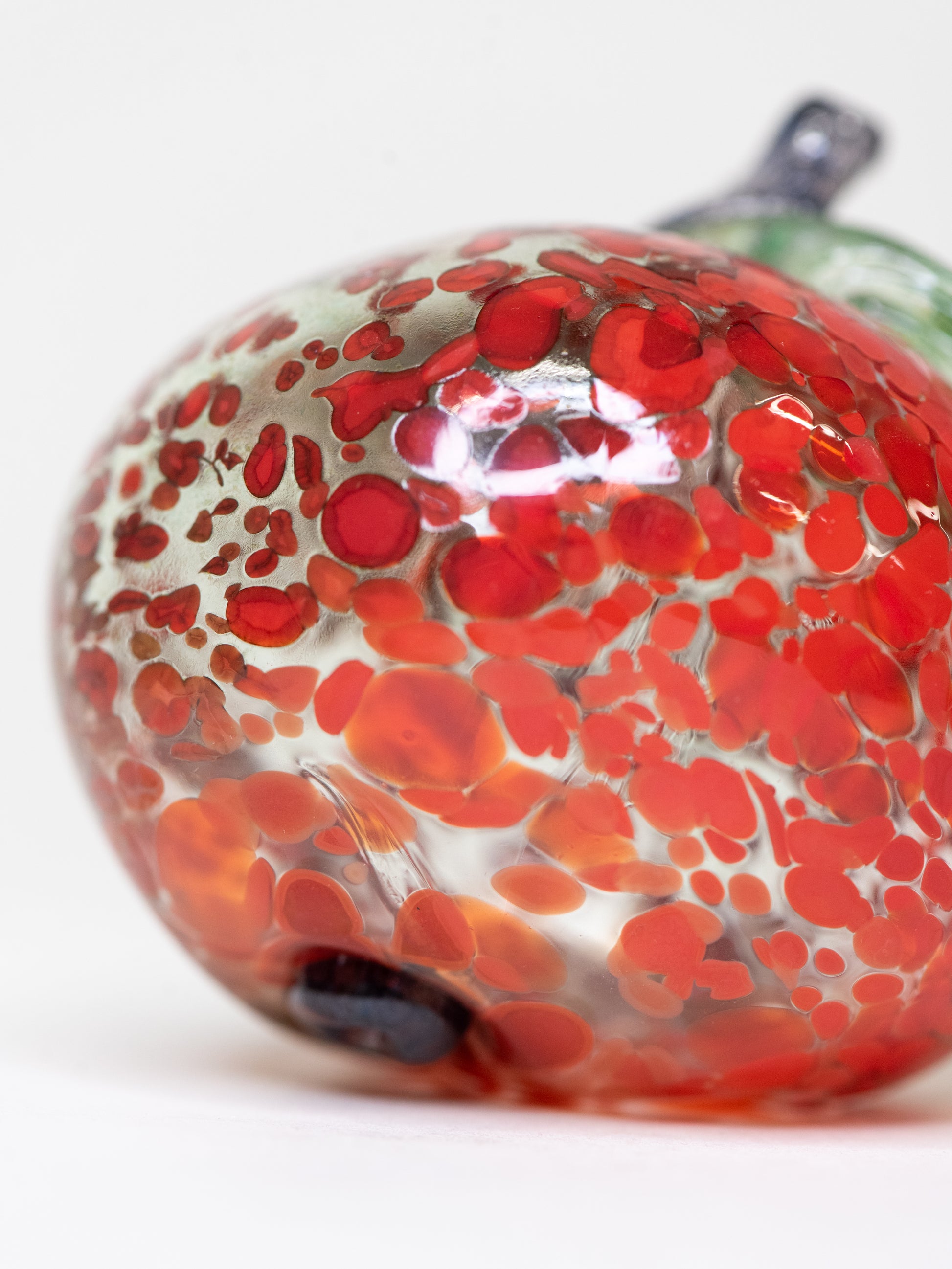 This handblown glass apple has a generous, rounded form and a rich scatter of red inclusions suspended in clear glass, giving it depth and movement from every angle. A small green stem crowns the piece, slightly off-centre, adding to its easy, organic feel.