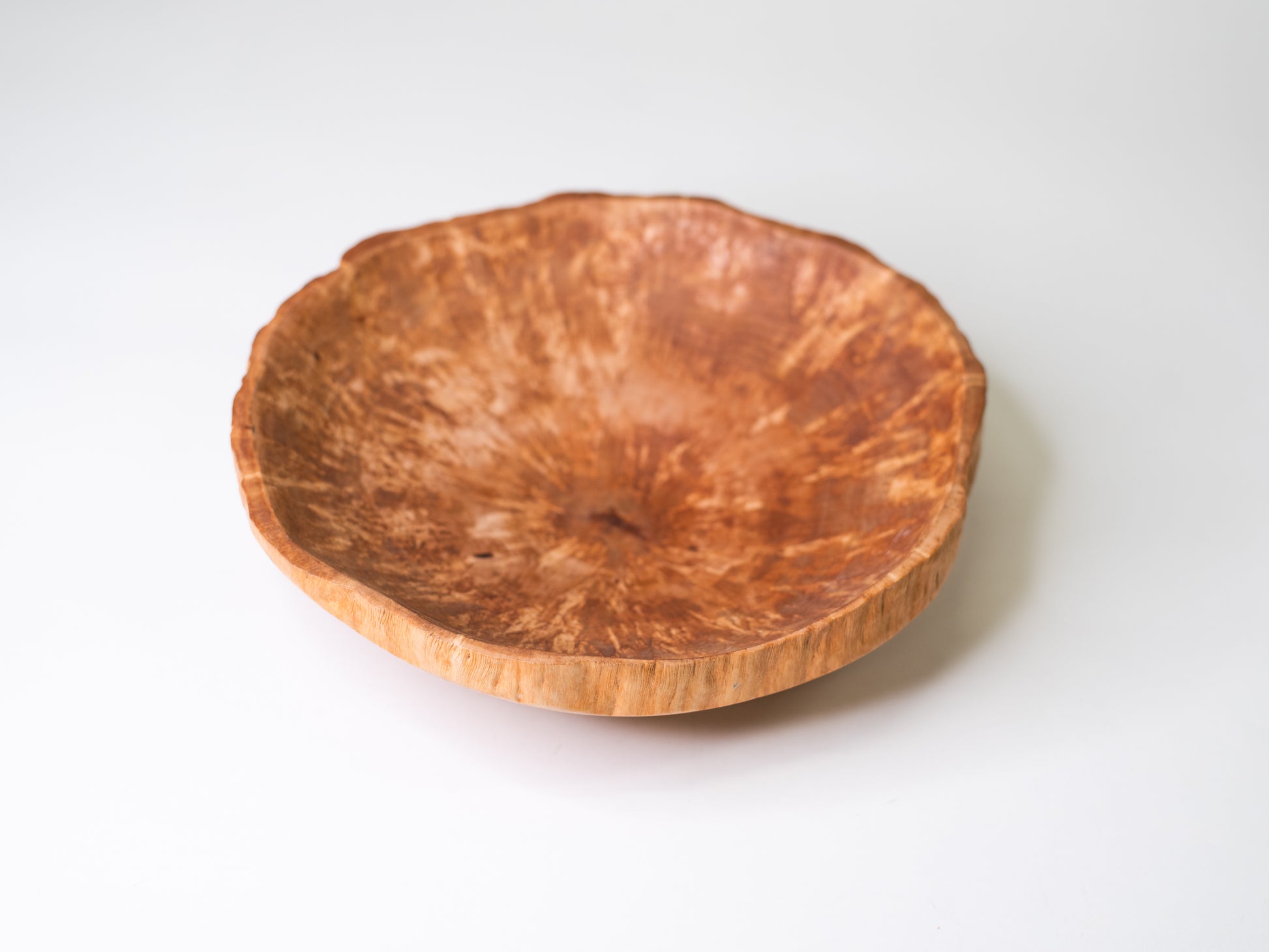 A beautifully hand-turned wooden bowl made in Finland, showing the rich flame-like grain of curly birch (visakoivu). The natural form and light asymmetry give it a grounded, organic feel - every angle revealing a different rhythm in the wood.
