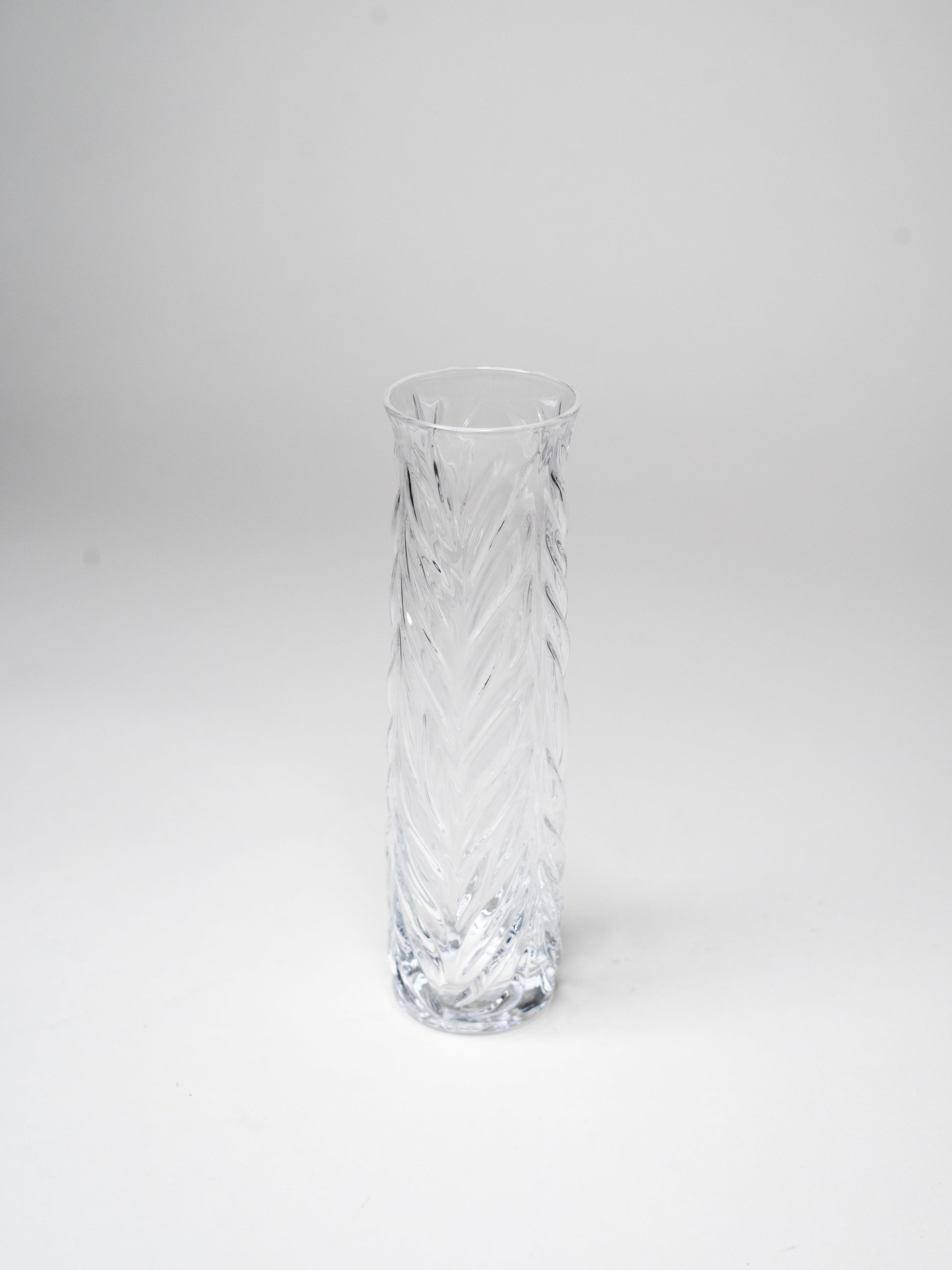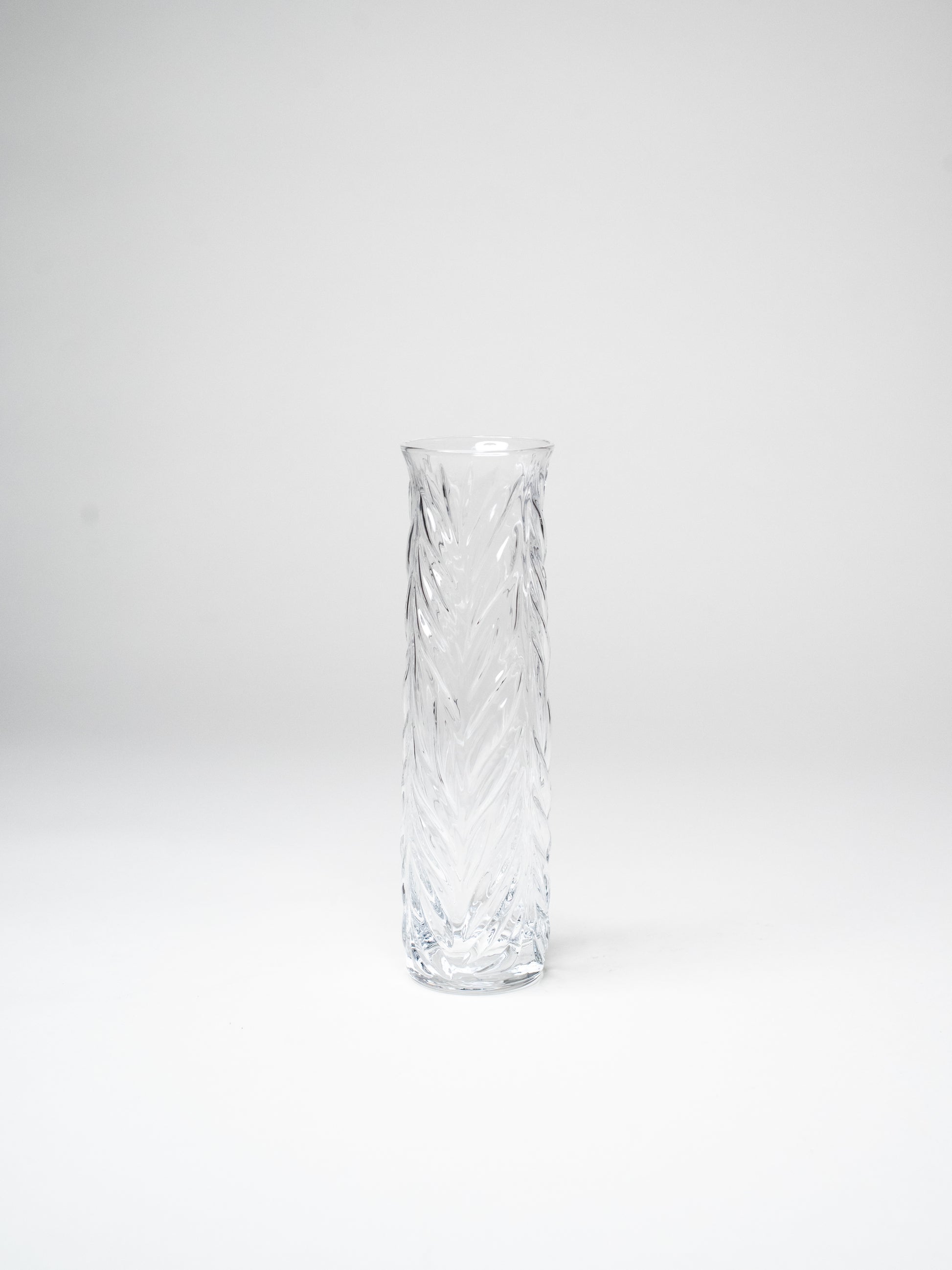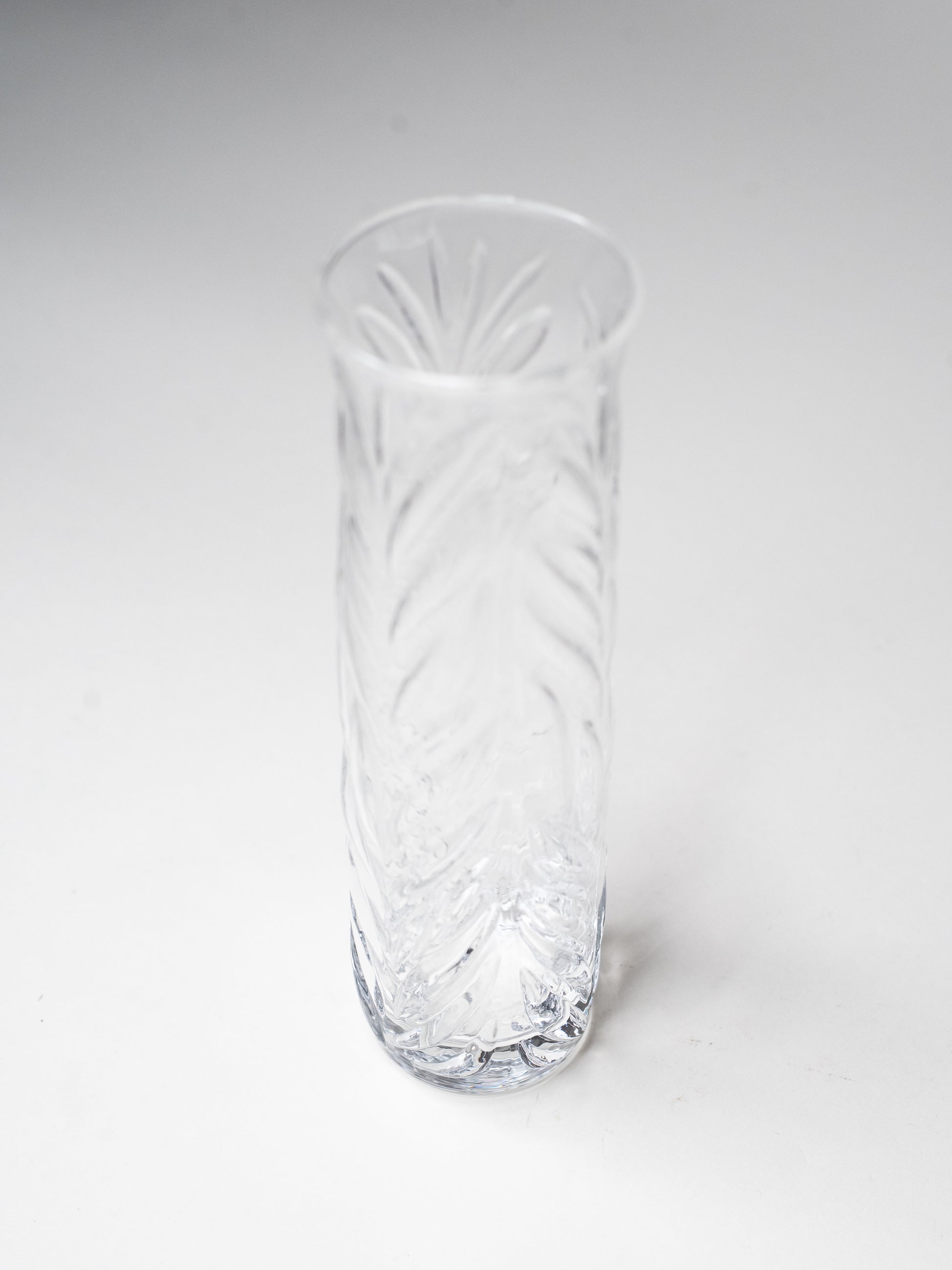 Tall and elegant Vita vase by Valto Kokko for Iittala. Made of clear pressed glass with a beautifully organic surface that catches light in shifting patterns. The vertical leaf-like relief gives the piece both structure and movement, a hallmark of Kokko’s quietly sculptural design language.