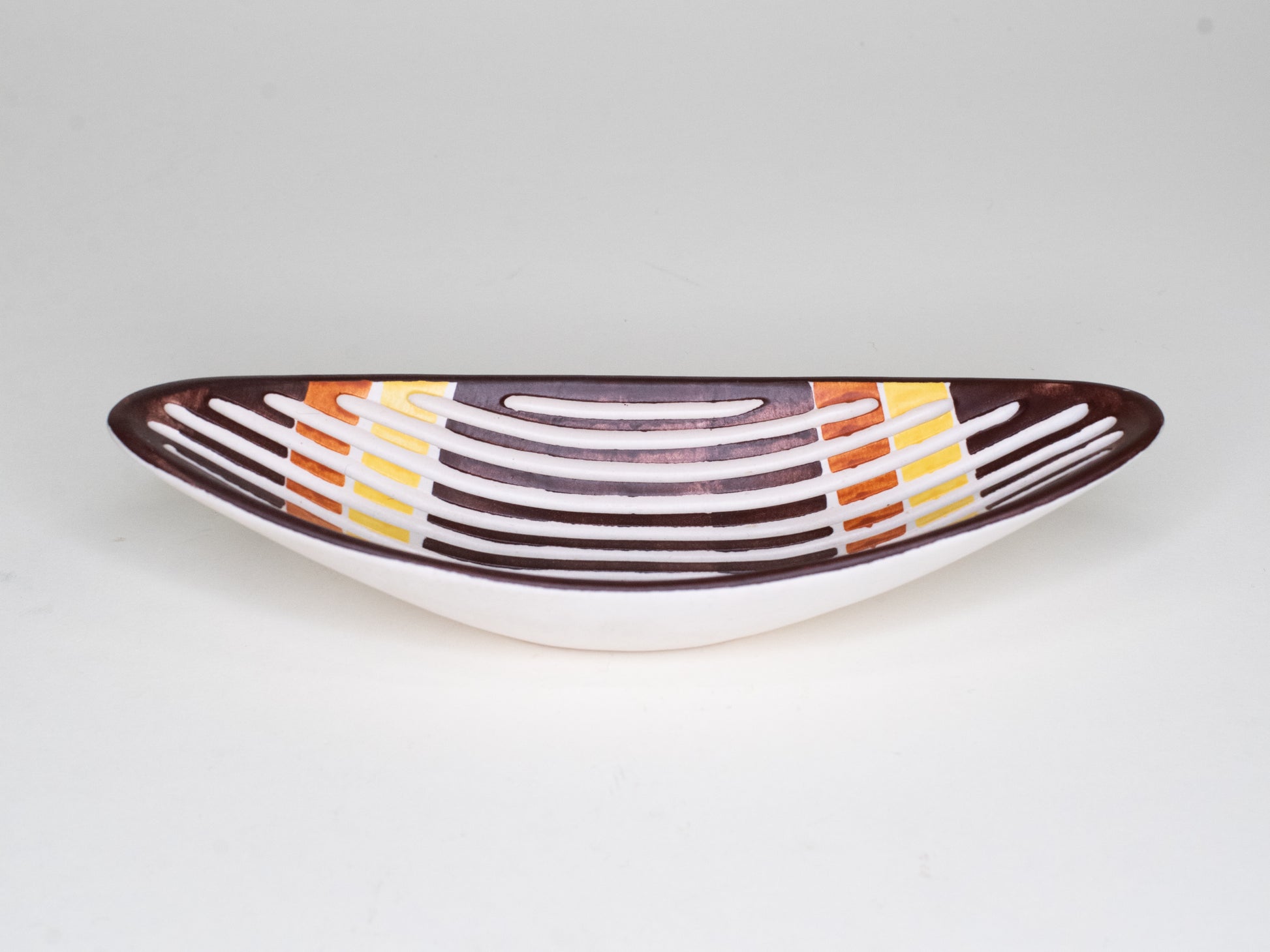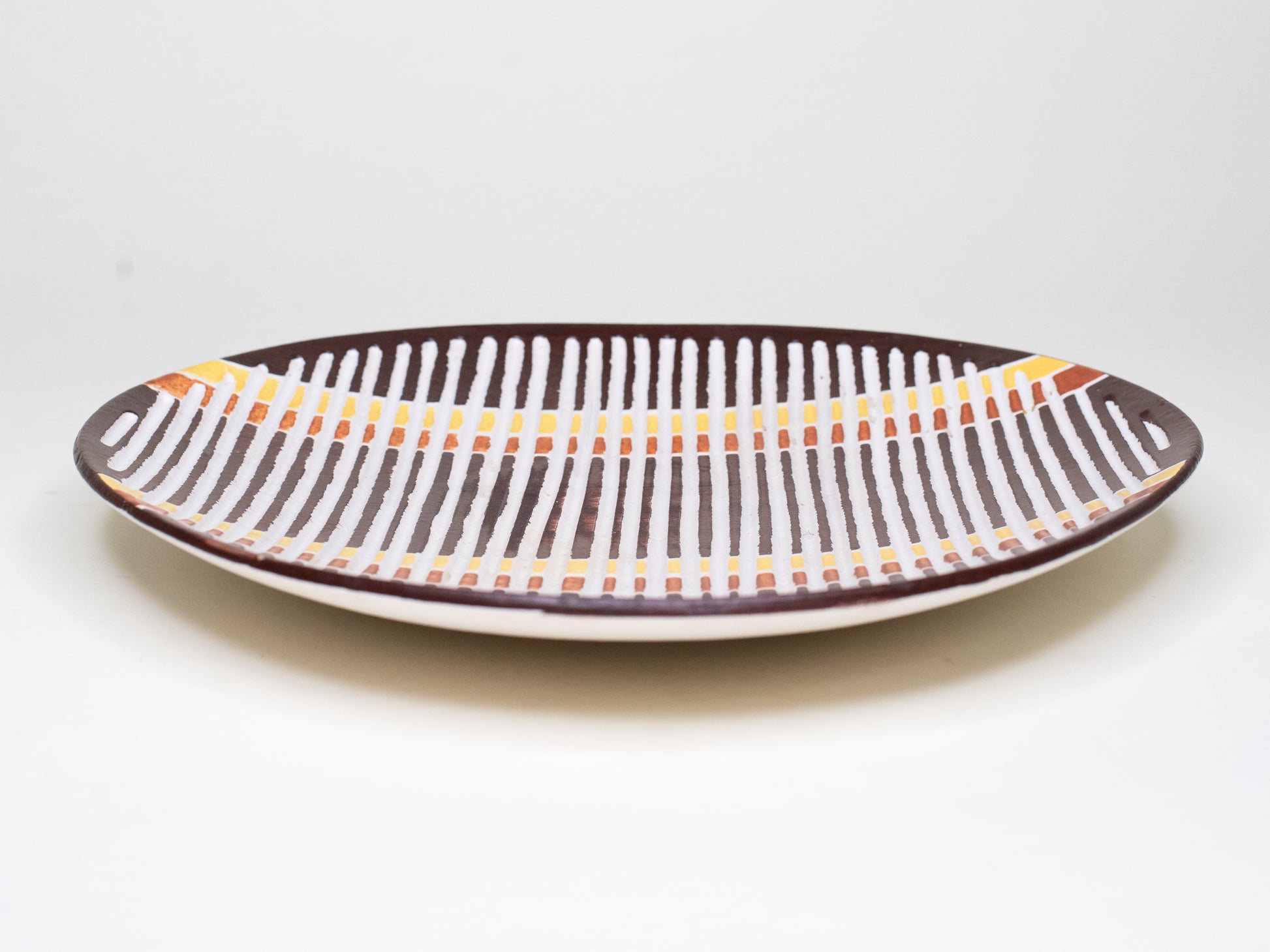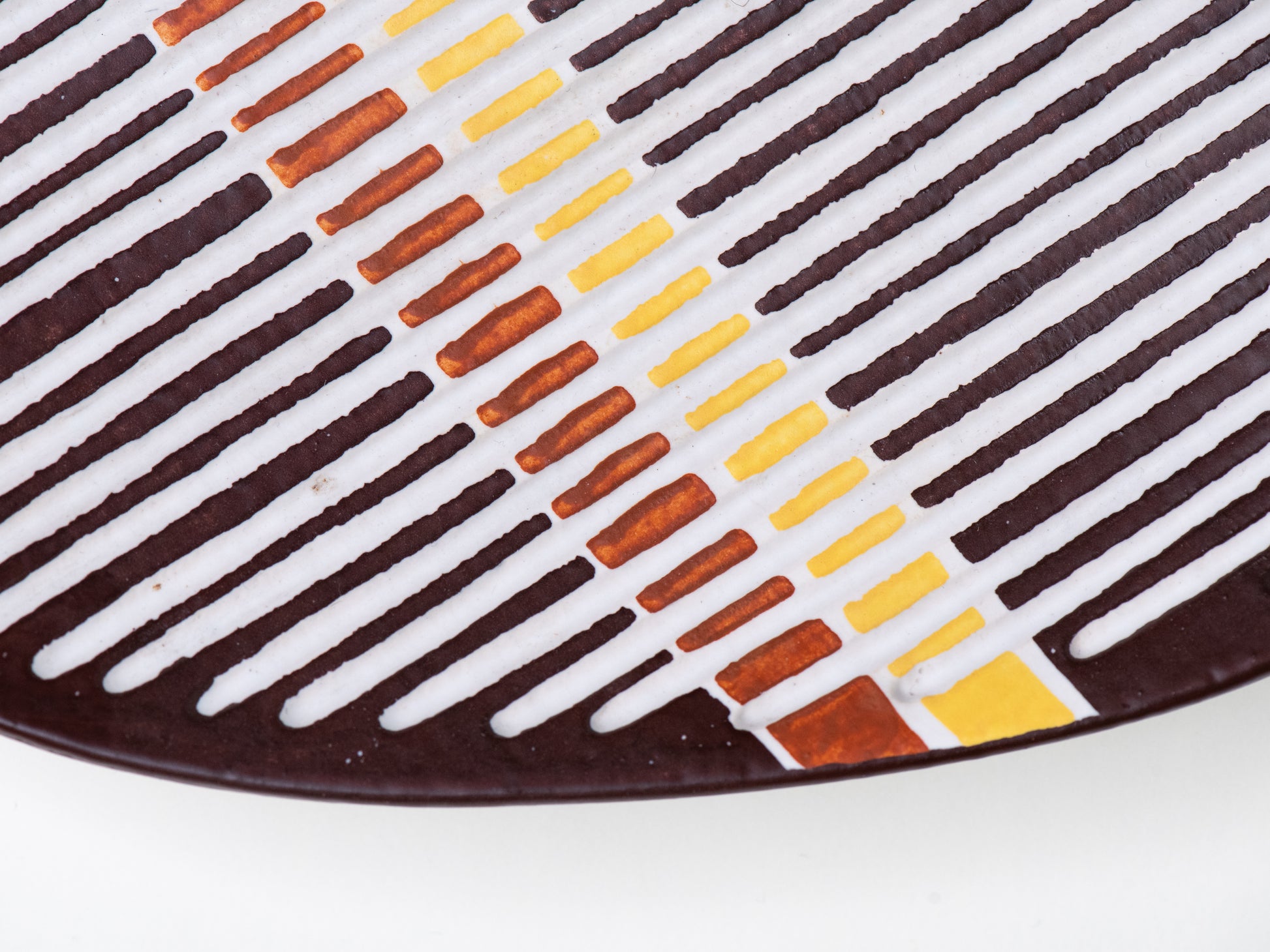 A stunning pair of hand-decorated ceramic dishes from West Germany, made in the 1950s in the Hawaii pattern - one of the most striking designs of the era. The rhythmic sgraffito lines and warm bands of brown, orange and yellow capture the optimistic, sun-soaked mood of postwar modernism.