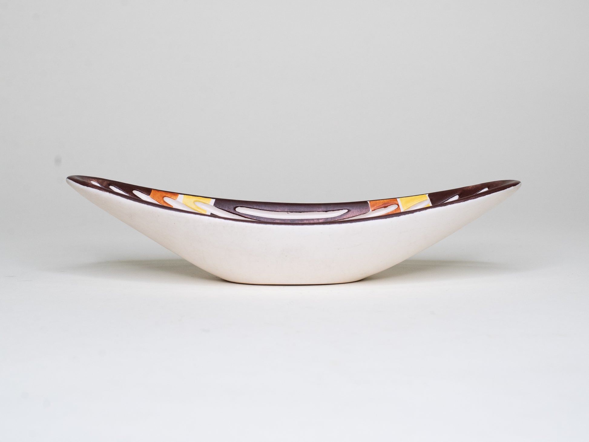 Made by ILKRA (Edel Keramik), a respected West German pottery known for its expressive glazes and distinctive hand-painted decor. Each piece is unique in its shape and painting: one is a shallow triangular plate, the other a boat-shaped dish with a softly curved silhouette.