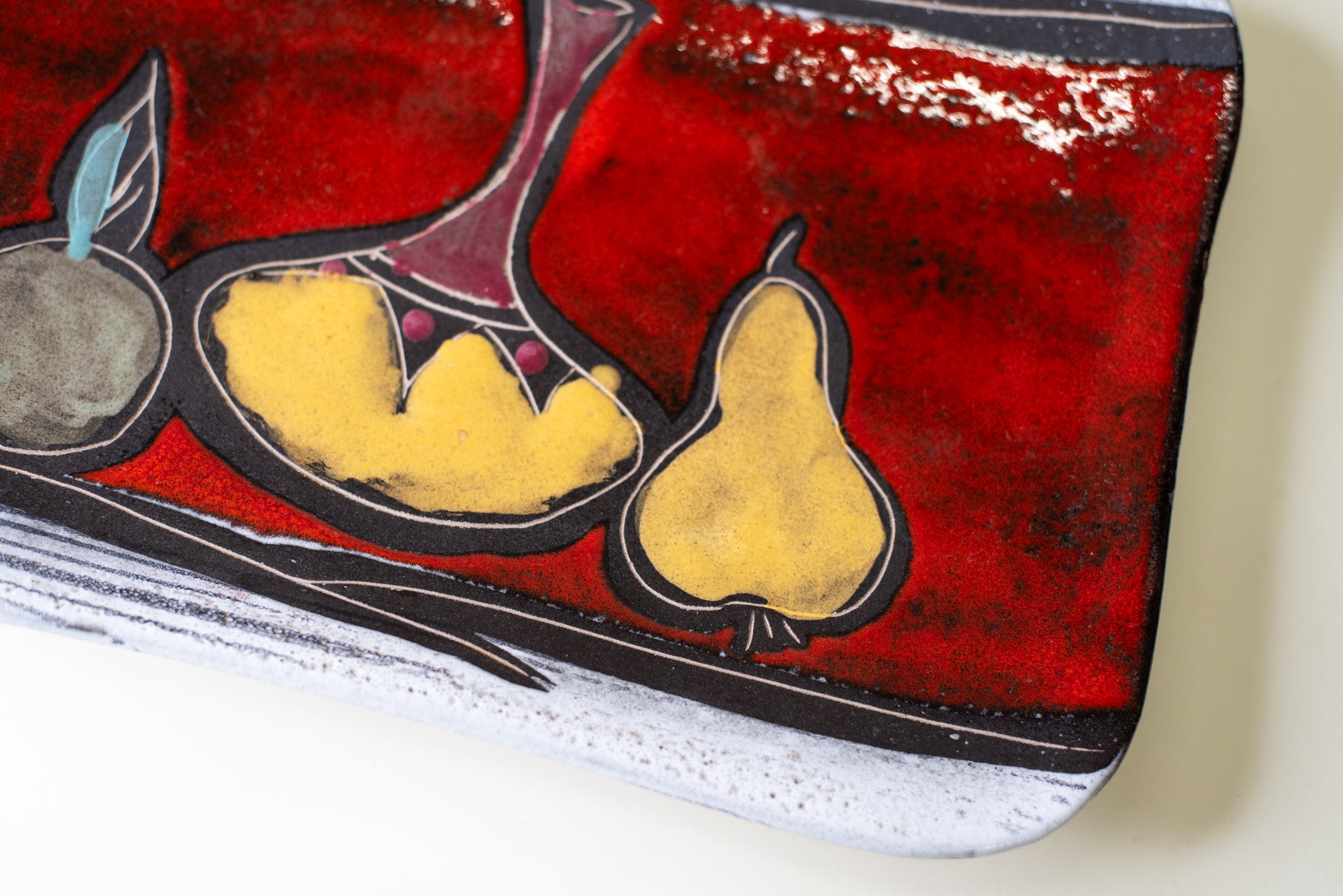 A large, hand-decorated ceramic dish glowing in deep red, with a bold fruit still-life across its surface. The sgraffito lines, strong contrasts, and painterly energy are straight out of San Marino’s ceramic tradition — but this piece was in fact produced by Scheurich in West Germany, blending Italian flair with German craftsmanship.