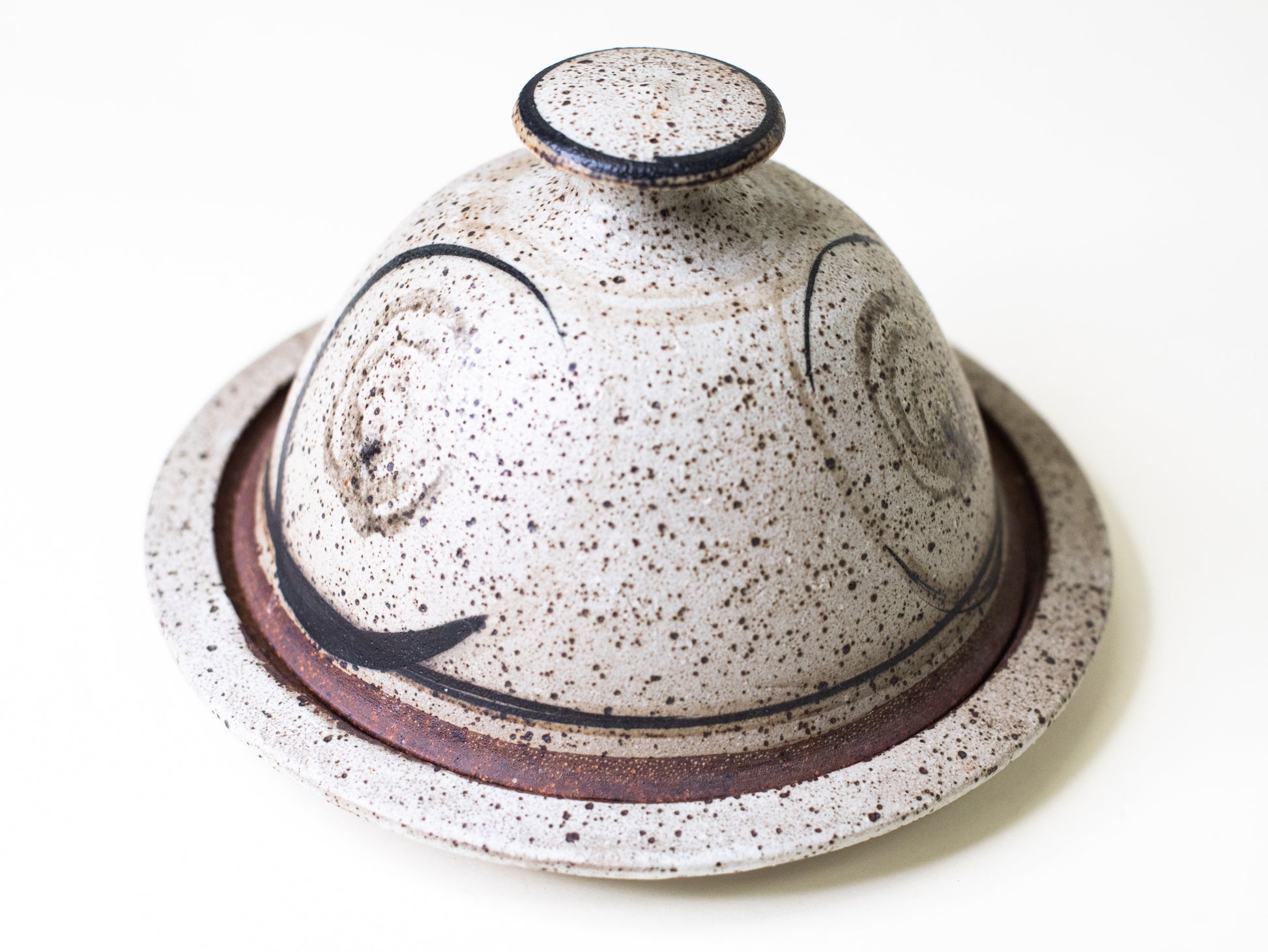 A beautifully understated studio ceramic covered dish featuring a speckled glaze in grey and tan tones and a graphic hand-painted motif in oxide brushwork. The form feels very satisfying - the lid snugly fits the base, and the proportions are tight and elegant.