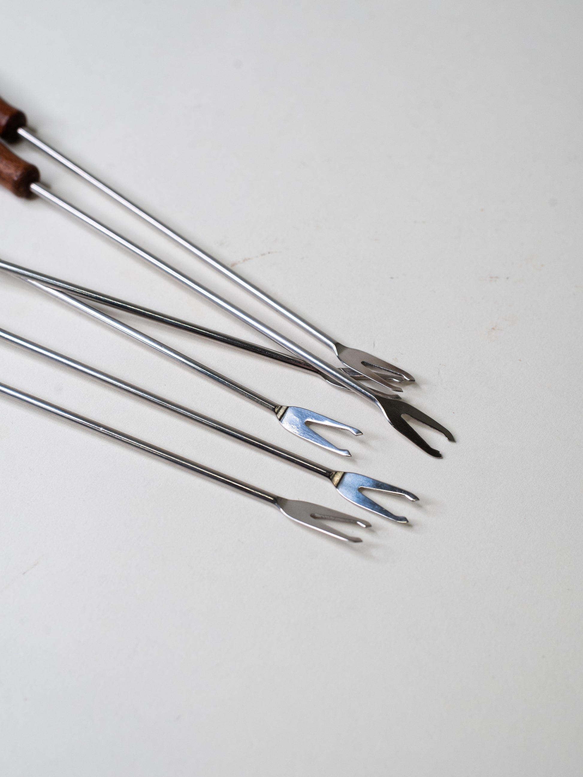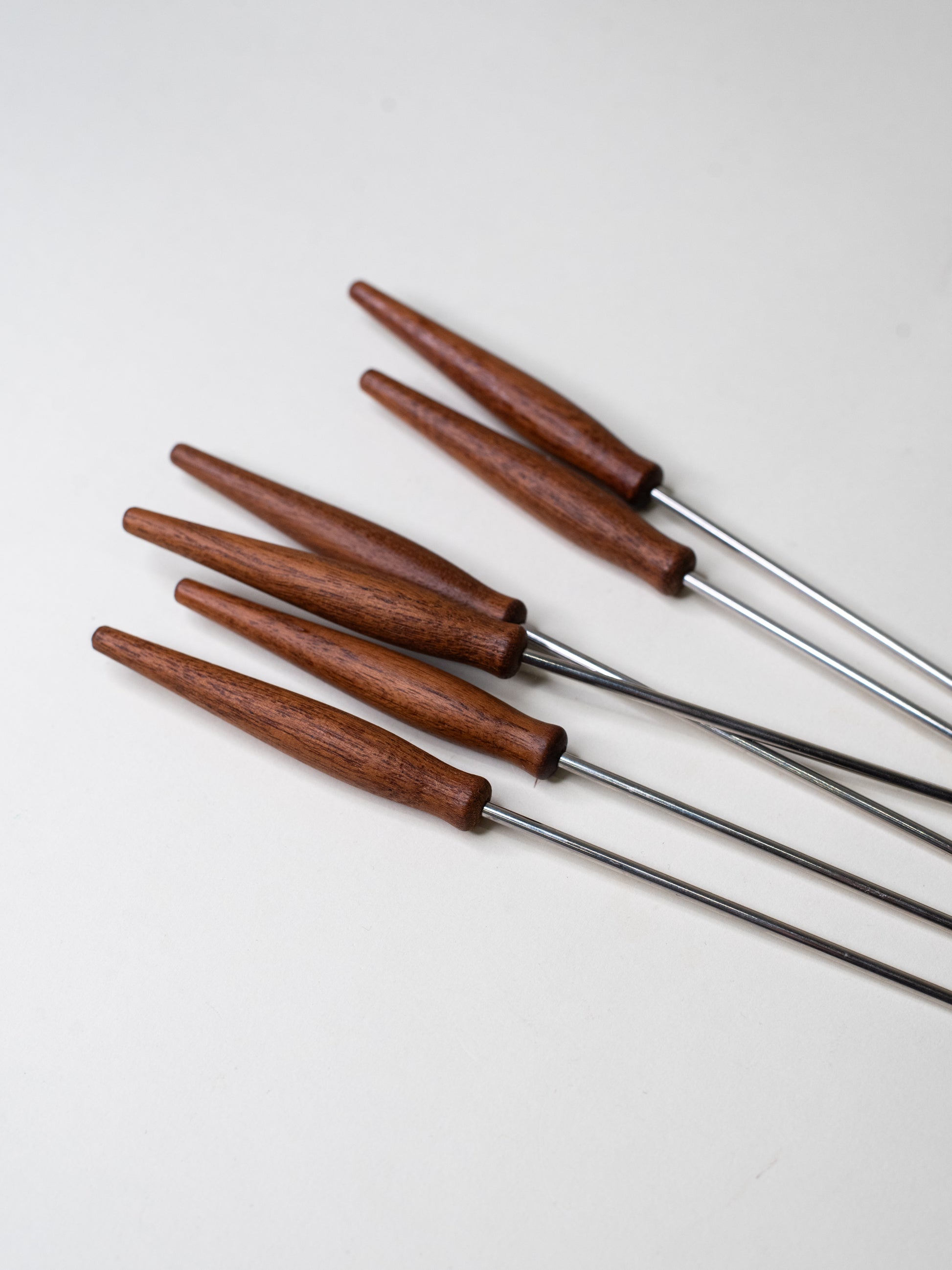A set of six mid-century fondue forks with beautifully shaped teak handles and stainless steel tines. The handles have a clean, elongated form that fits perfectly in hand: simple, elegant, and unmistakably Scandinavian.