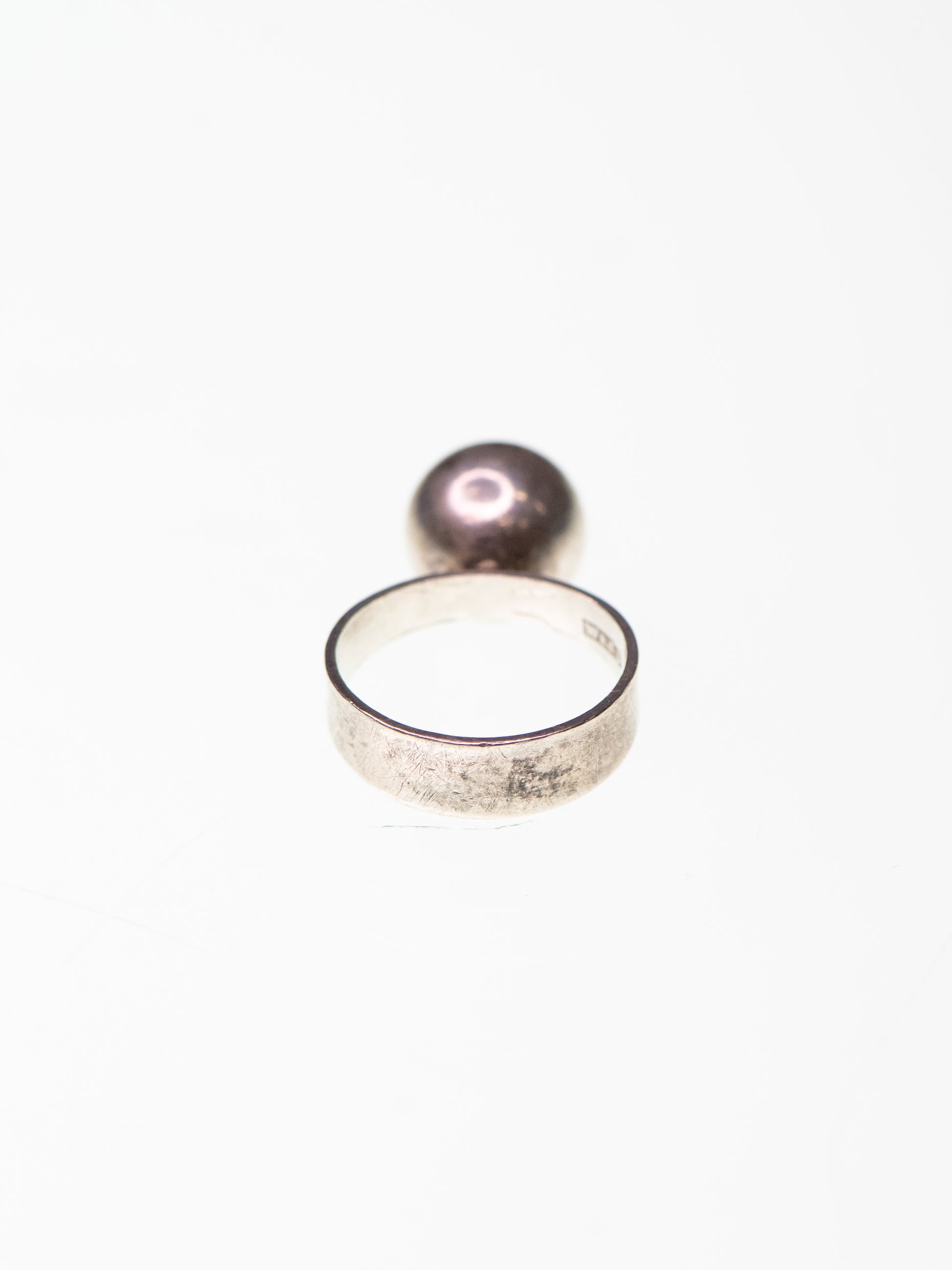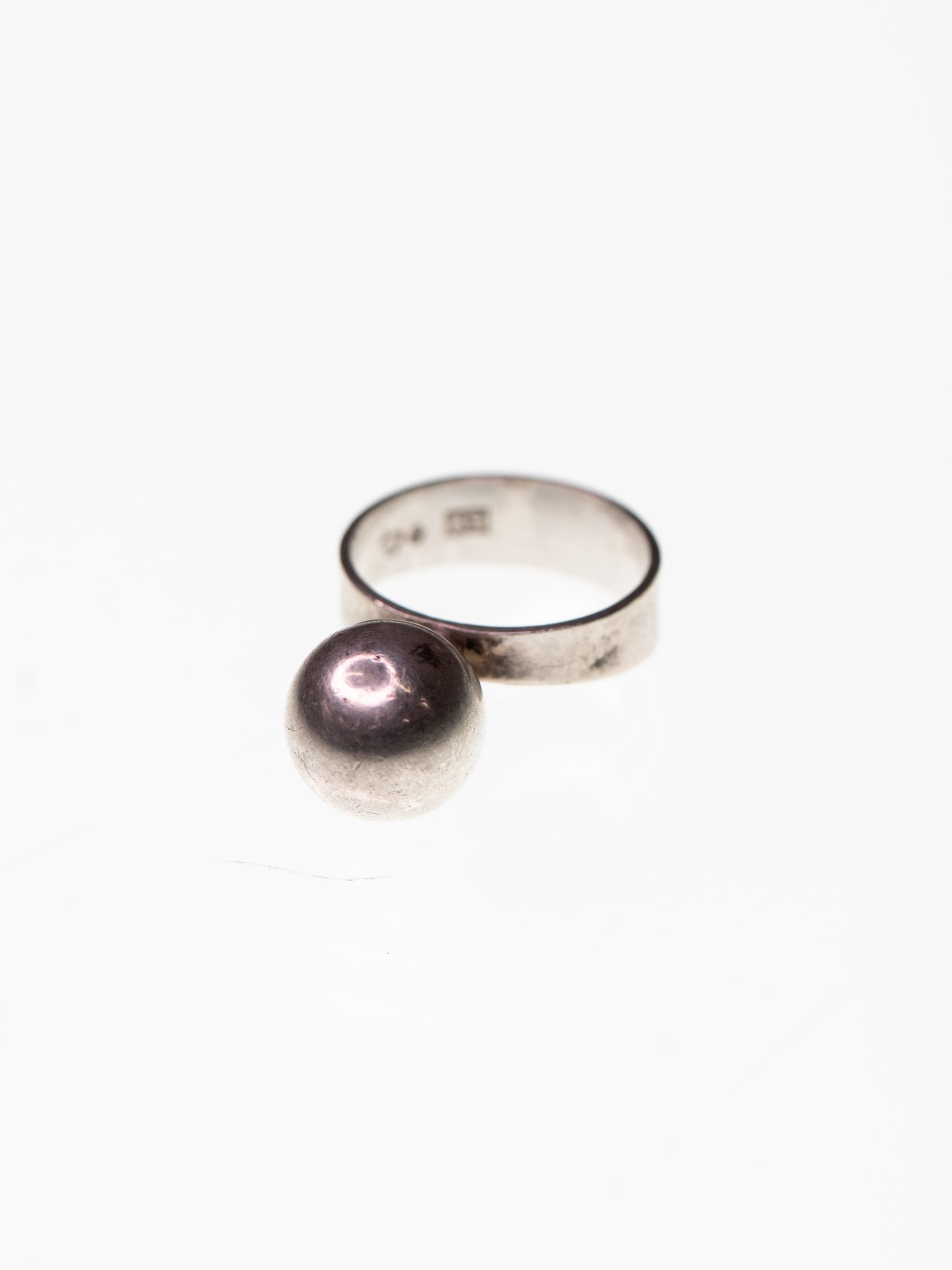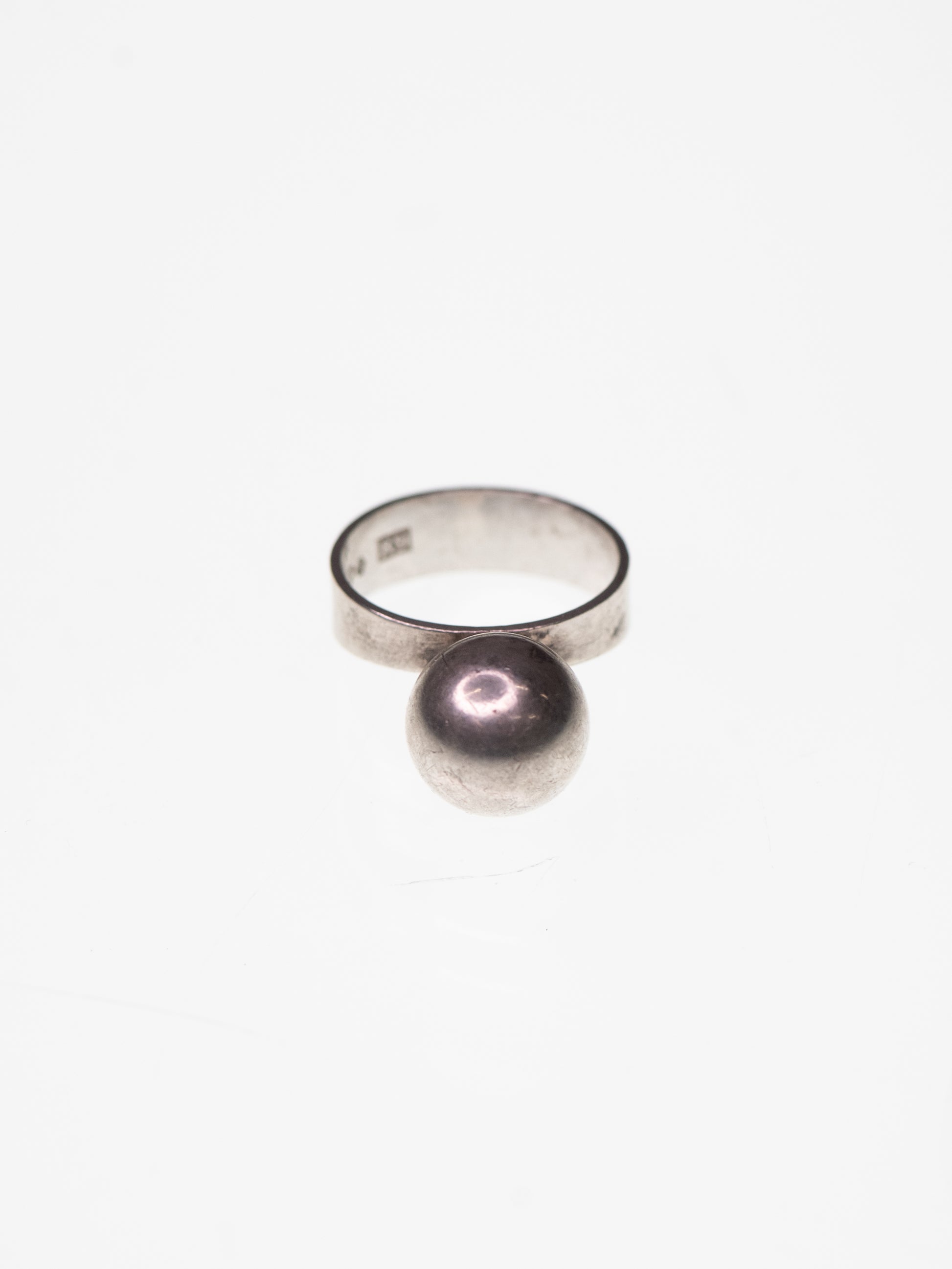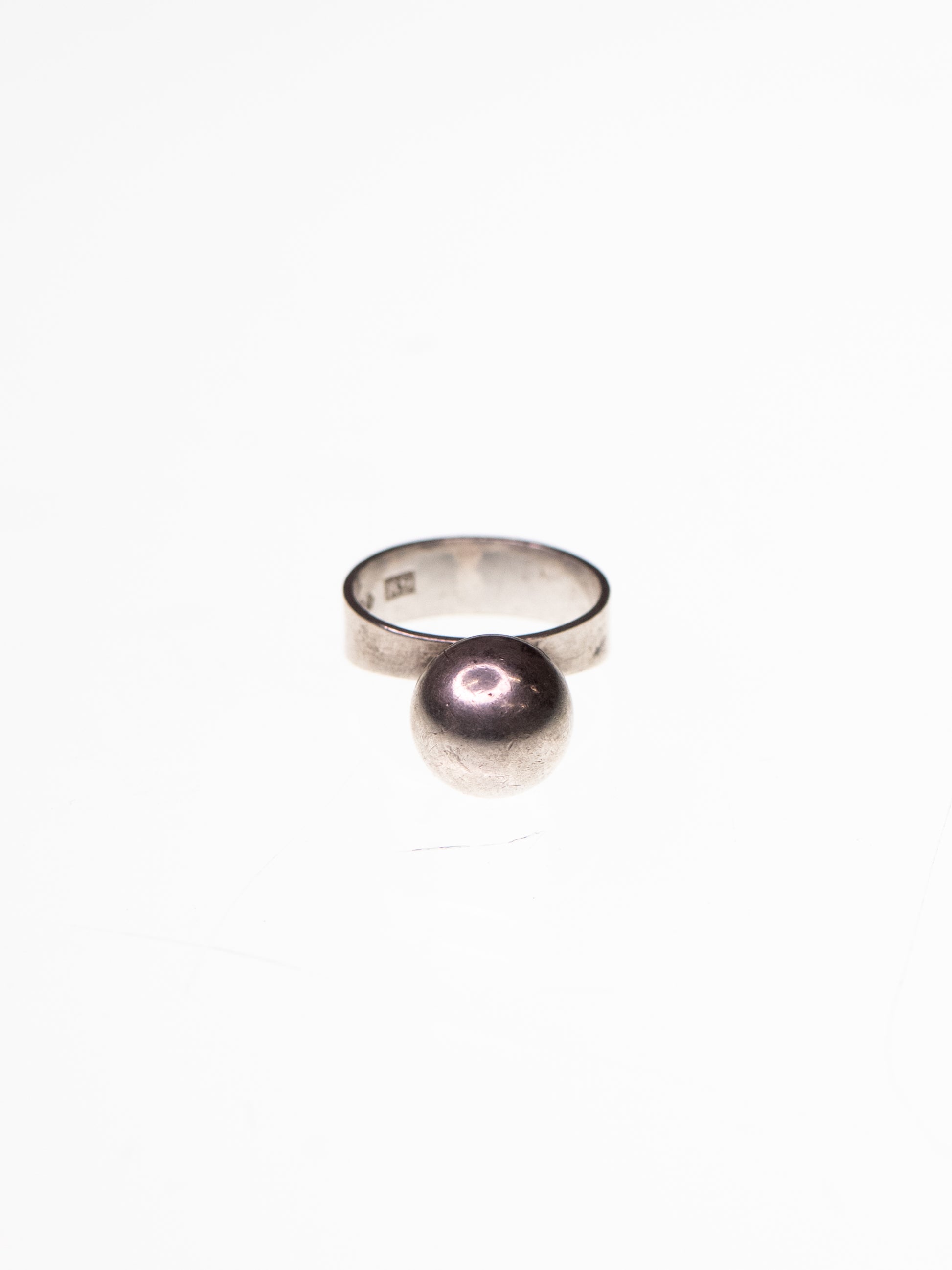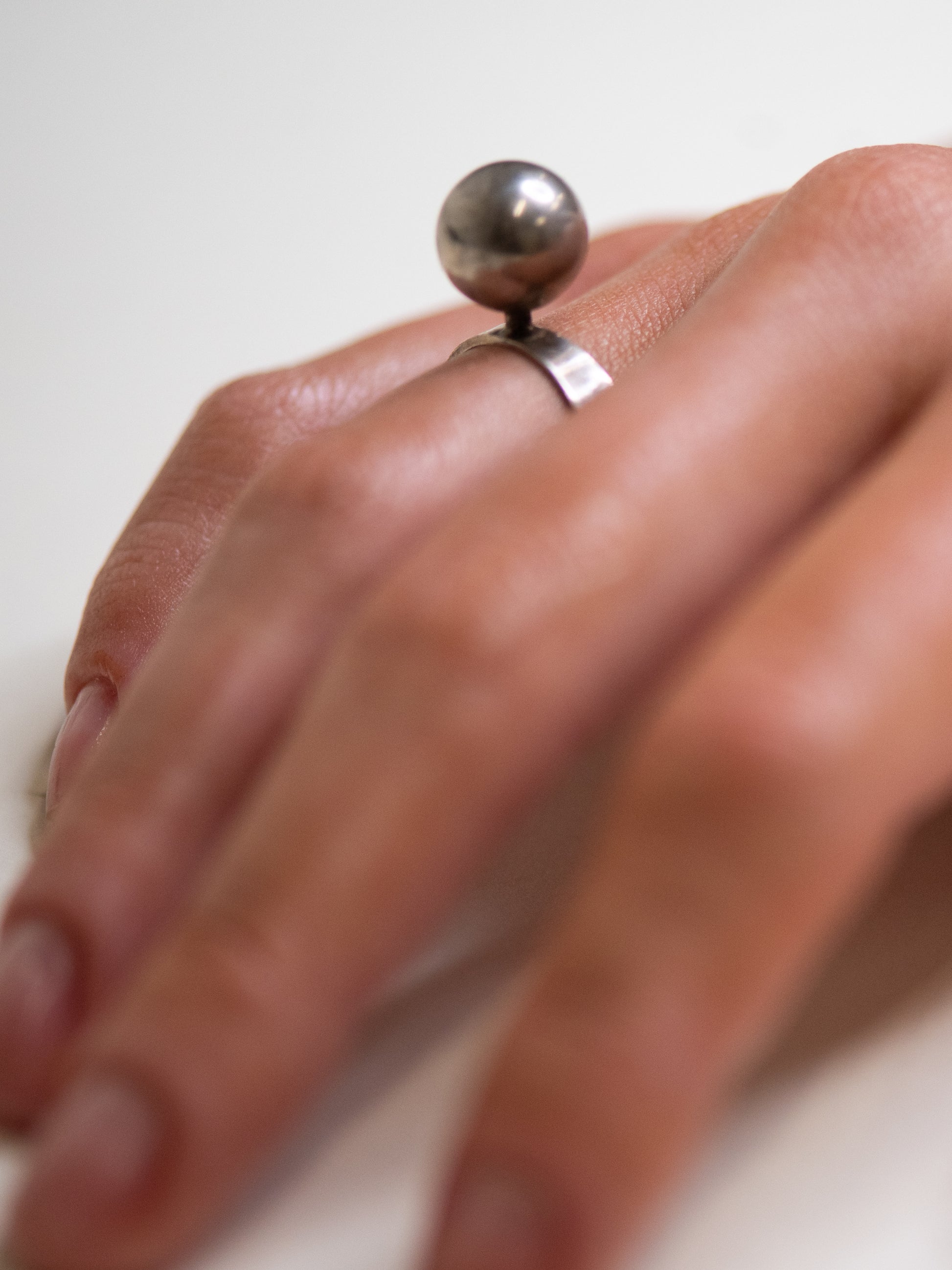 A small, confident silver ring built around a simple, rounded sphere. It sits solidly on the finger, smooth to the touch, with just enough weight to feel reassuring from the first wear.