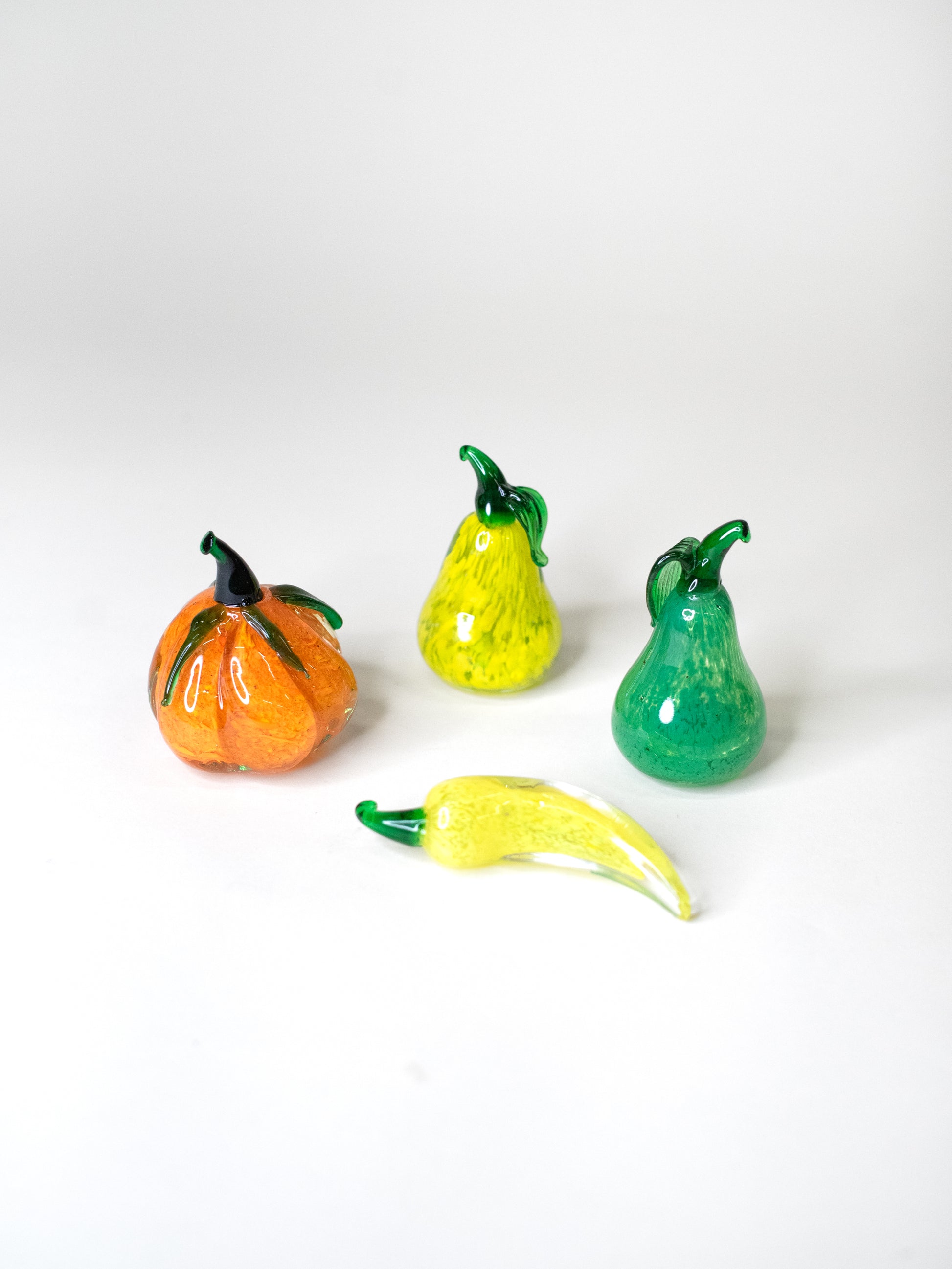 Displayed together, this set works almost like a small glass still life: full of color, texture, and vibrant energy. The chili has lost its tip, but the rest are in excellent condition.