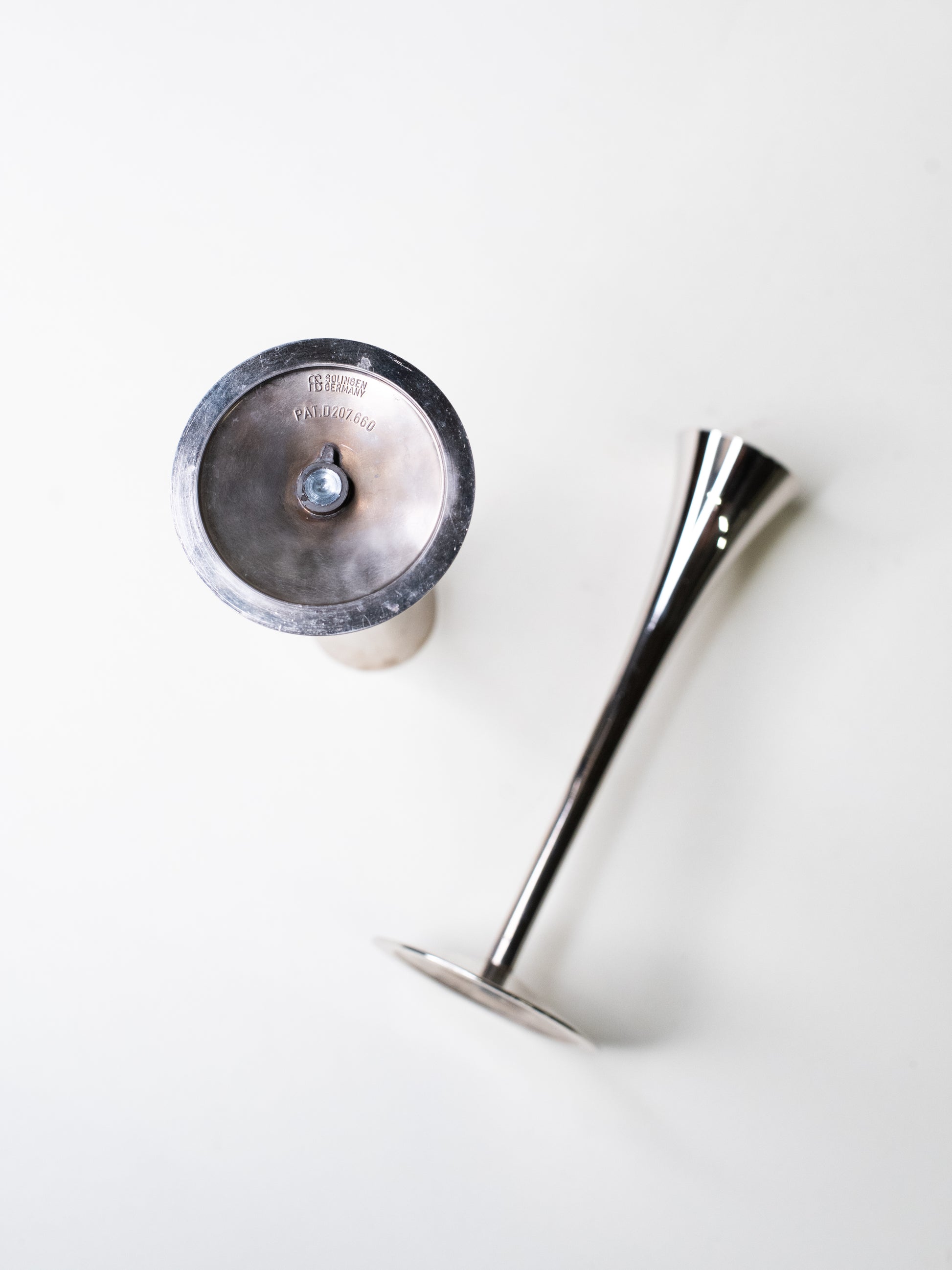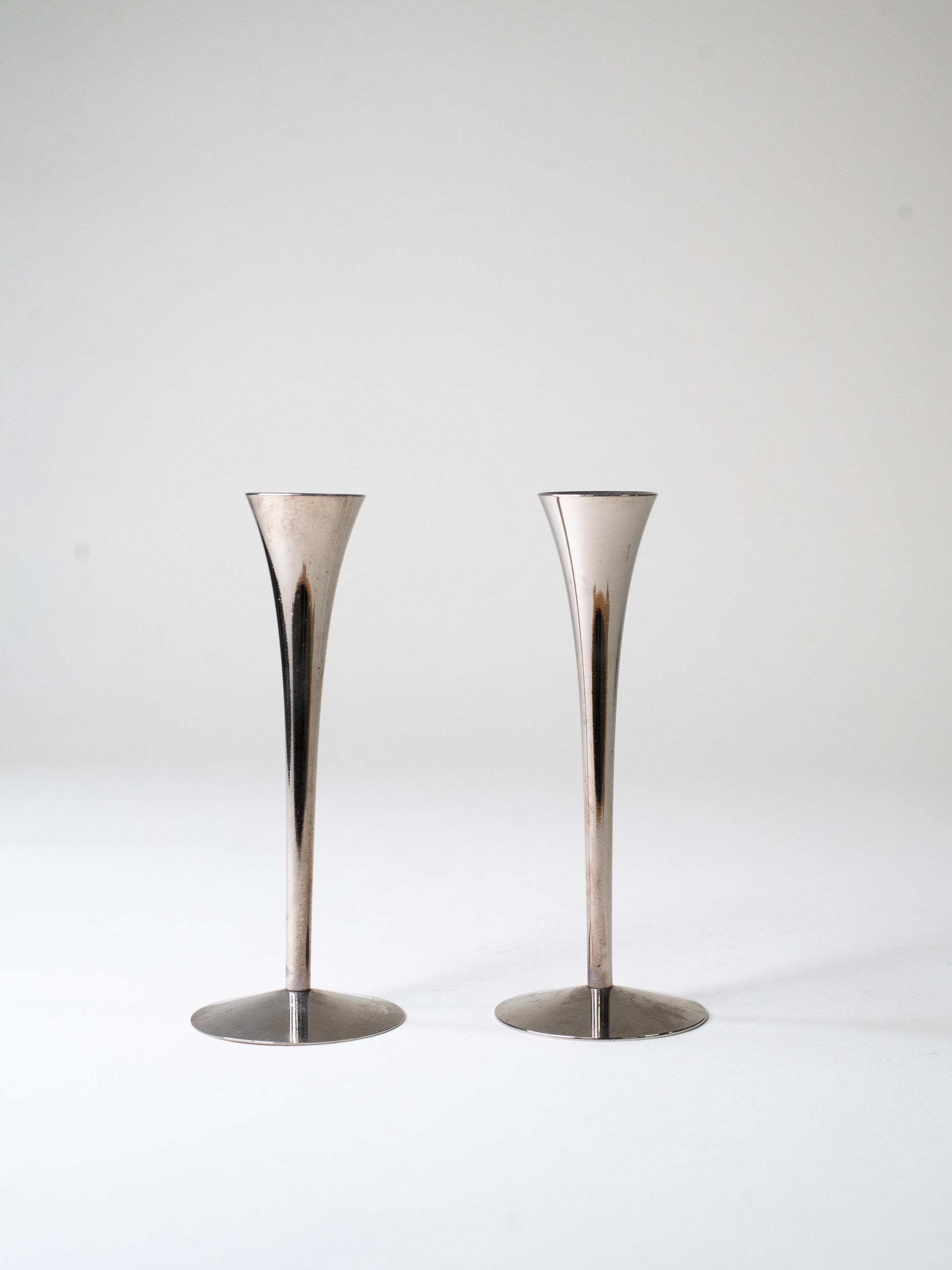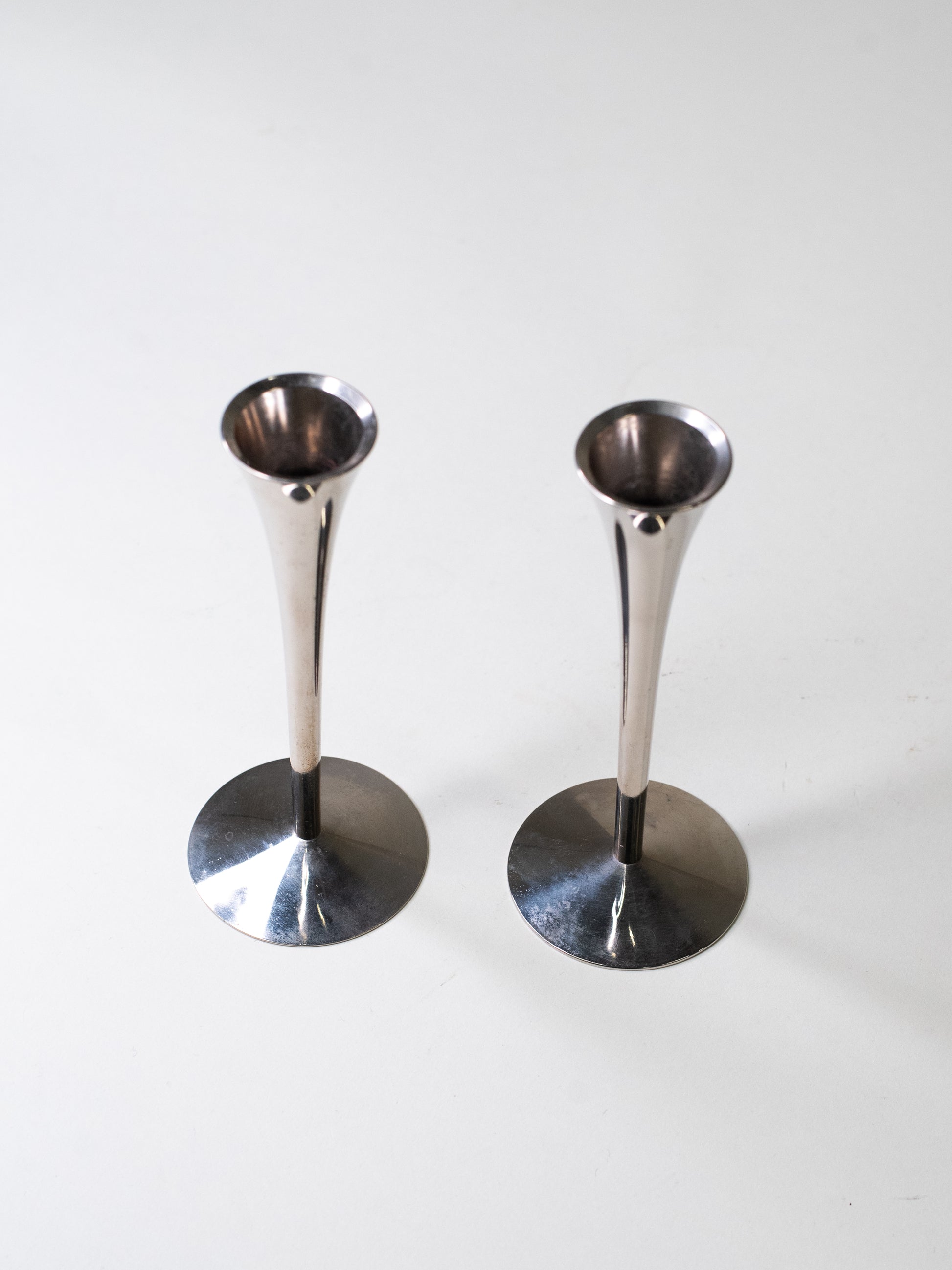 Pair of chrome candle holders designed by Arthur Salm and produced in Solingen, Germany, in the 1960s. The form is pure and balanced: a long, flaring stem rising from a simple round foot. Made for a standard tapered candle, these pieces embody the effortless elegance of postwar German modernism.