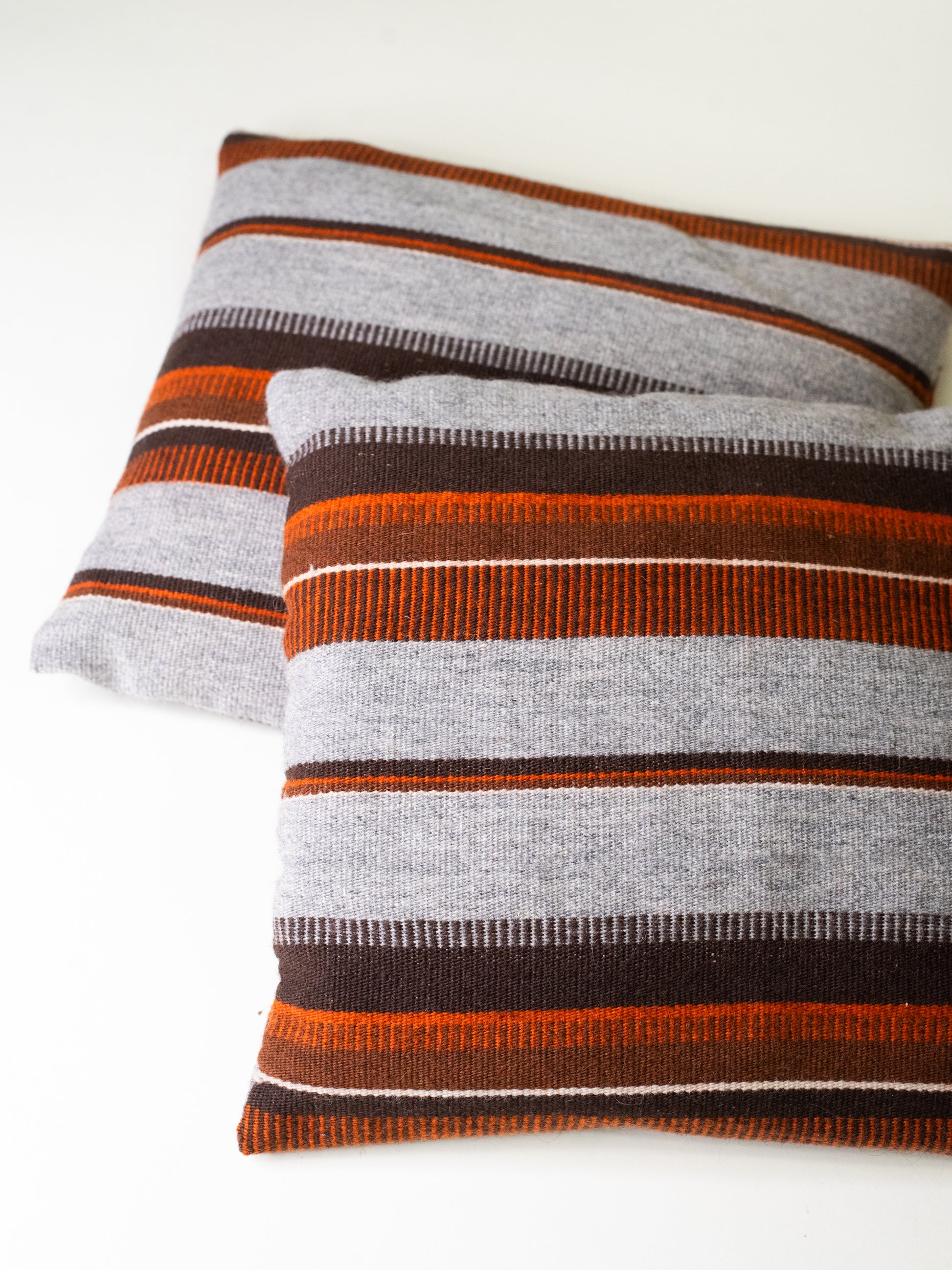 A pair of striped wool pillows that somehow manage to be both a little floppy and completely irresistible. Handmade in the style of Finnish raanu textiles - sturdy wool weave, warm earthy tones, and that unmistakable Nordic craft feel.