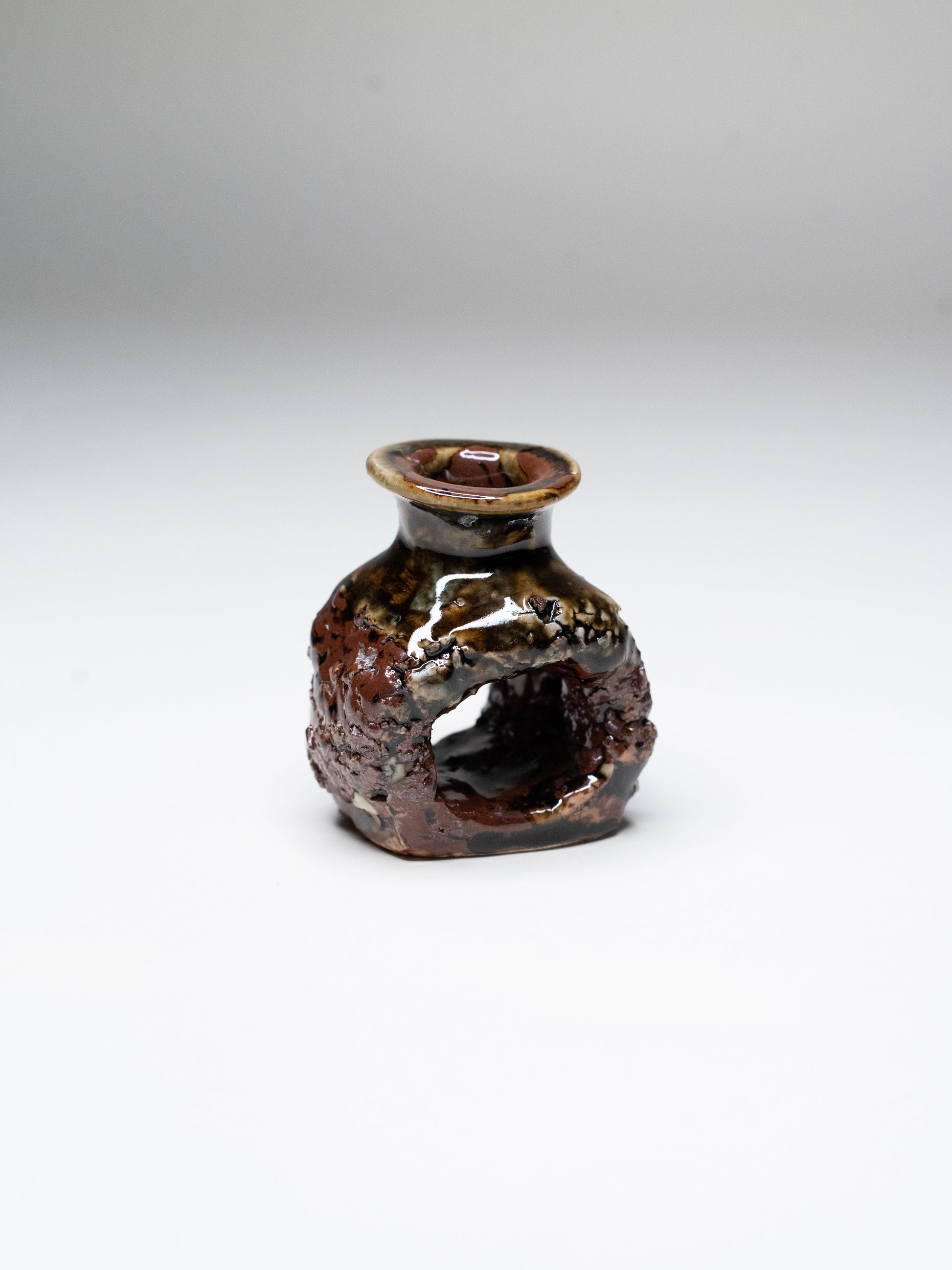 This piece has a hollow, cave-like form with warm brown clay and greenish, moss-toned glaze pooling around the upper section. A small, rugged sculpture with a quiet organic presence. Stamped with Pentik’s early studio logo.