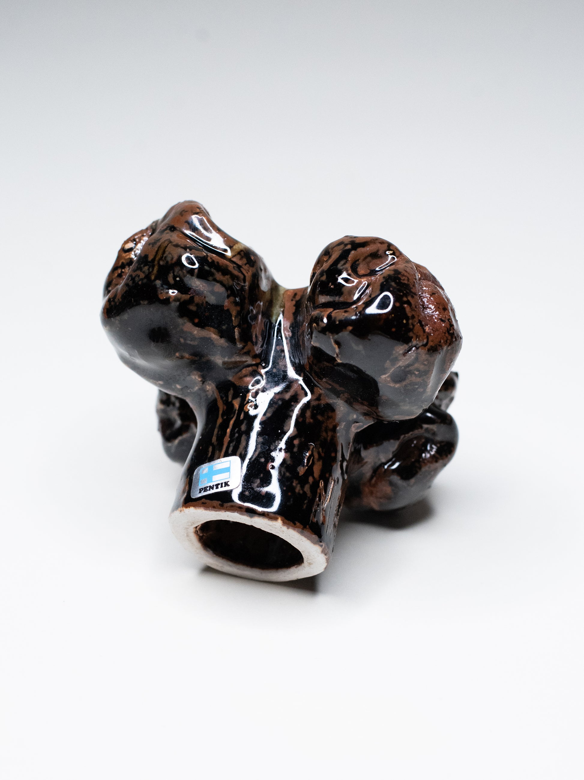 This 7.5 cm piece is glazed in deep brown, mossy green and black, and carries the original Pentik sticker. It's signed MM for Marjut Maarni, who helped produce these pieces when demand grew beyond what Anu Pentik could make alone.