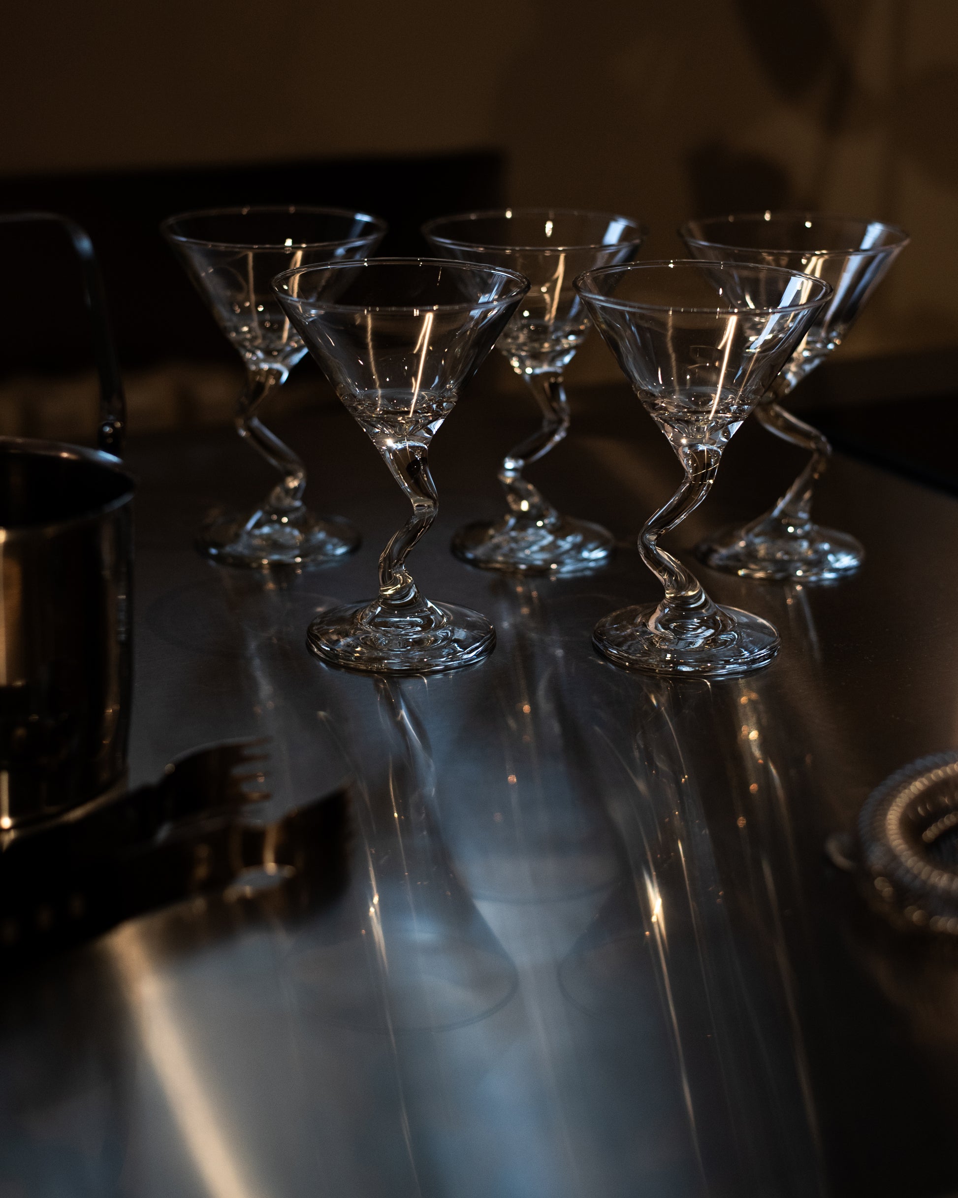 Mid-century glamour reimagined for the 1980s - these iconic “Z-Stem” martini glasses by Libbey bring a whimsical twist to classic cocktail culture. Clear bowls paired with the sculptural zig-zag stem make them instantly unforgettable and full of character.