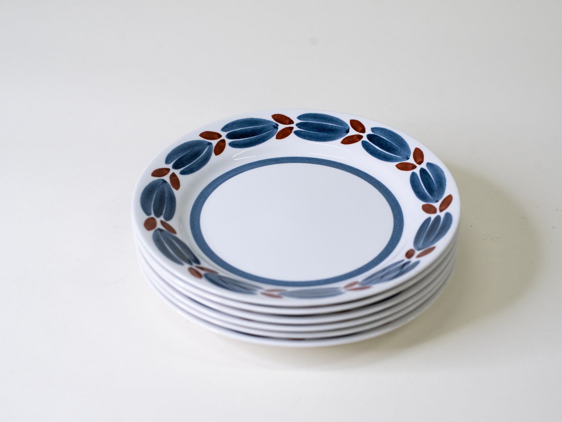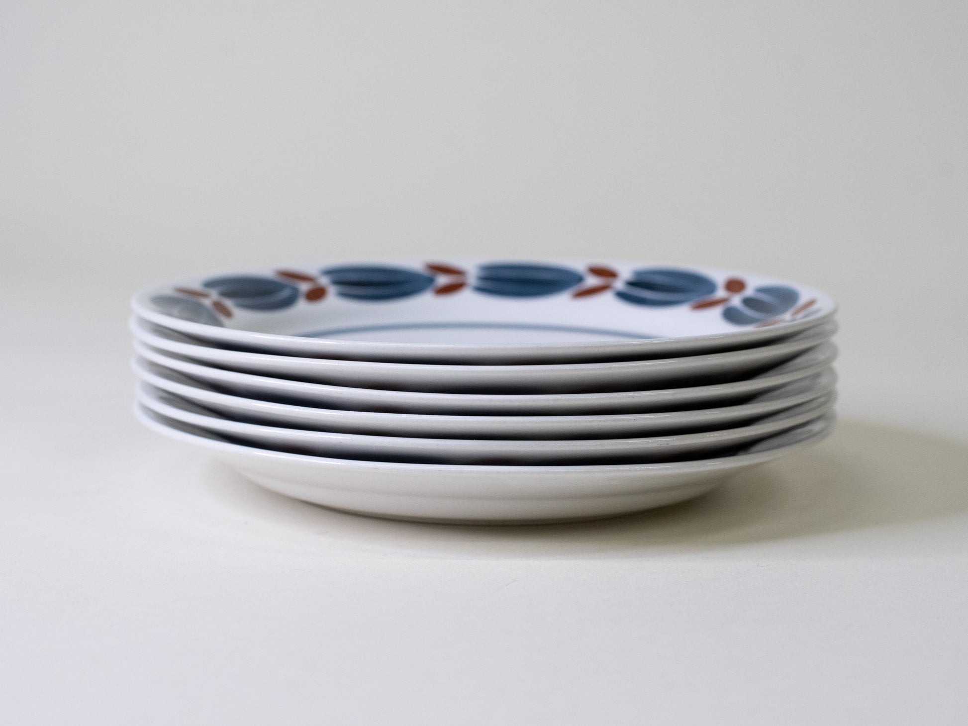 A rare hand-painted series from Arabia’s Botnia collection, designed by Olga Osol and produced in 1968. Each plate features a rhythmic wreath of blue and brick-red brushstrokes - a confident, modern interpretation of Finnish folk motifs. The result is crisp, graphic, and full of warmth.