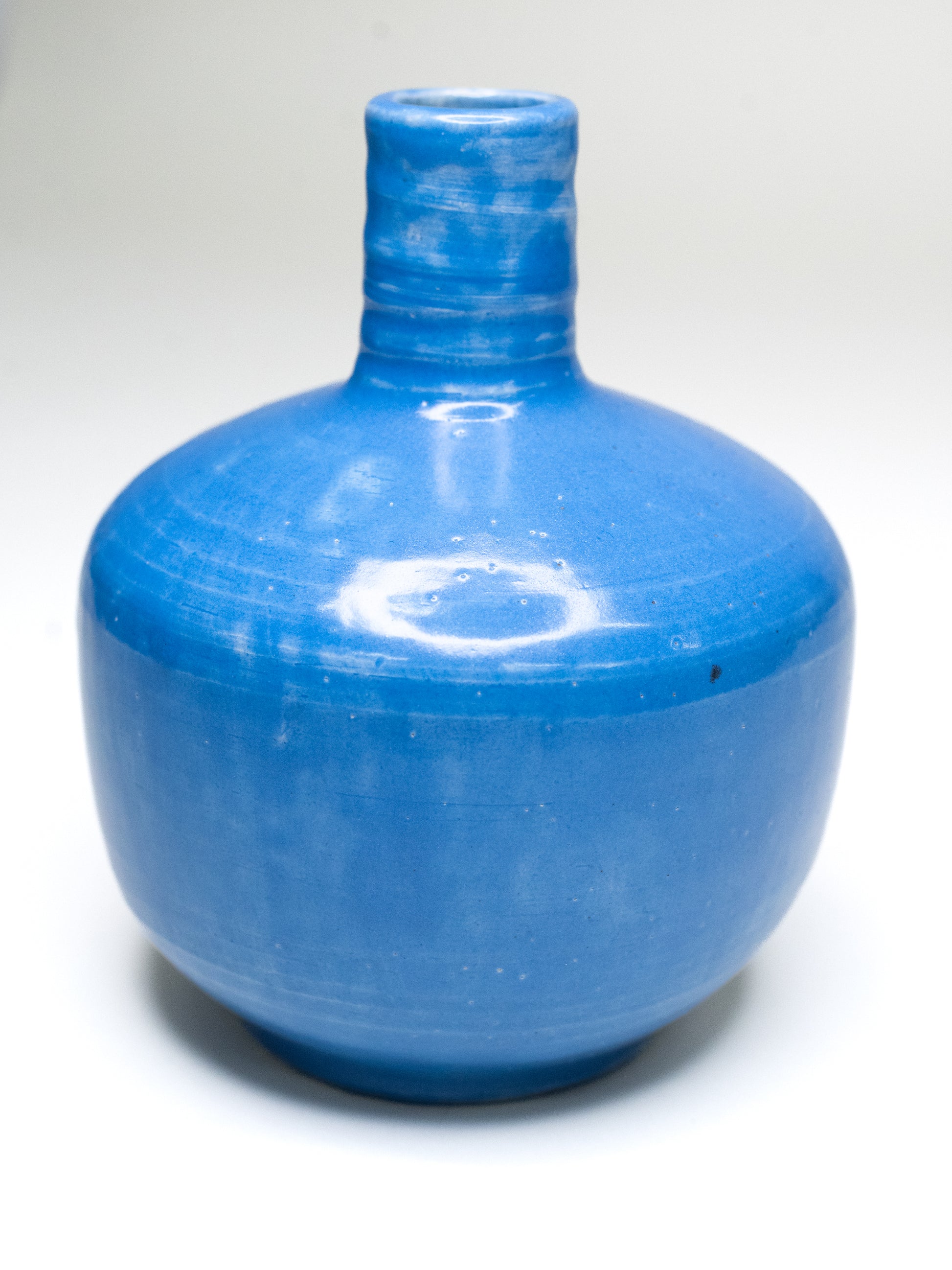 A rare early studio vase by Mirjam Stäuber, thrown in 1935 and finished in a luminous, layered blue glaze that immediately draws the eye. The glaze moves subtly across the surface, with gentle tonal shifts, visible brushwork, and natural variation from the firing. Small glaze irregularities and a dark firing mark are present, typical of the era and the studio process.