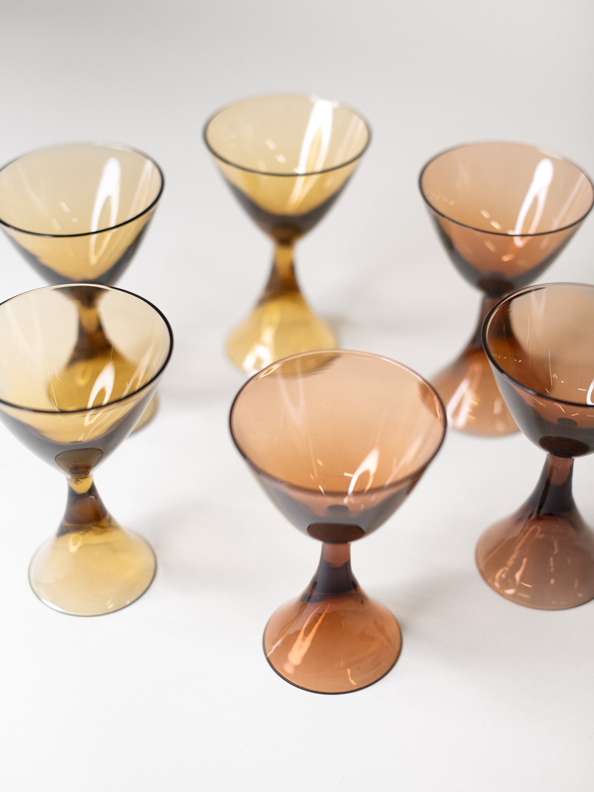 A rare set of six vintage cocktail glasses in thin handblown glass, three in warm light amber and three in a deeper amber-brown. Stunning hourglass profile.