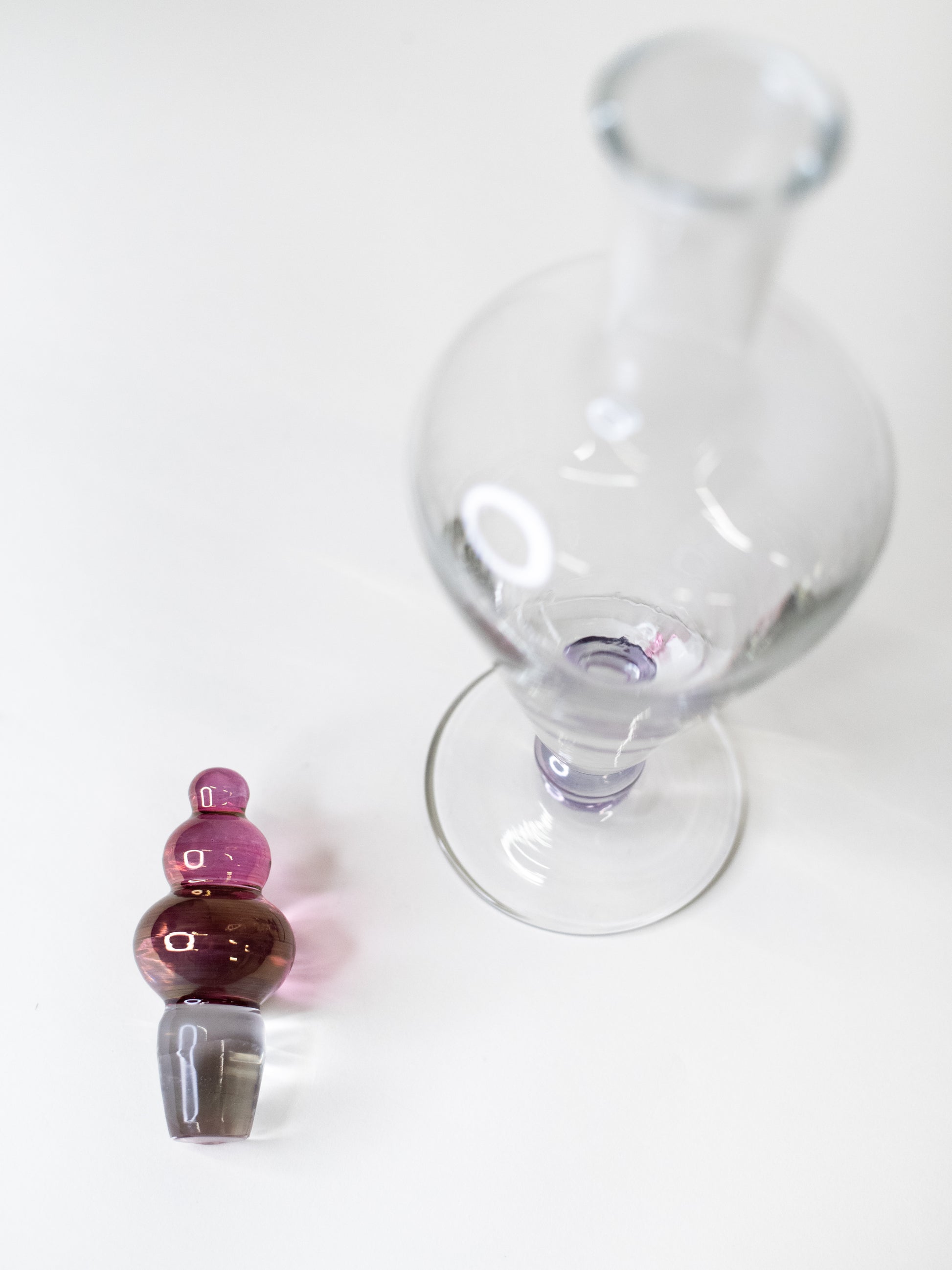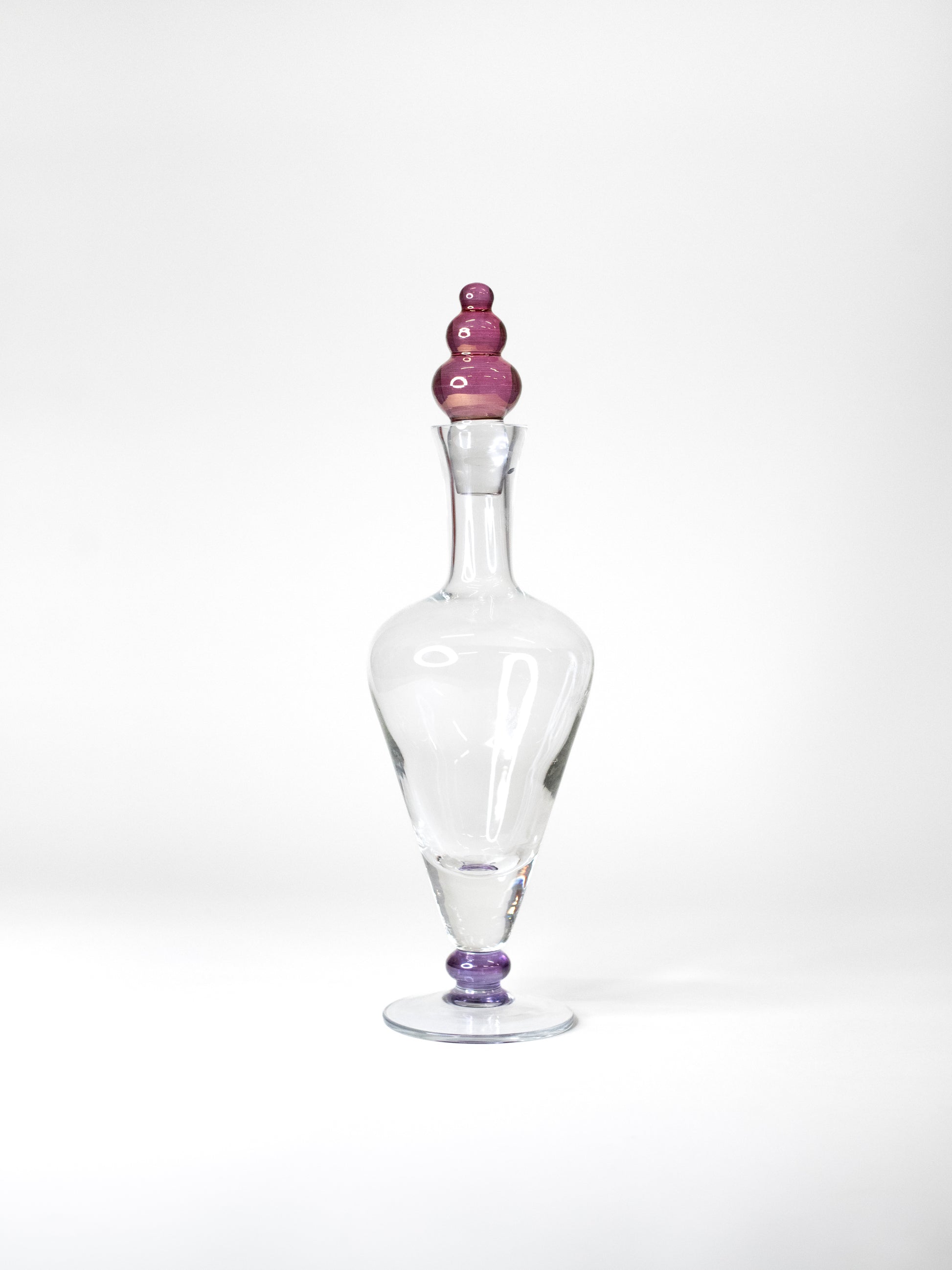 A rare and stunning piece of mid-century European glass design. This tall decanter pairs a clear, finely blown form with a sculptural stopper and matching base detail finished in deep purple lustre glass. Elegant, bold, and unmistakably modernist.