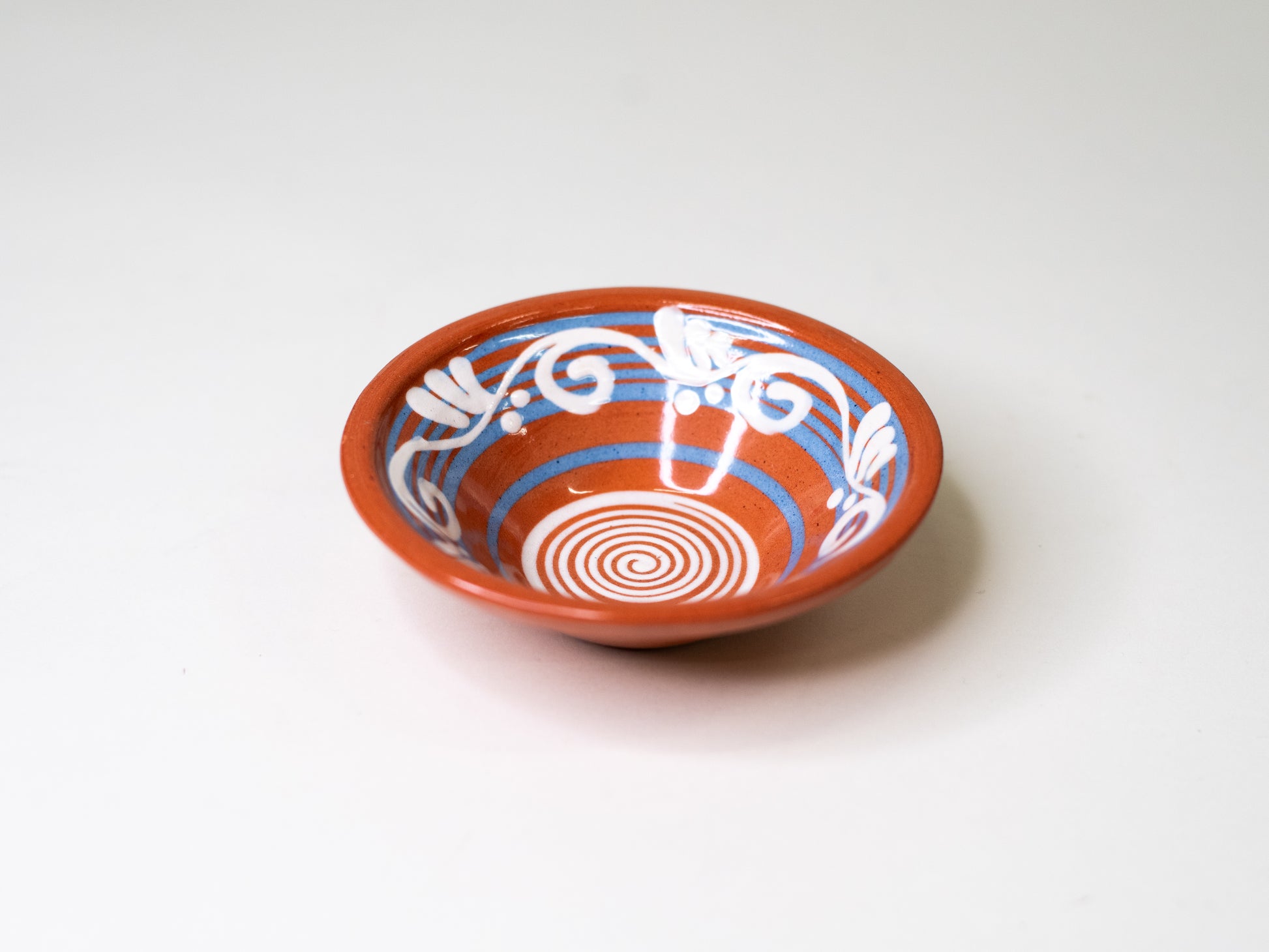 A charming vintage bowl by Finnish ceramicist Gudrun Raunio for Kupittaan Savi. The terracotta base carries a lively hand-painted decoration in white and blue: a swirling, almost hypnotic pattern that feels both folk-art inspired and distinctly mid-century. Each brushstroke shows the natural irregularity of handwork that defined Kupittaa’s production.