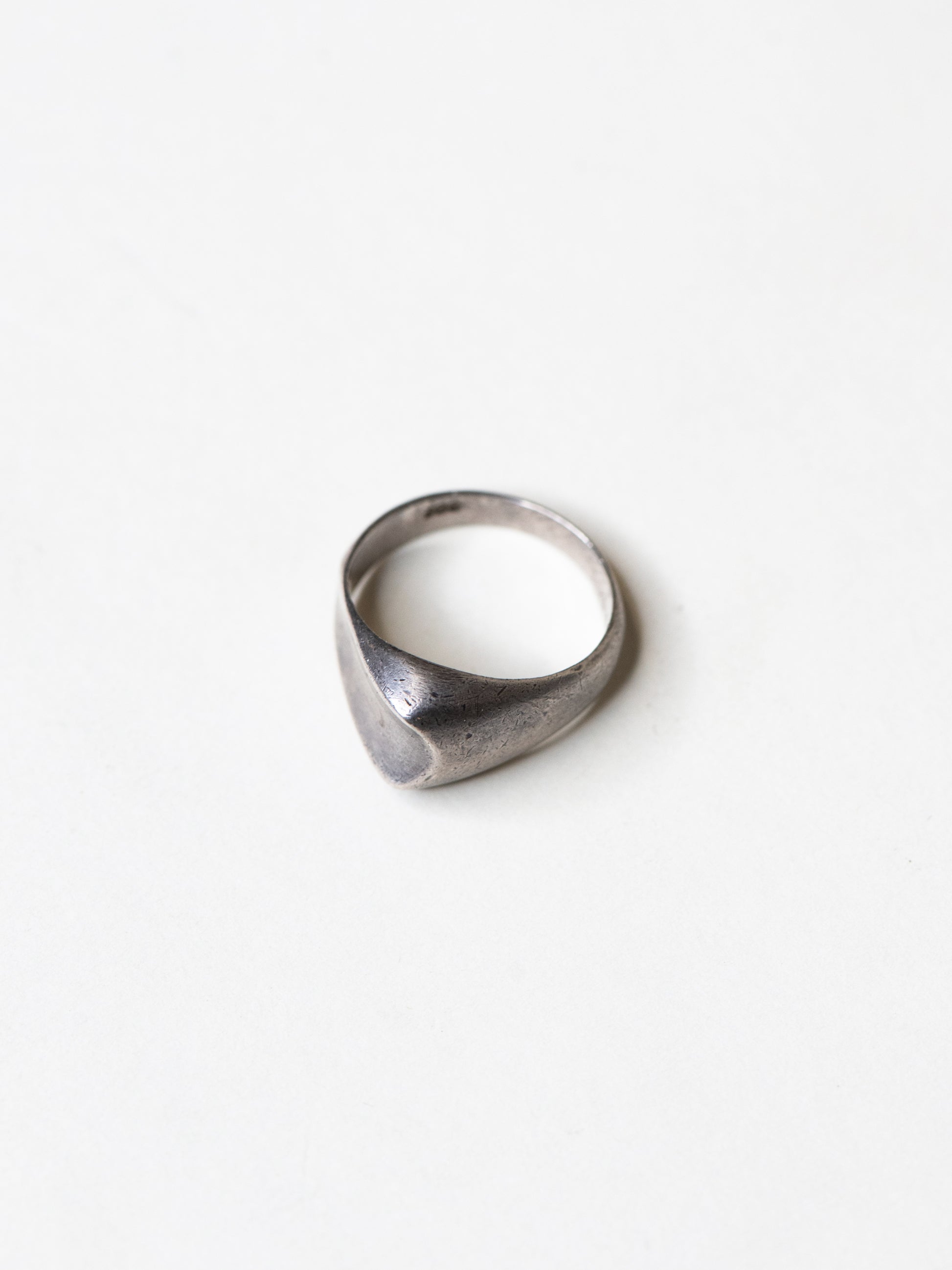 A solid sterling silver ring with a softly raised, shield-like face. The top is gently domed and slightly asymmetrical, giving it a natural, worn-in shape rather than a strict geometric form. The surface carries fine scratches and a soft, even patina that sits comfortably across the metal.
