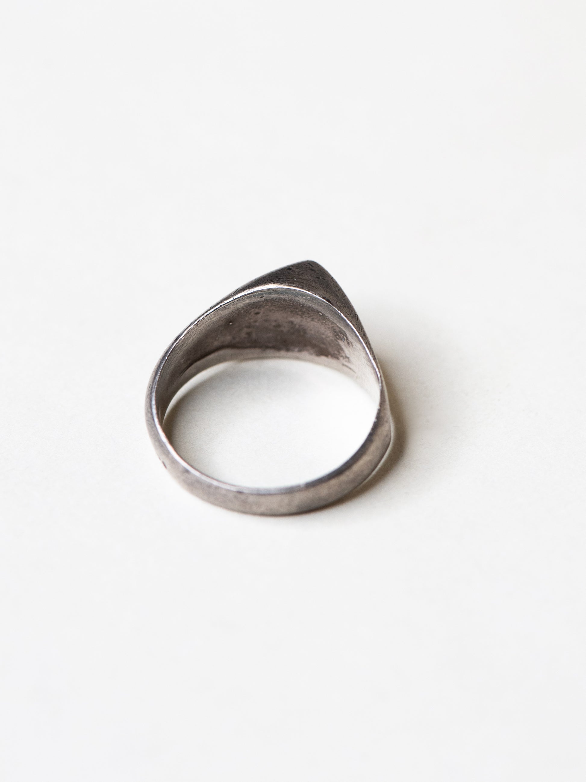 A strong everyday ring with quiet presence. The shape is simple but holds attention, and the worn silver gives it depth without feeling heavy. Easy to wear on its own. The kind of piece that settles in and stays.