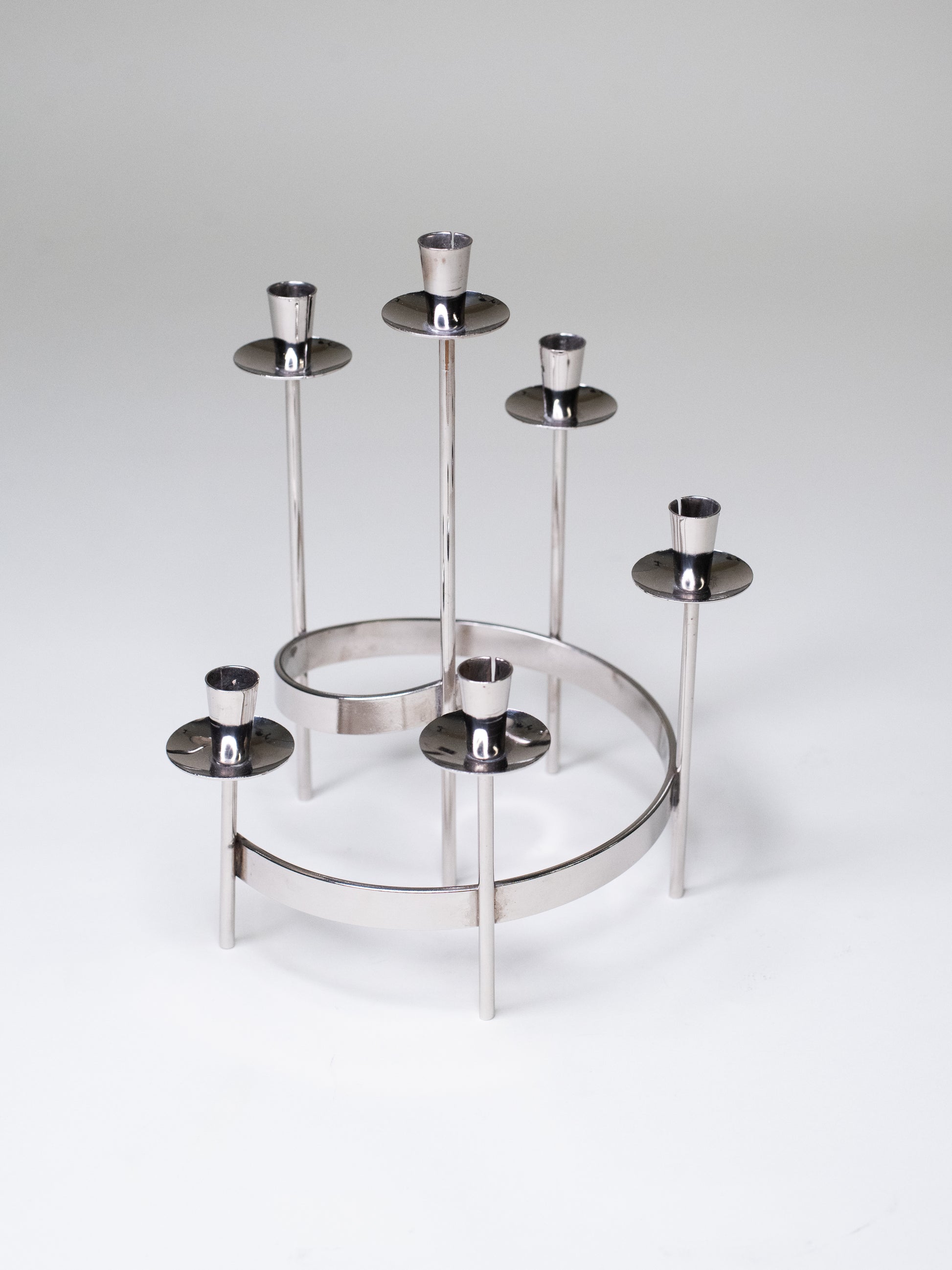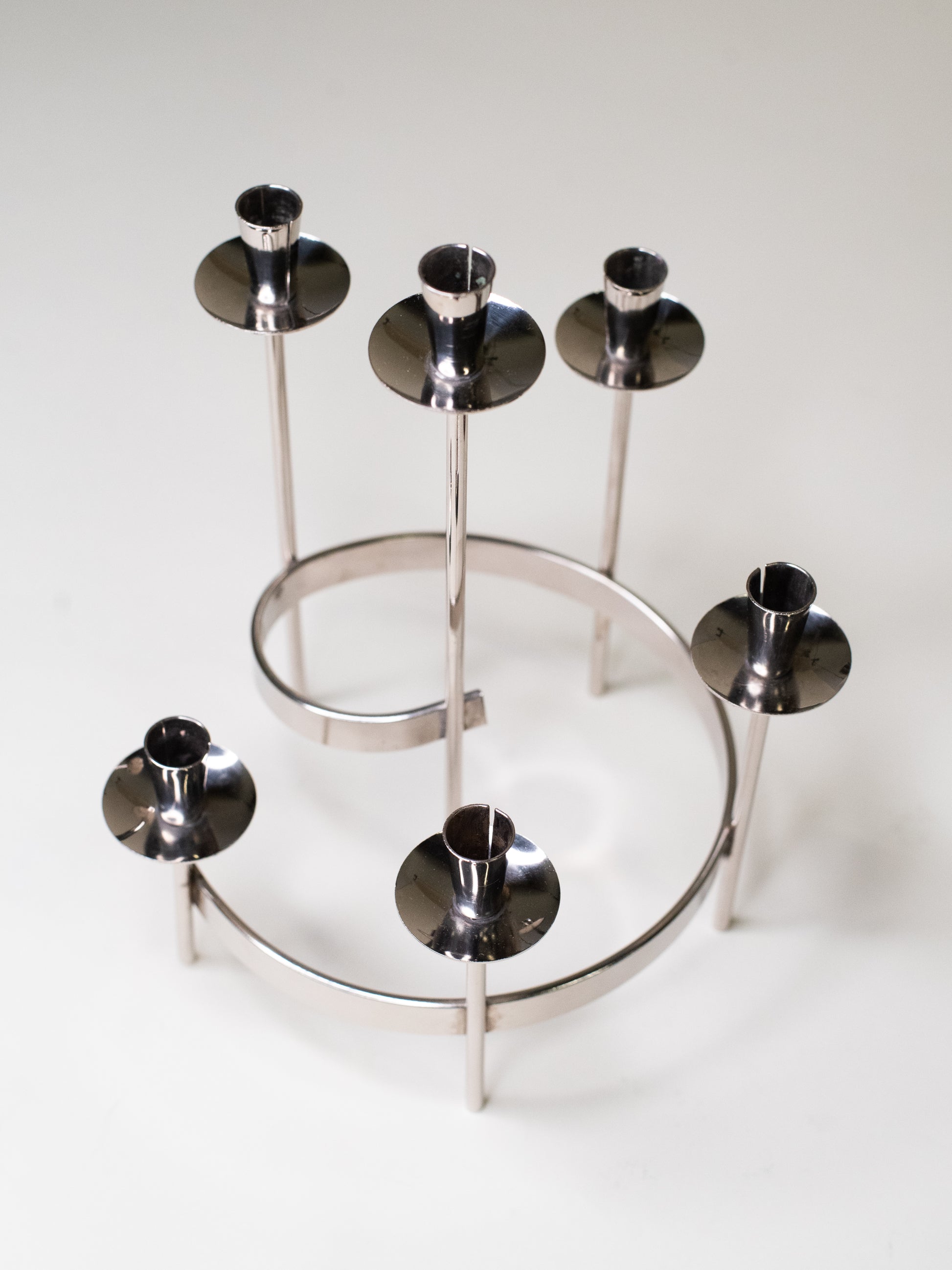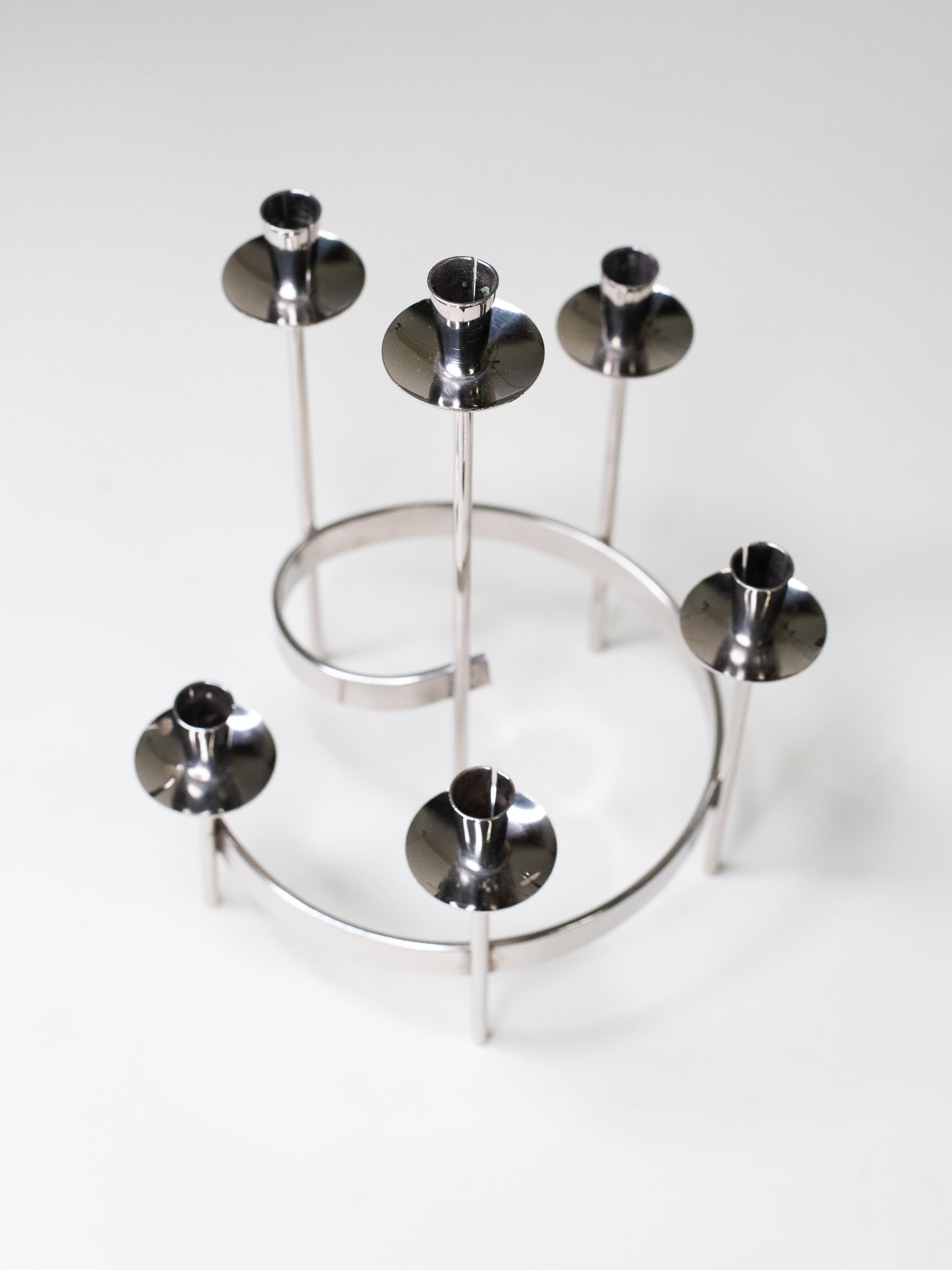 This vintage candelabra was designed by Harry N. Boström for Bo Svensk in Sweden during the mid-century era. Crafted from polished stainless steel, it’s built around a circular ring with six slender stems rising at different heights. Solid and very sturdy despite its light appearance. Clean, architectural, and confidently modern. Stamped MADE IN SWEDEN on the tallest stem.