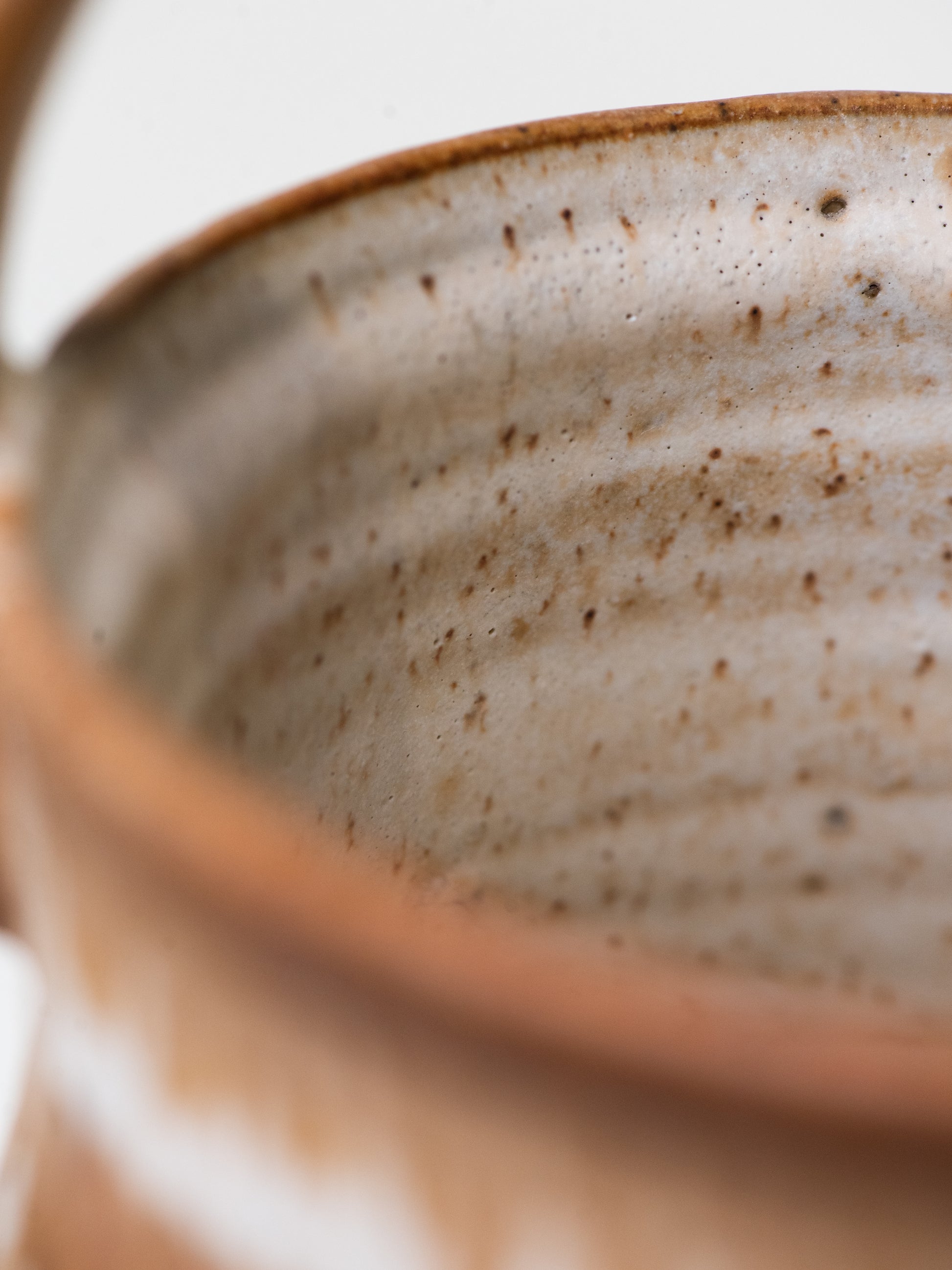 A sculptural lidded jar by Swedish ceramic artist Marie Beckman, crafted in the 1970s. The vessel combines soft modernist lines with folk-inspired detail – a rounded stoneware base left matte, and a glazed upper section in warm ochre and cream tones, finished with a hand-painted zigzag motif on the lid. The arched handle completes the form, giving the piece both function and quiet presence.