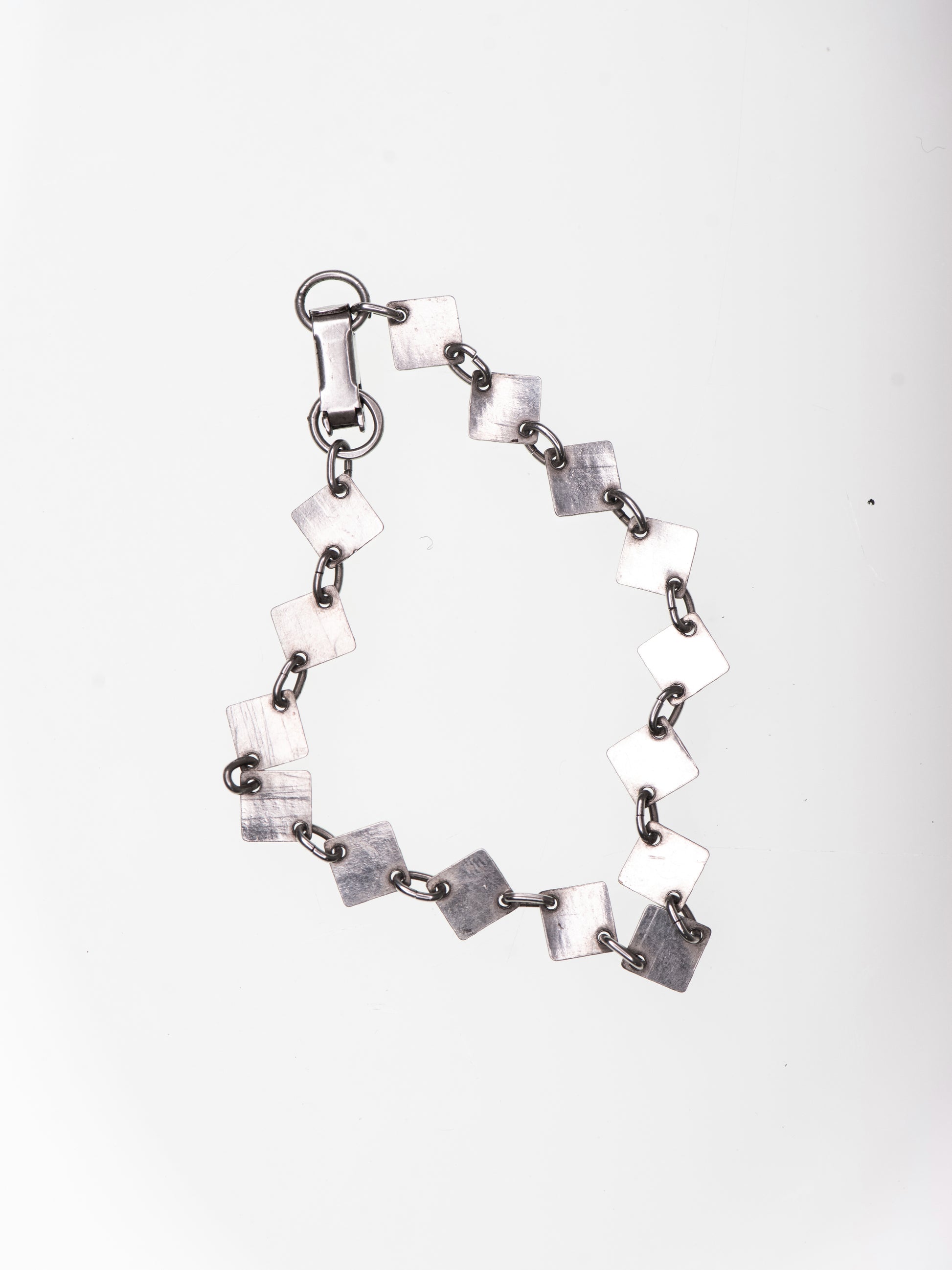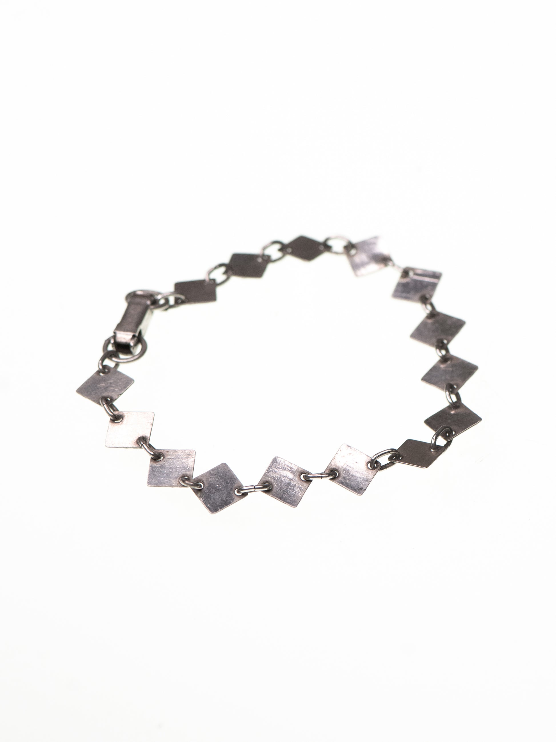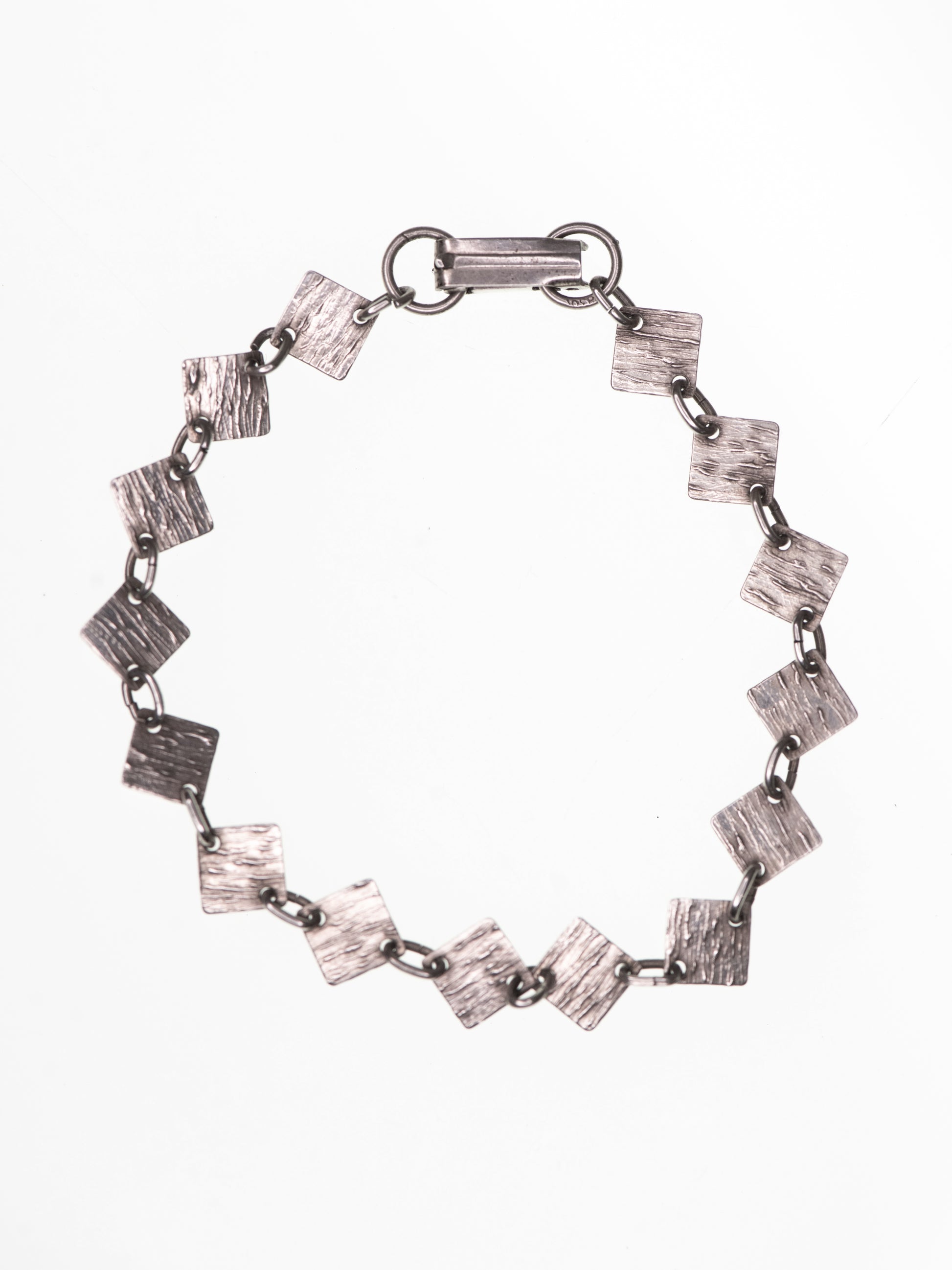 A silver bracelet by Lahden Kultakoru, Finland, built from a sequence of small square links. Each plate carries a hand-worked surface that runs across the metal like fine grain. The links are slightly angled as they connect, giving the bracelet a gentle, shifting rhythm around the wrist.
