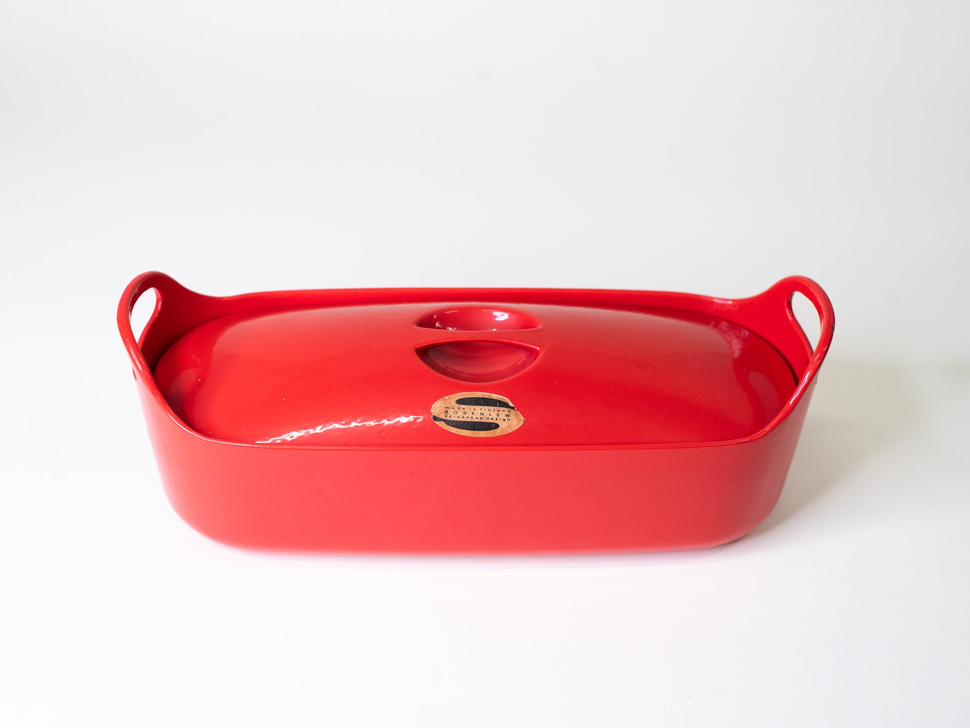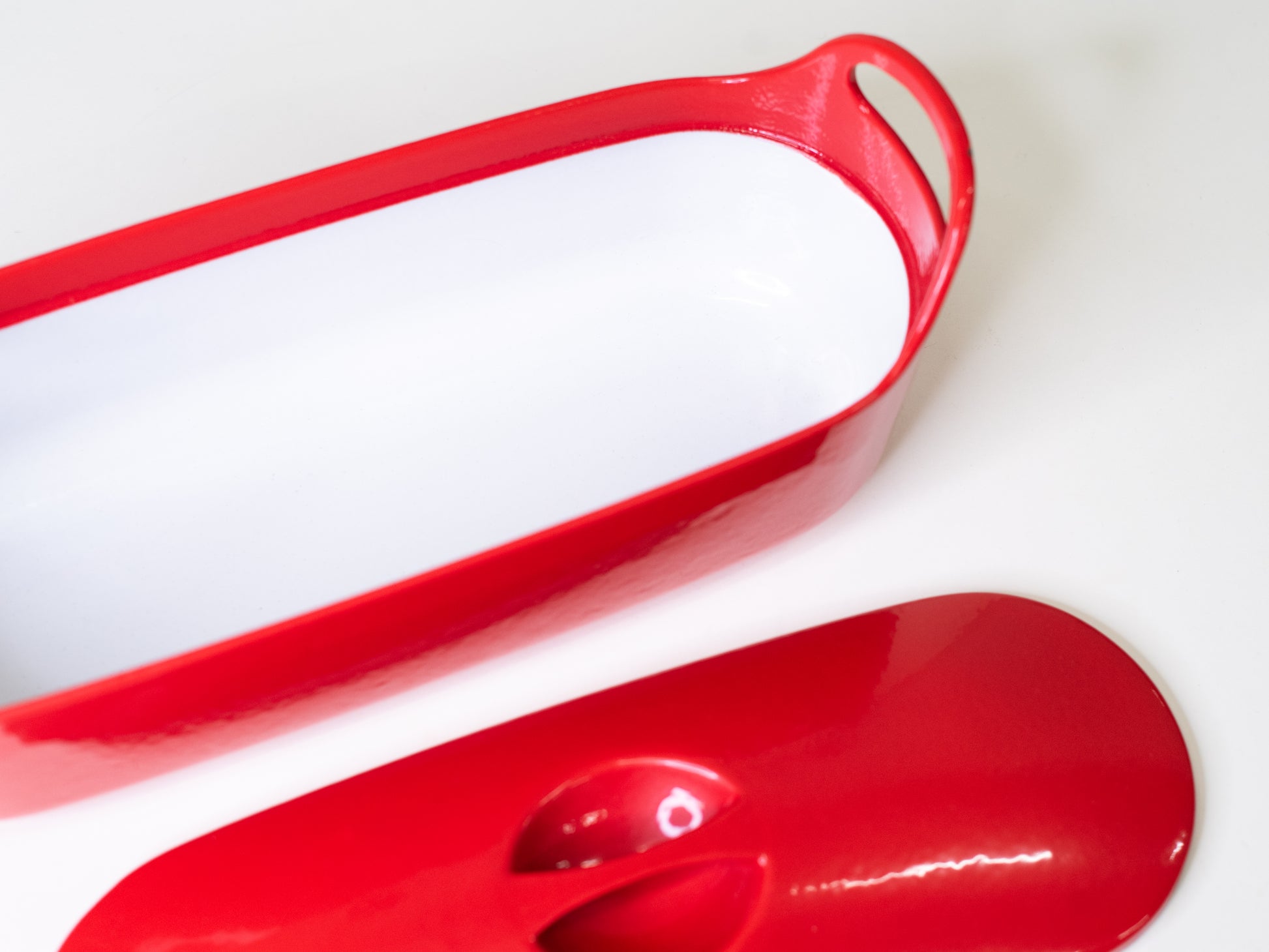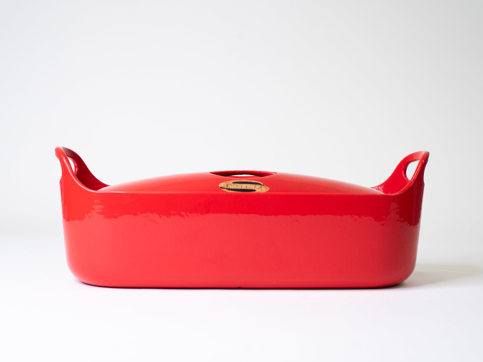 A rare cast iron fish terrine designed by Timo Sarpaneva for Rosenlew in the 1960s. Finished in vivid red enamel with a crisp white interior, the terrine combines sculptural form with functional clarity. The recessed lid grip and elegant handles are pure Sarpaneva – everyday design elevated into art.