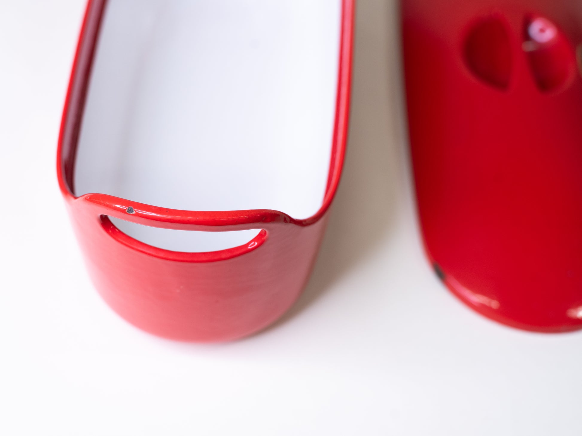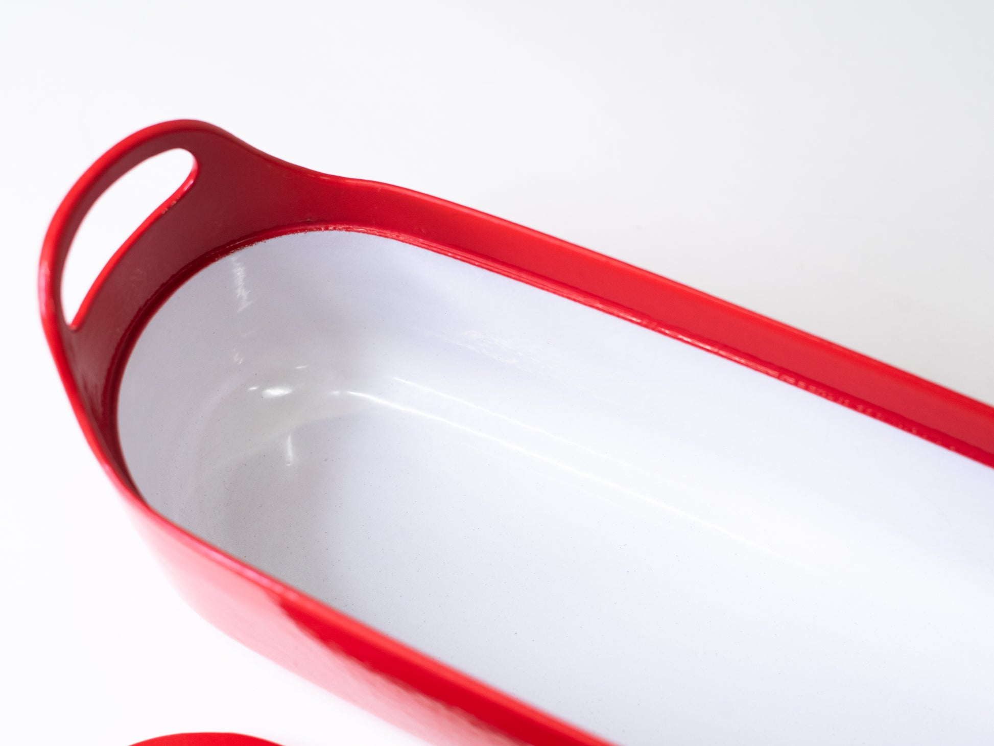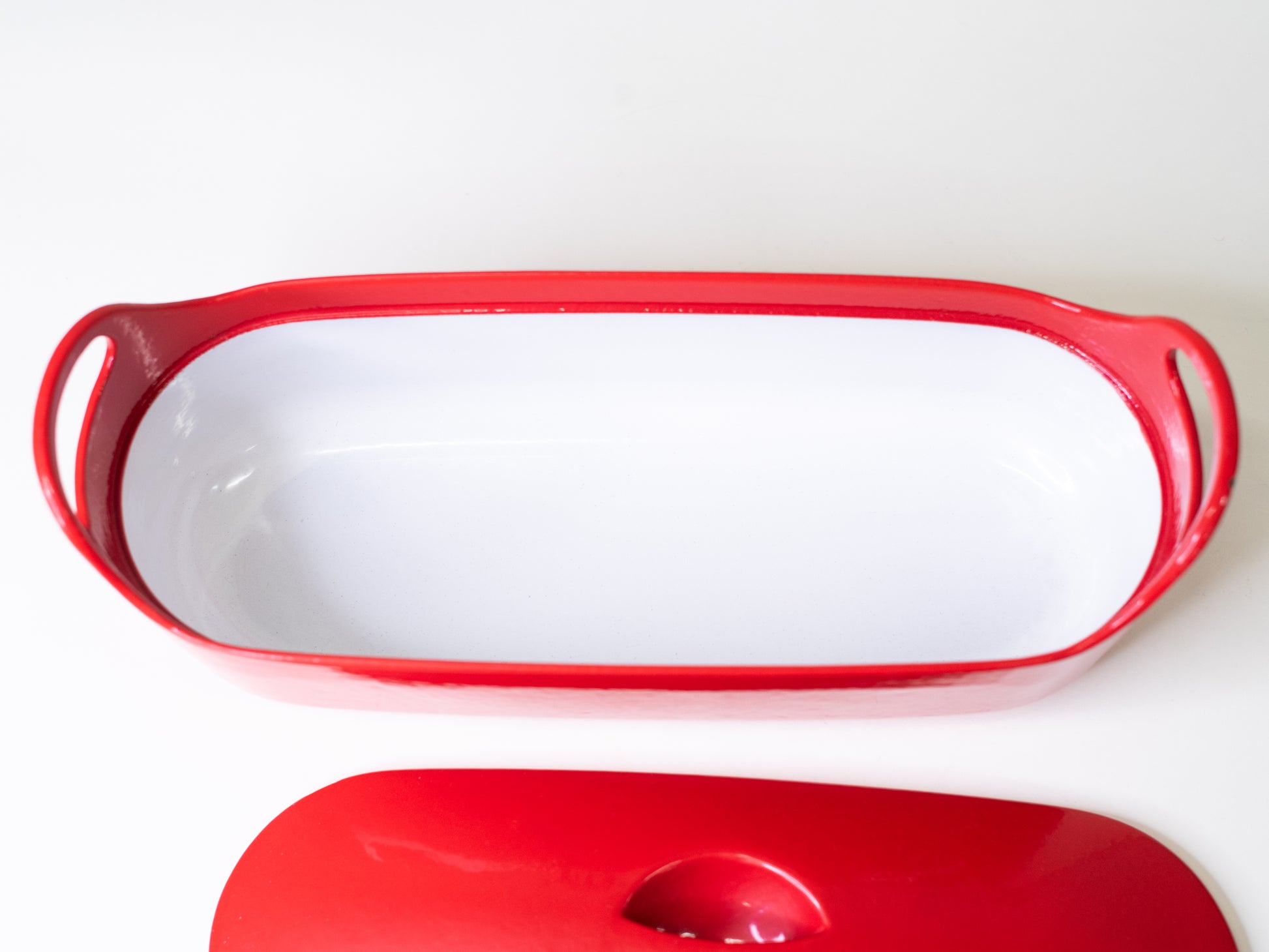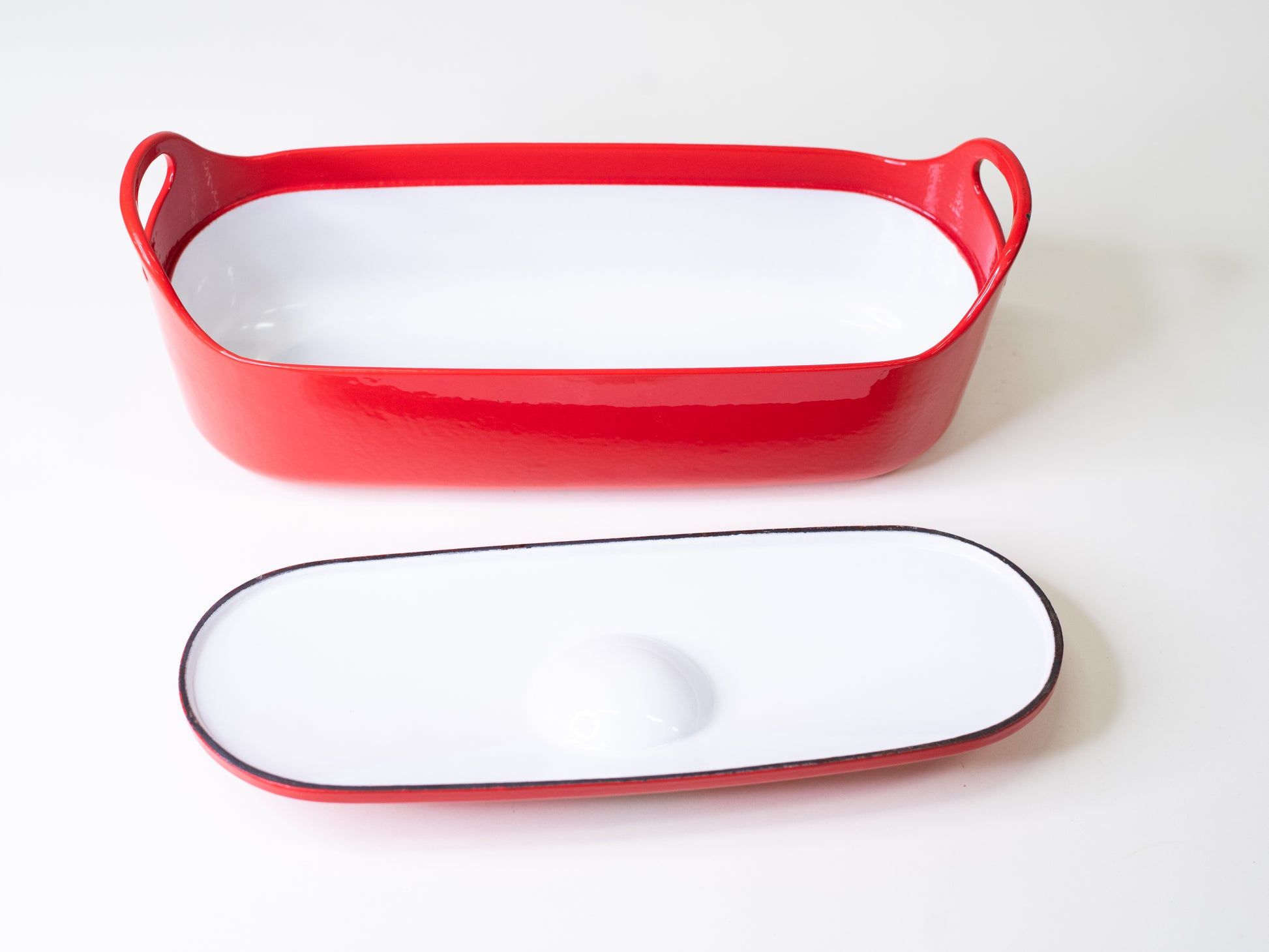 A rare cast iron fish terrine designed by Timo Sarpaneva for Rosenlew in the 1960s. Finished in vivid red enamel with a crisp white interior, the terrine combines sculptural form with functional clarity. The recessed lid grip and elegant handles are pure Sarpaneva – everyday design elevated into art.