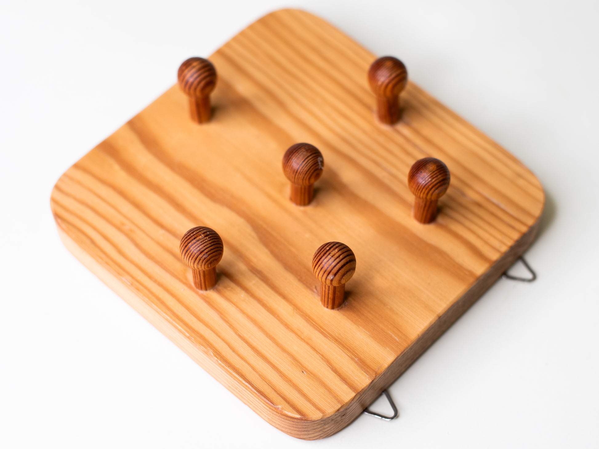 A sculptural little object by Aarikka, made of solid pine in the 1970s. The square base holds six rounded pegs, designed to keep jewelry organized in a clean, graphic way. The wood has developed a beautiful honey-toned patina, highlighting its natural grain.