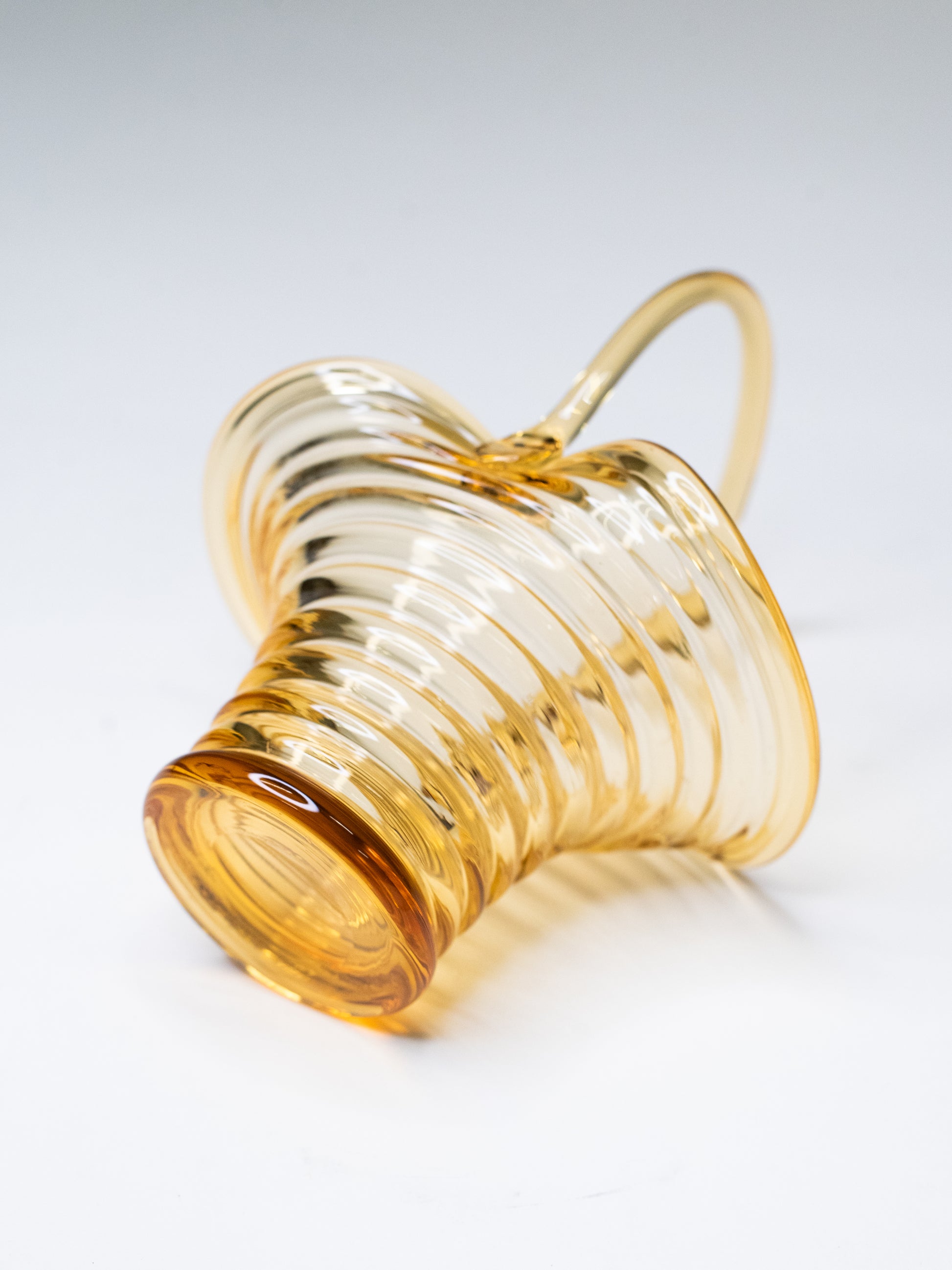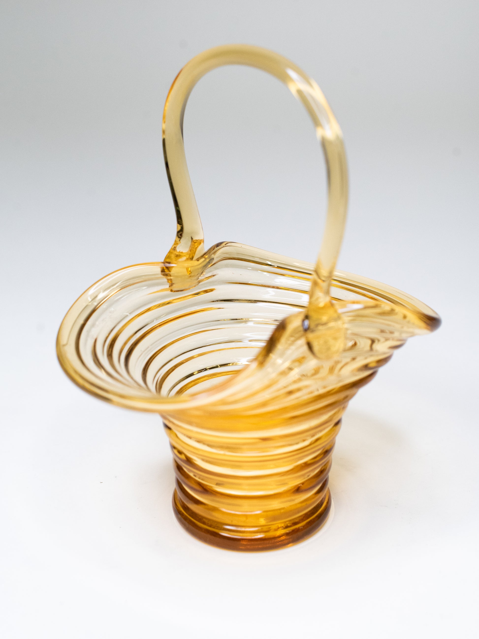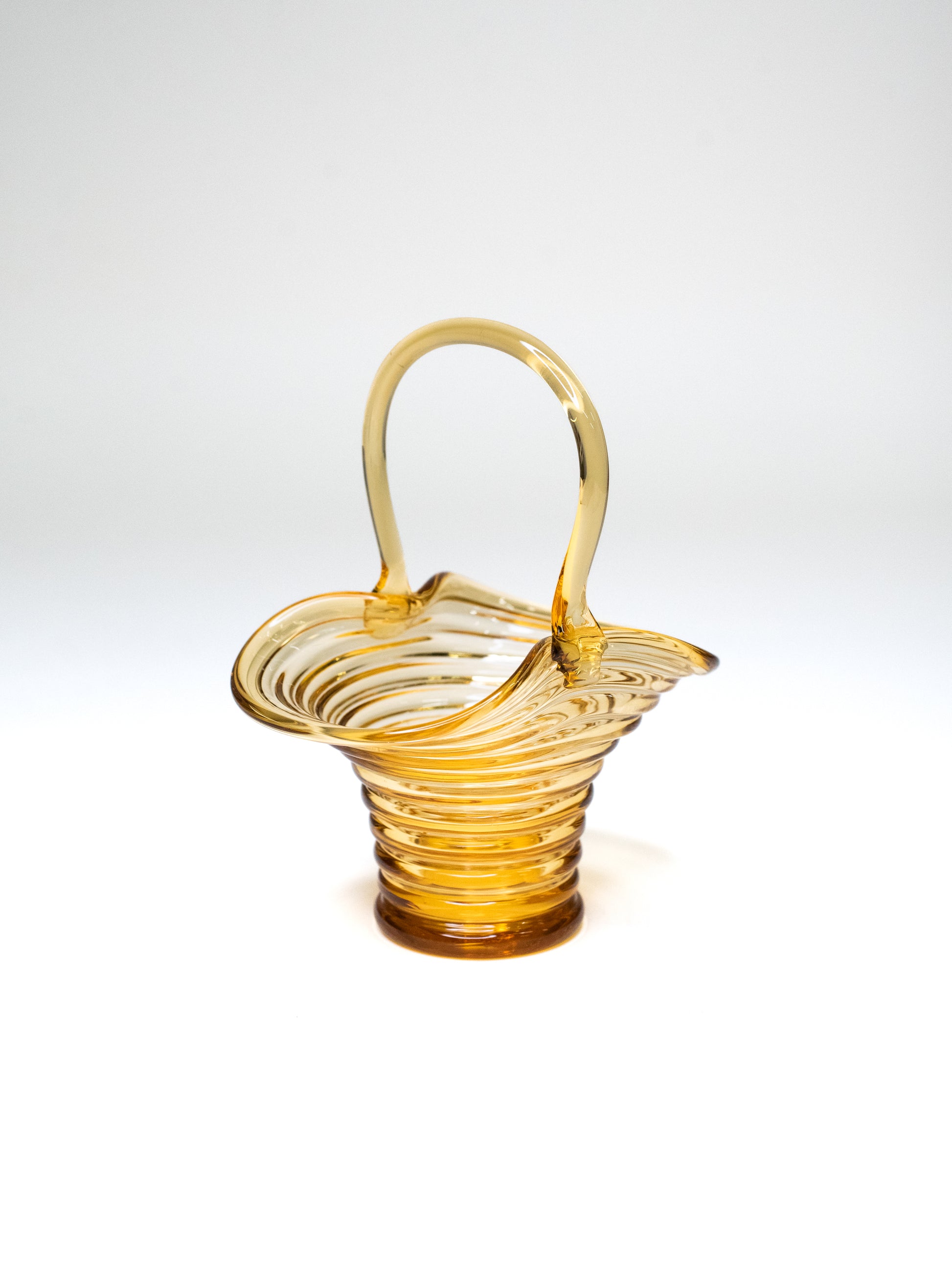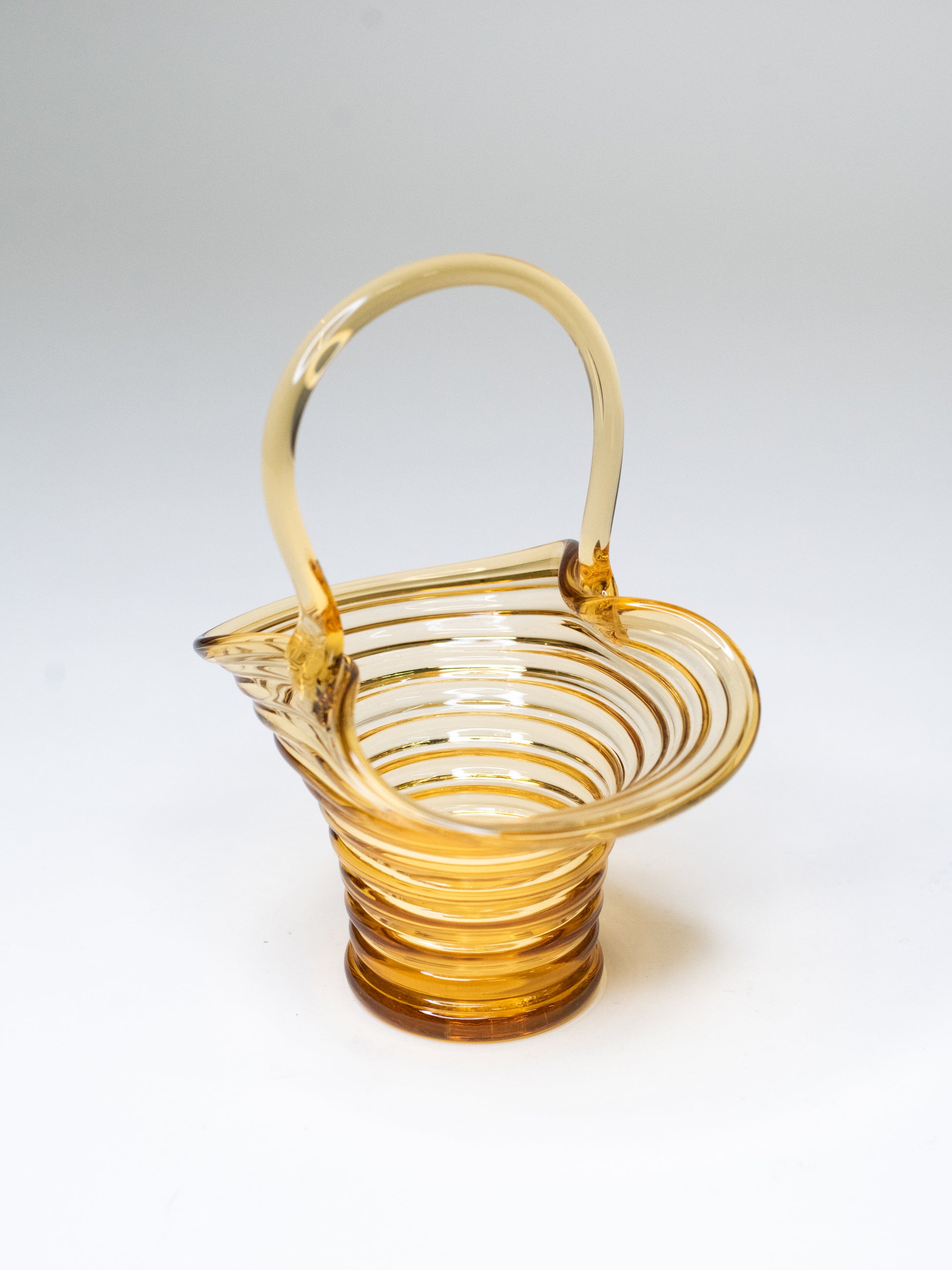 A sculptural amber glass basket by Riihimäen Lasi, with a beautifully rippled body and an elegantly pulled handle rising from the rim. The glass shifts from warm honey to deeper amber at the base.