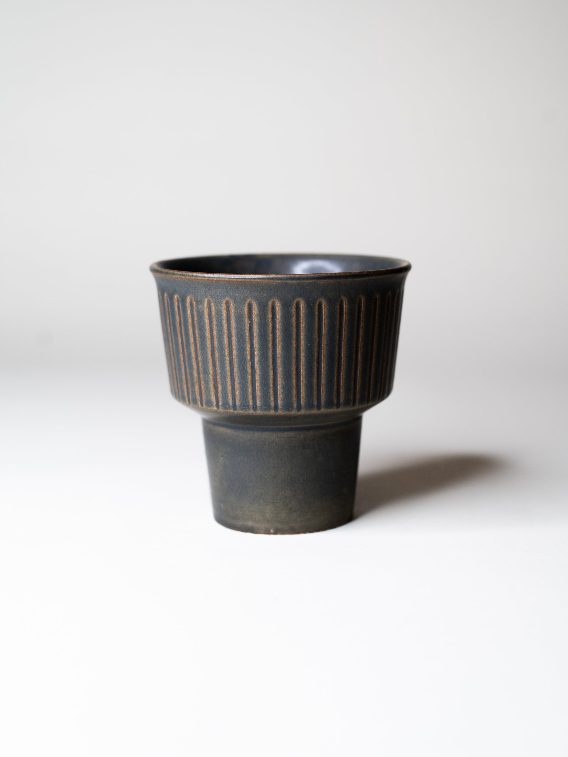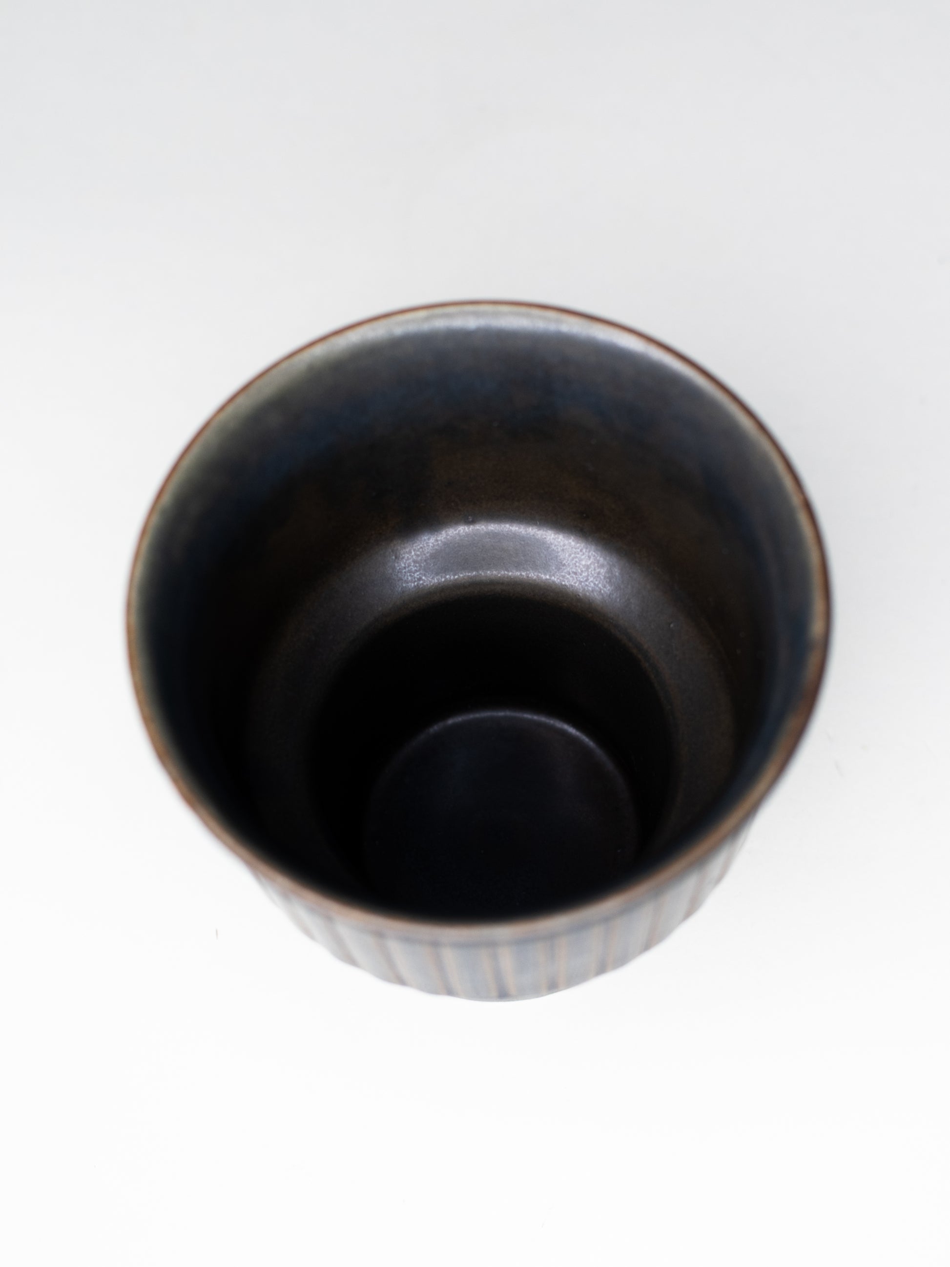 A dark-toned stoneware vase with a strong, graphic rhythm. The ribbed surface catches light softly, while the deep glaze shifts between earthy brown and muted blue. A versatile form that works equally well as a vase or as a small planter.