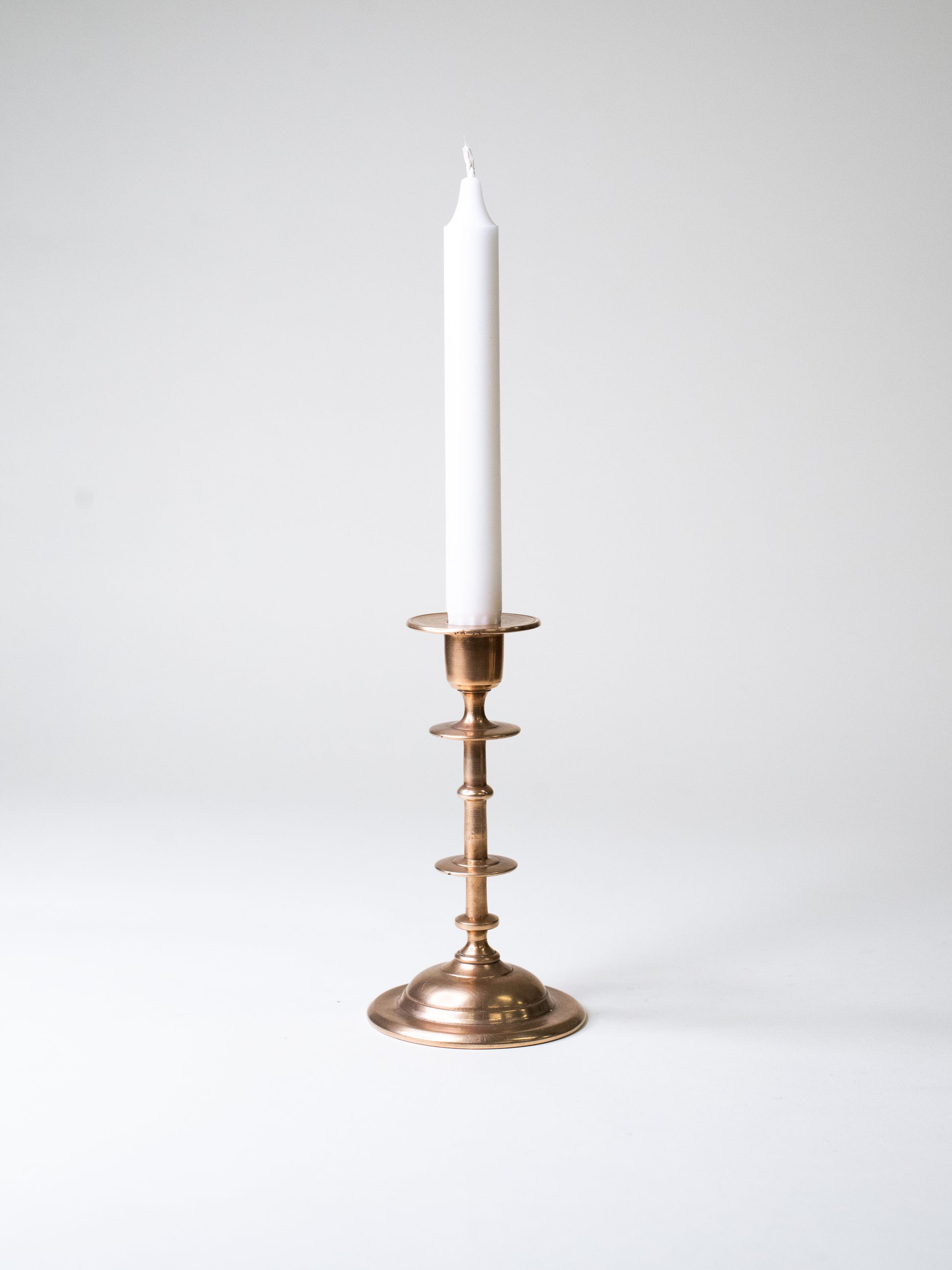 A beautifully balanced vintage brass candle holder with a classic stepped stem and a domed base that gives it a grounded, almost architectural feel. The shape has a quiet Scandinavian clarity - simple lines, good proportions, nothing extra. The brass has a soft, natural patina that adds warmth and lived-in character.