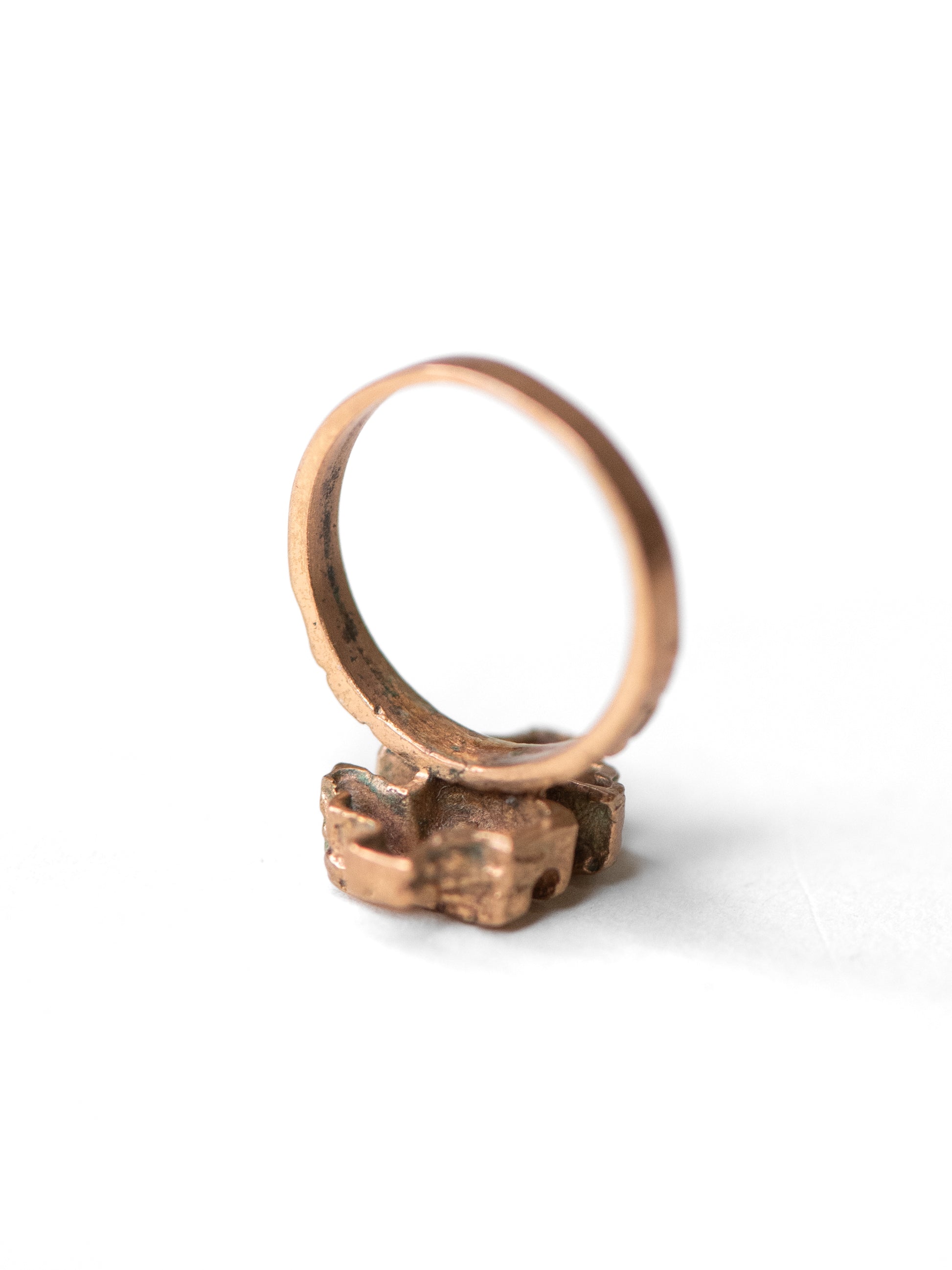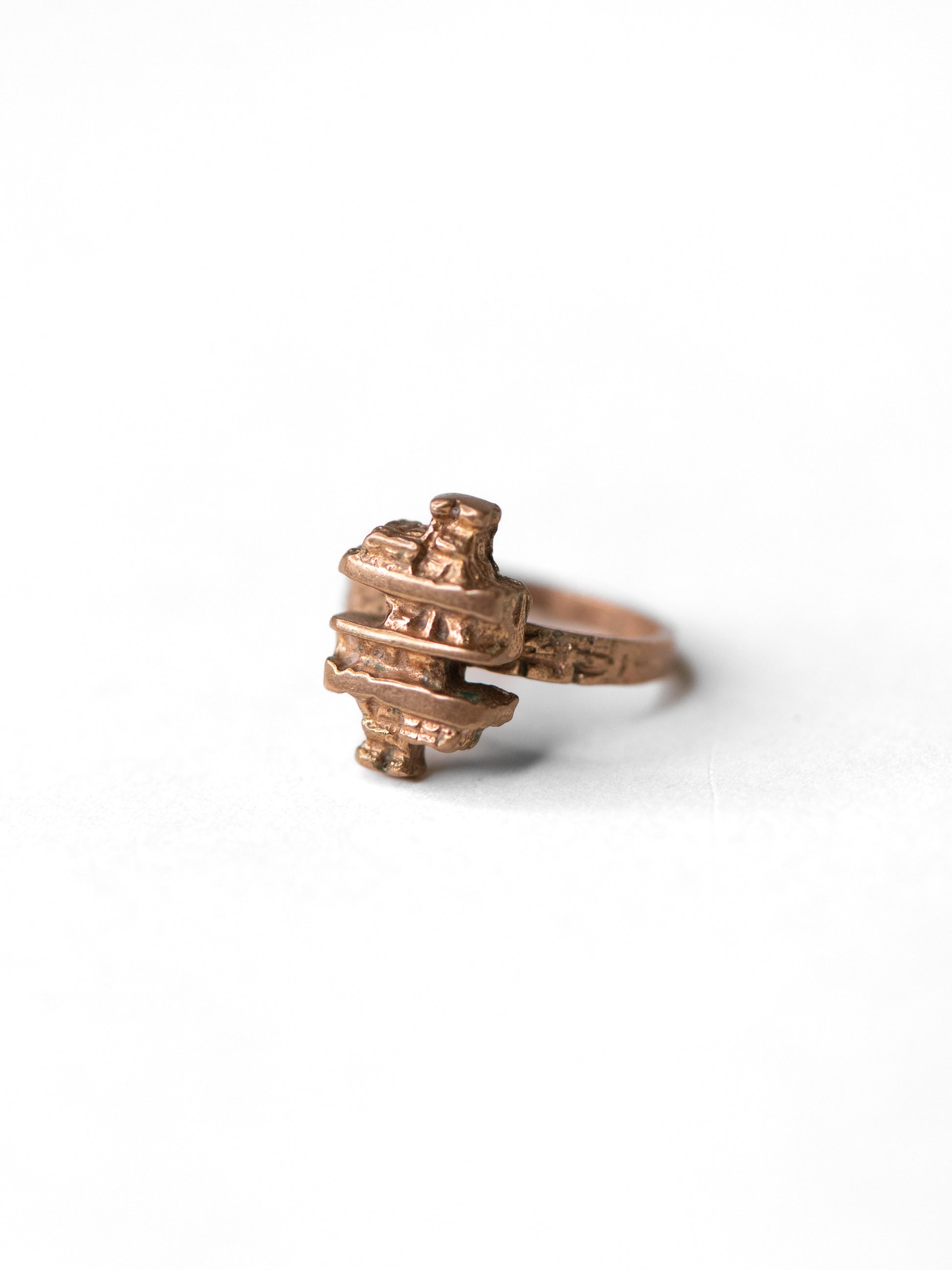 A beautifully crafted bronze ring with a small, stacked relief form. The bronze carries a warm, golden tone with natural darkening in the recesses and small marks from decades of wear - part of its character. Small in scale, strong in presence.