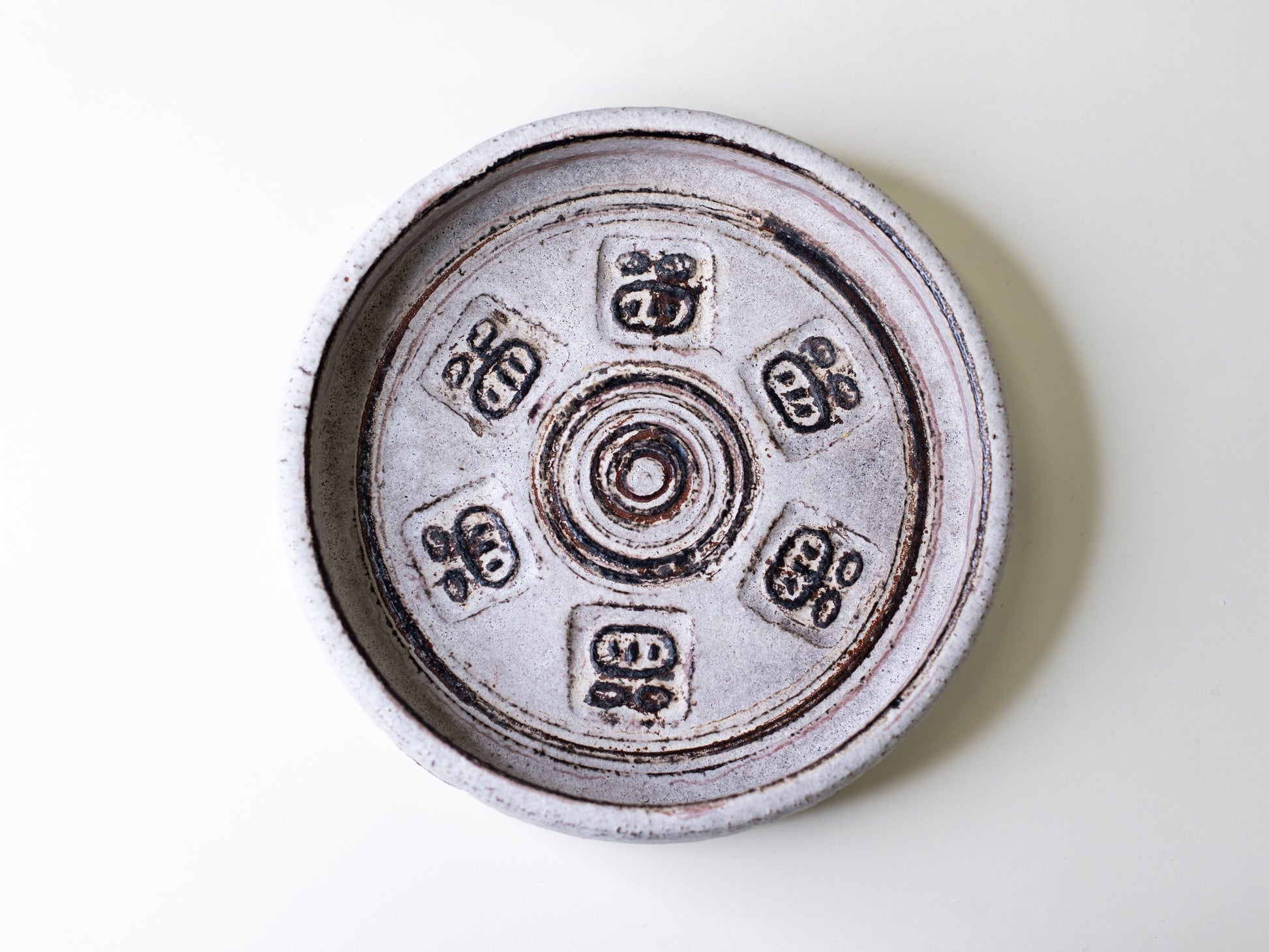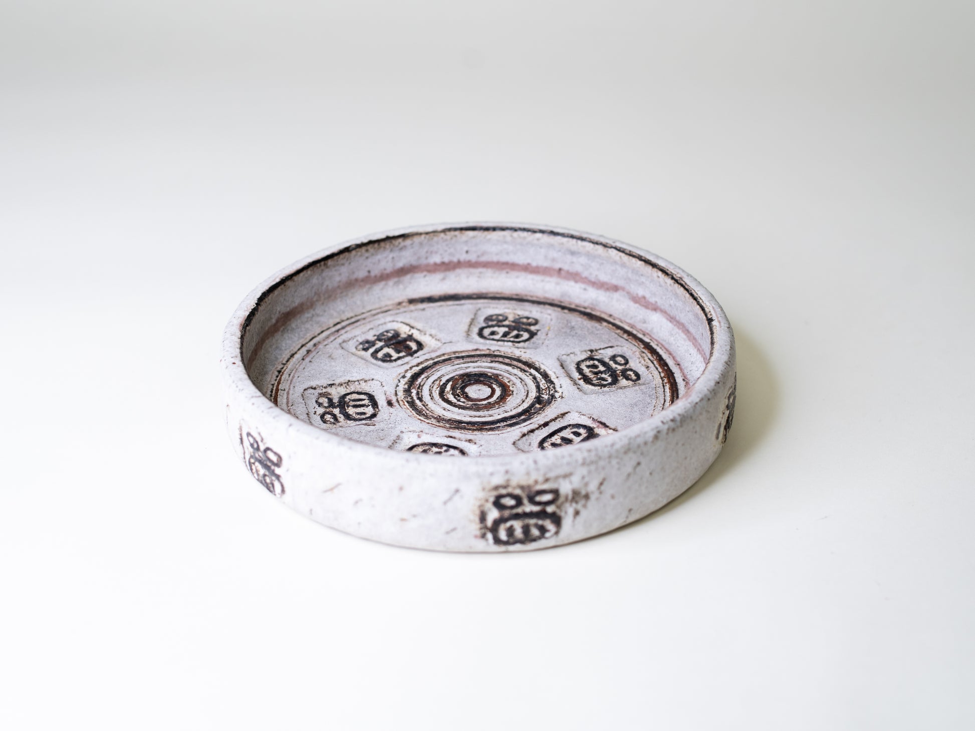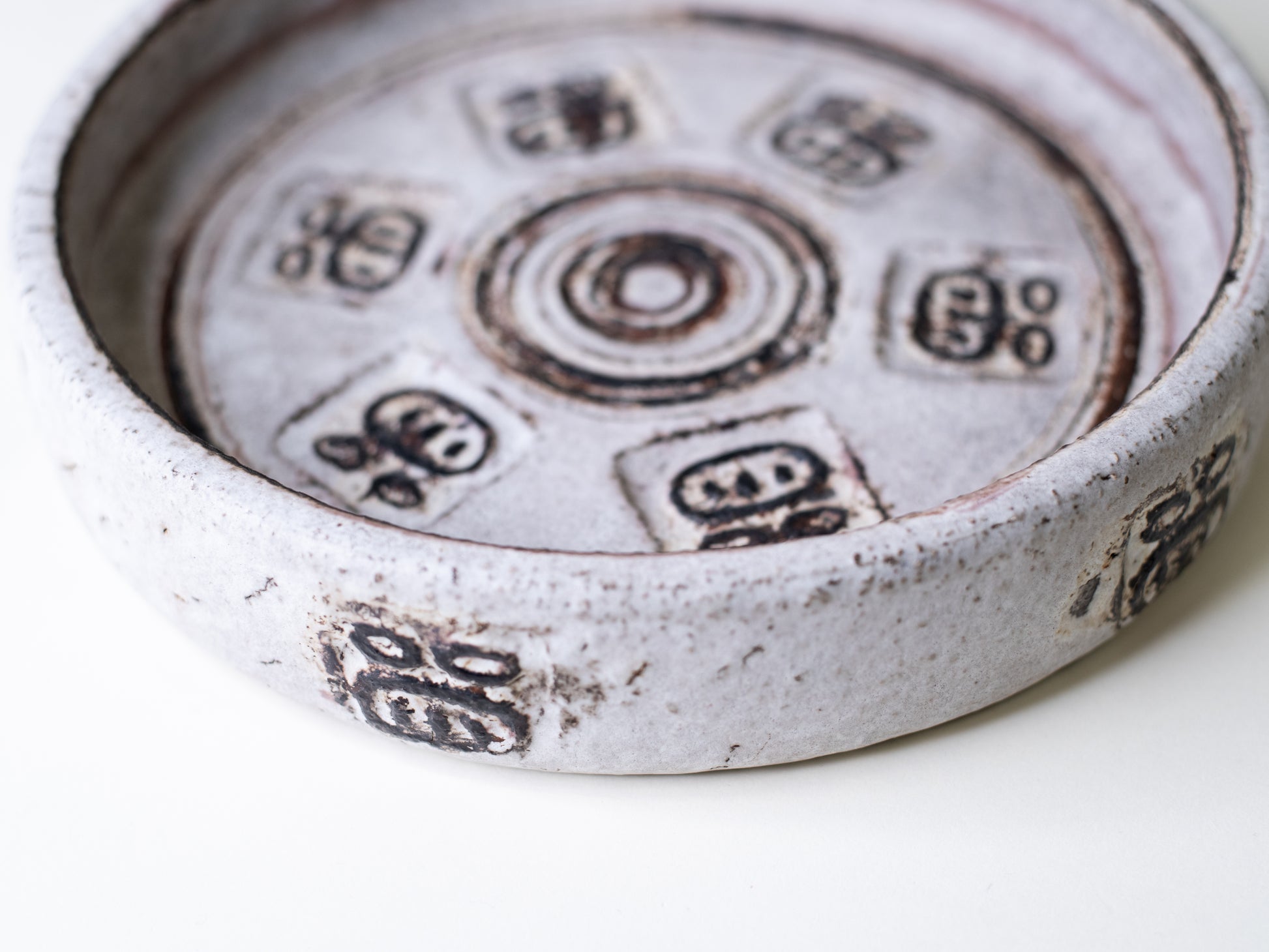 A heavy, hand-thrown ceramic bowl with a raw and brutalist edge. The pale, textured glaze is punctuated by dark, almost primitive stamped motifs, giving the piece both rhythm and presence. The finish is intentionally rough, which only adds to its character.