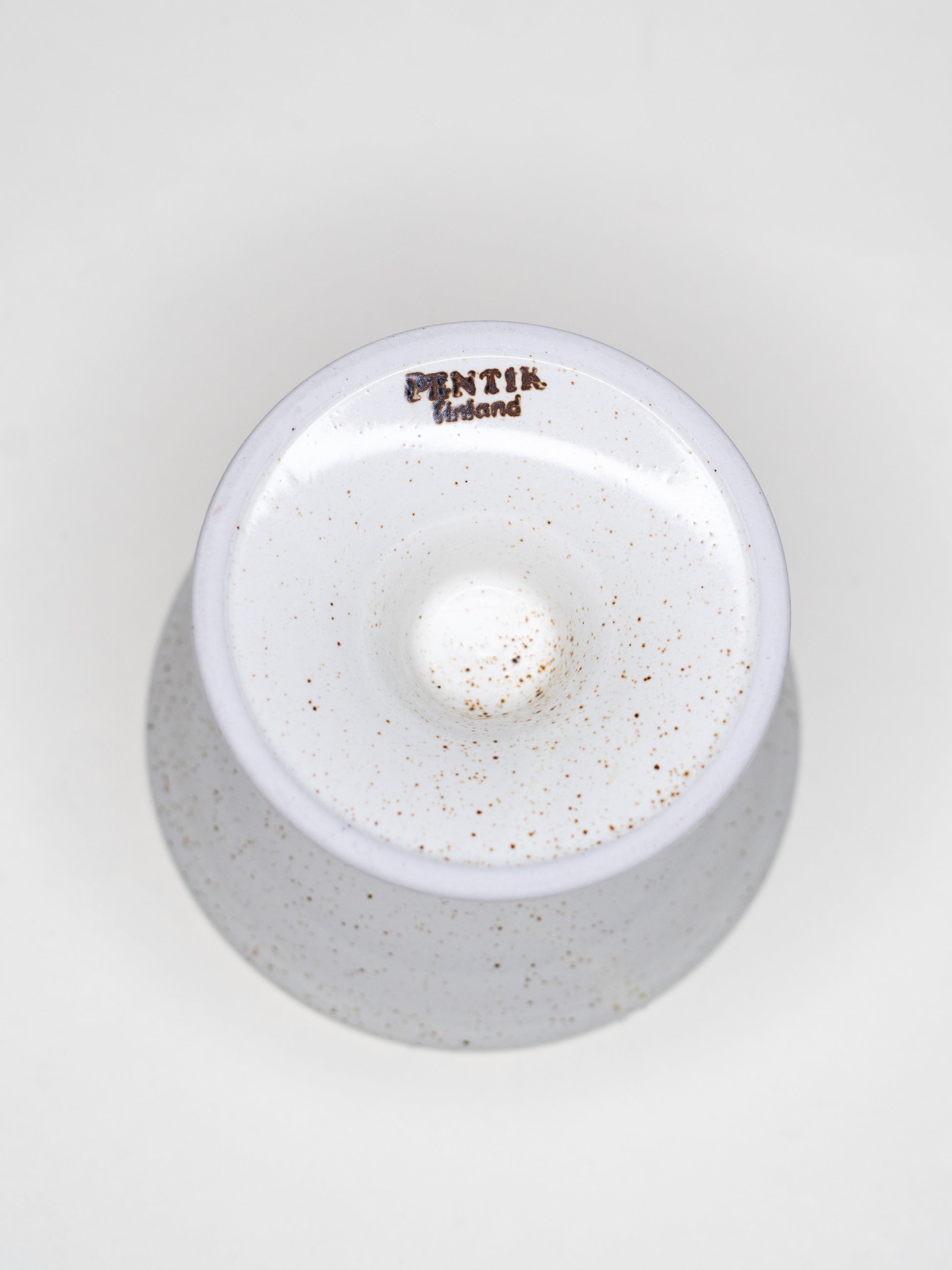 Handmade in Posio in the 1970s, this Pentik candle holder features a soft white glaze with fine brown speckles - the same glaze seen in early Halla and Riekko series. The flared pedestal form gives it a balanced, modernist look, while the hand-thrown texture keeps it grounded in Pentik’s craft roots. Stamped on the base with the original Pentik logo.