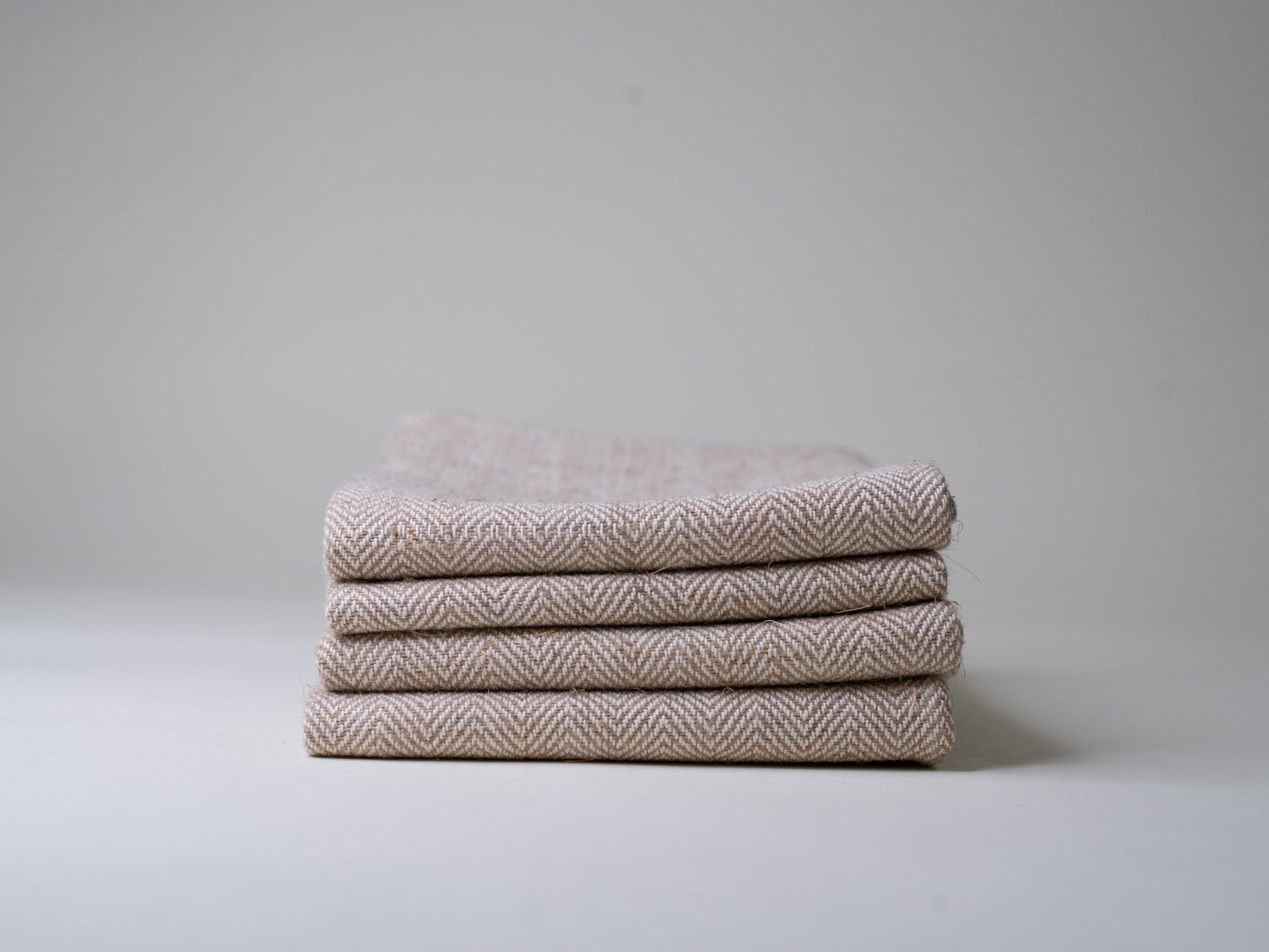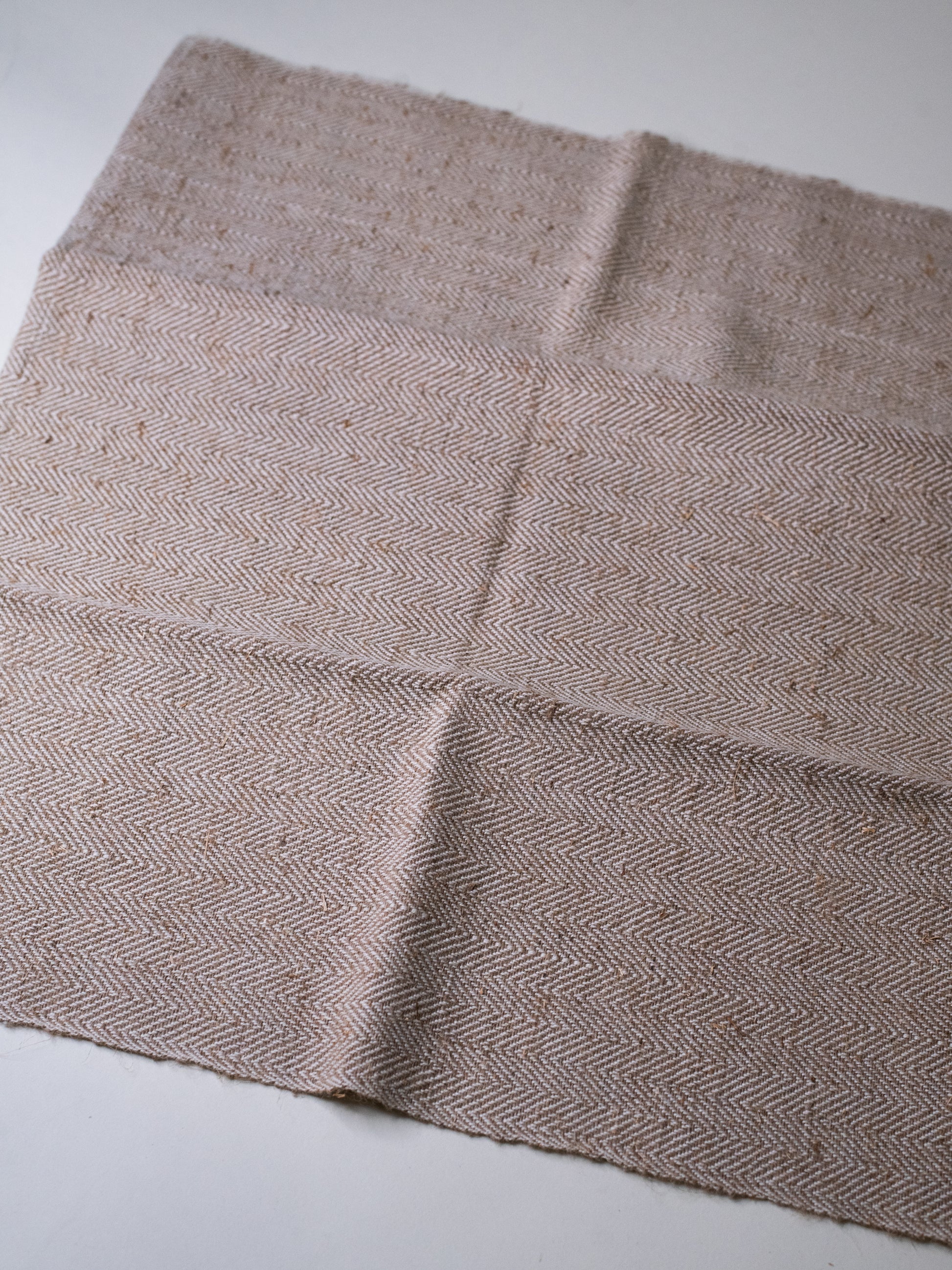 A set of handmade linen towels woven in a soft herringbone pattern. Made of traditional rohdinpellava: a coarse, raw Finnish linen spun from the tougher outer fibres of flax. The texture is naturally rough at first, but that’s part of the charm: it softens and relaxes beautifully with use and washing, just as good linen should.